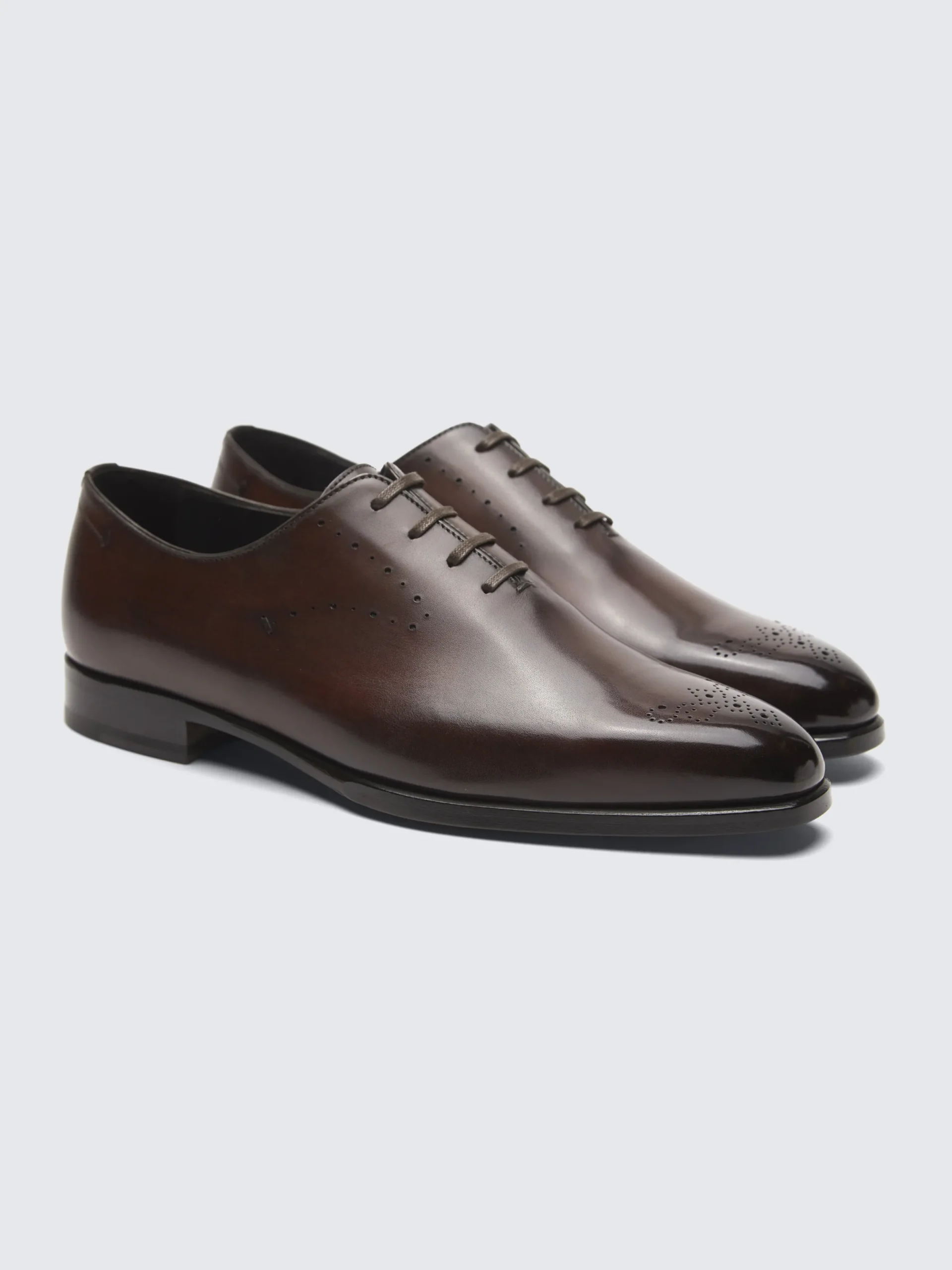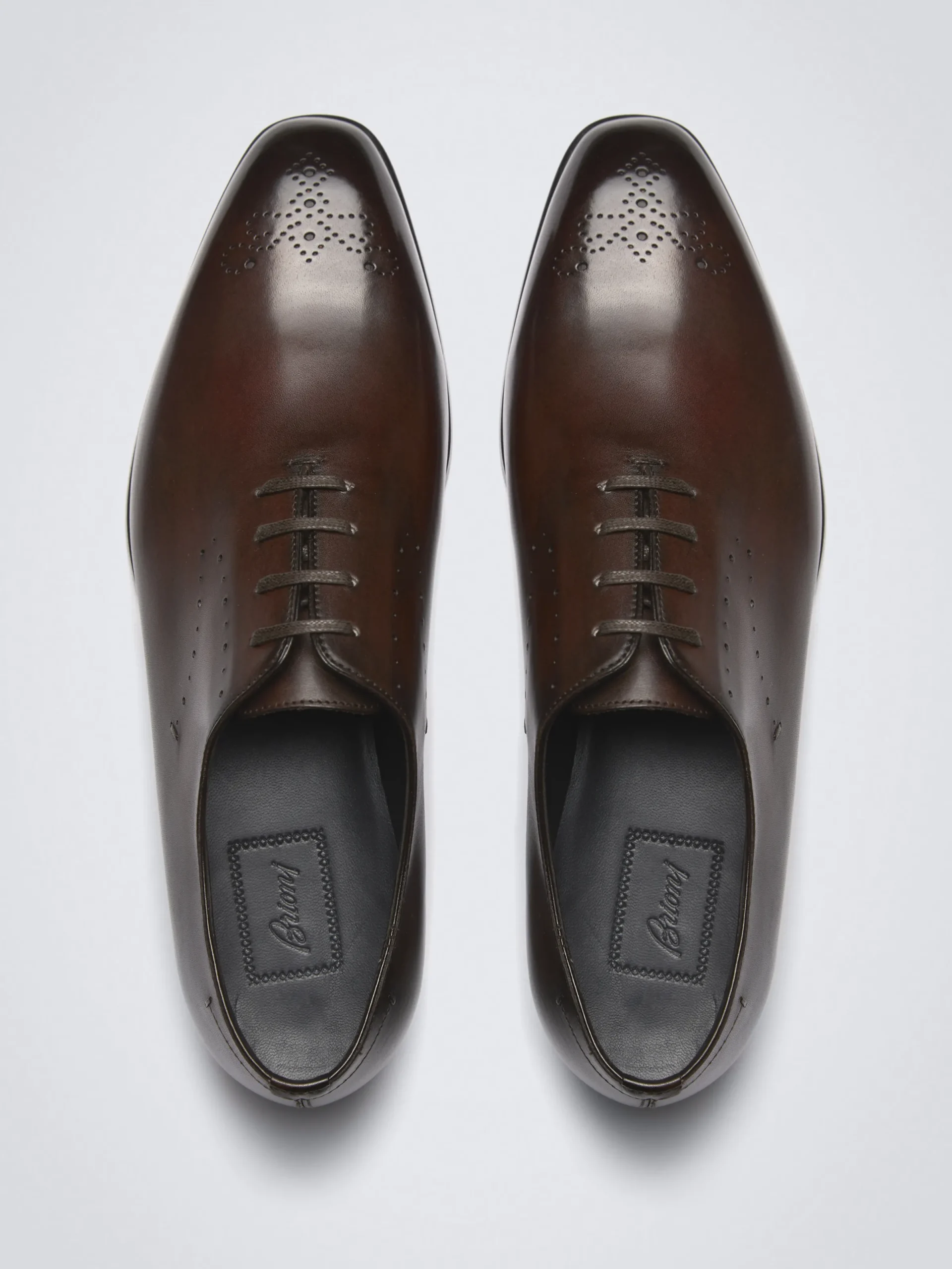 Brown calf leather Elysium oxford shoes, featuring a hand painted upper made of a single piece of calfskin and a perforated medallion design on the toe. The elegant tapered shape and clean lines make this item the ideal choice for your formal attires