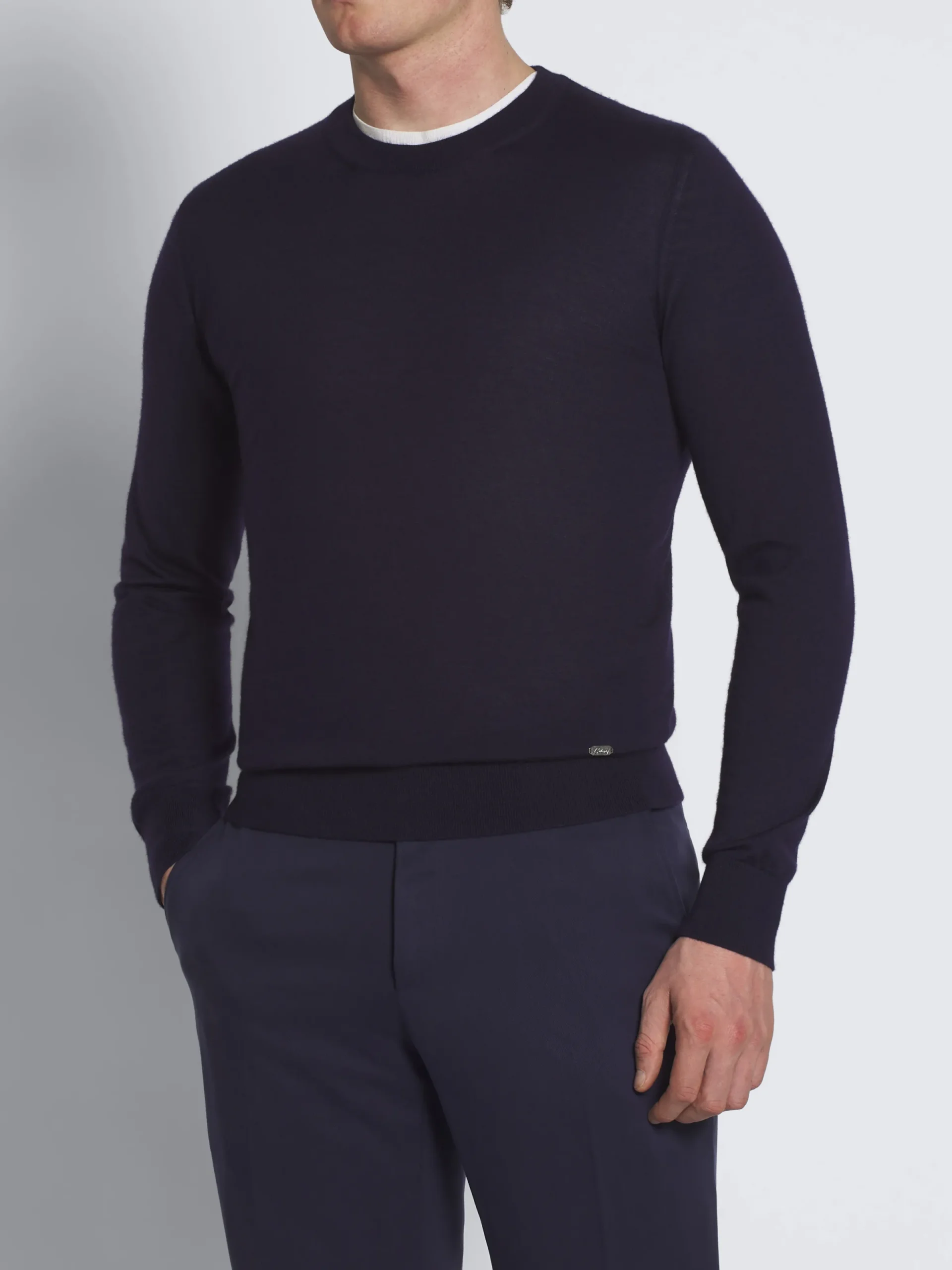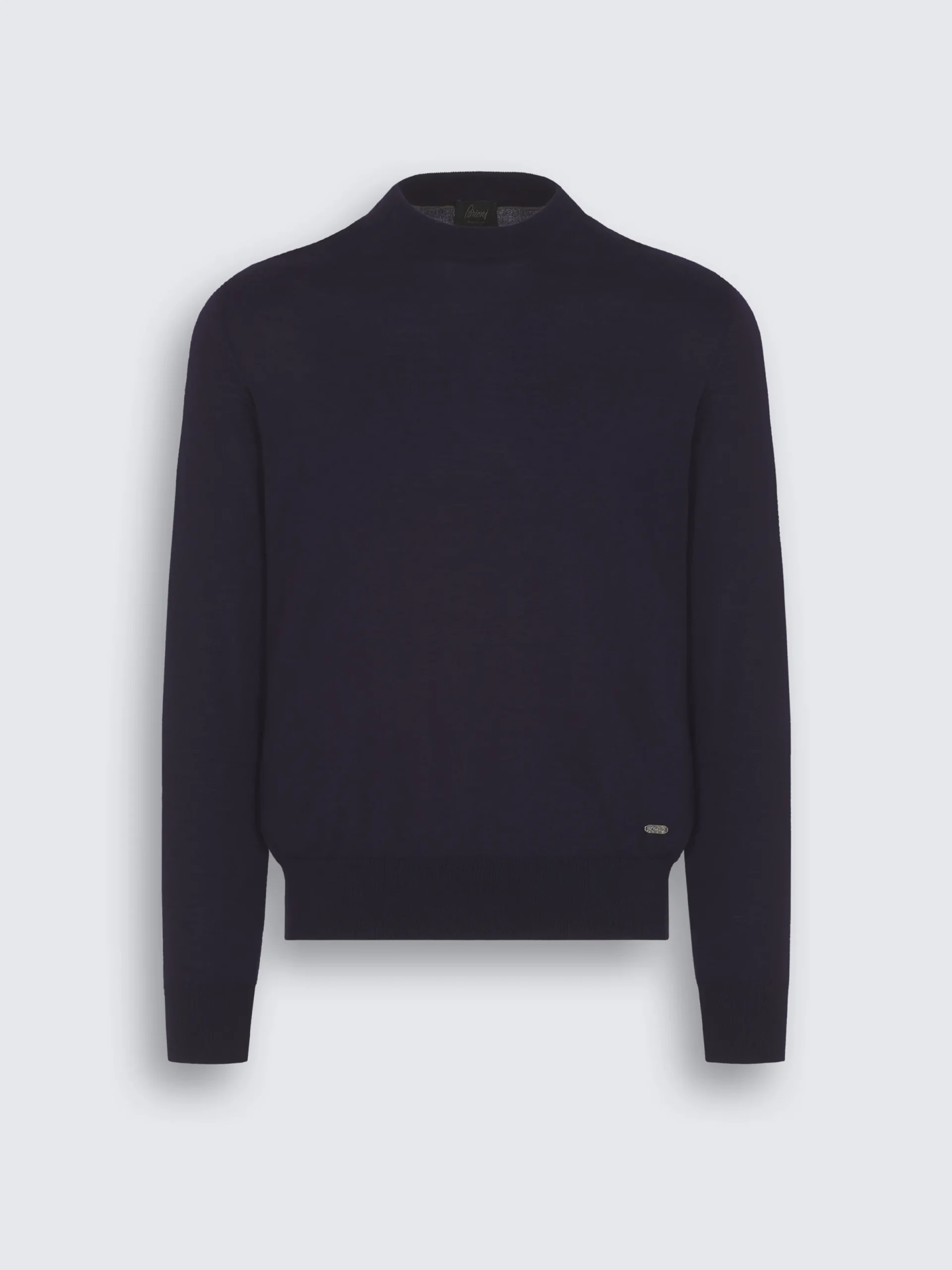 Navy blue cashmere and silk crewneck sweater. Featuring a regular fit, branded metal detail on the bottom, inside piping on collar, and light ribs effect on collar, hem, and cuffs. Exceptional softness and comfort define this piece, ideal for leisure days looks.