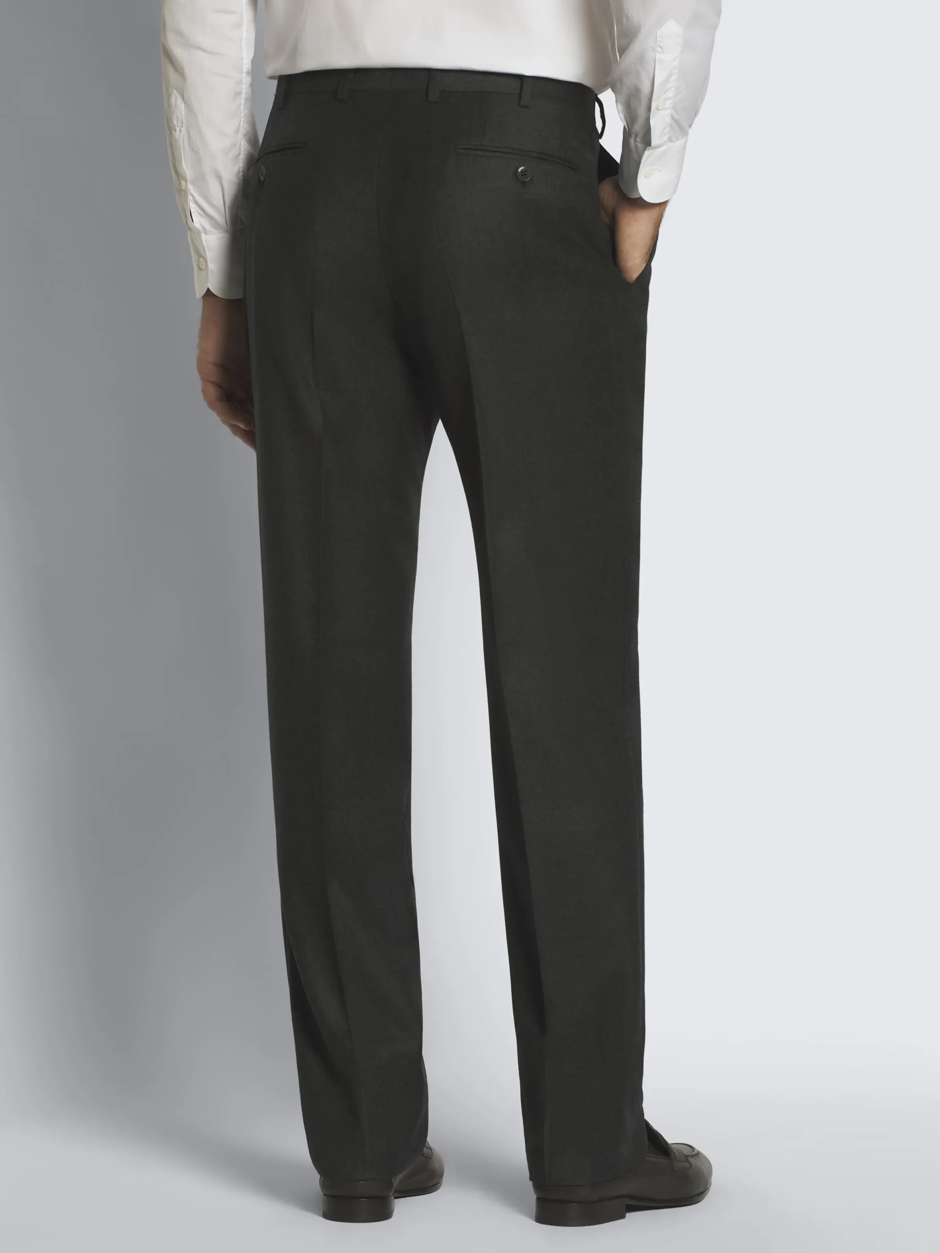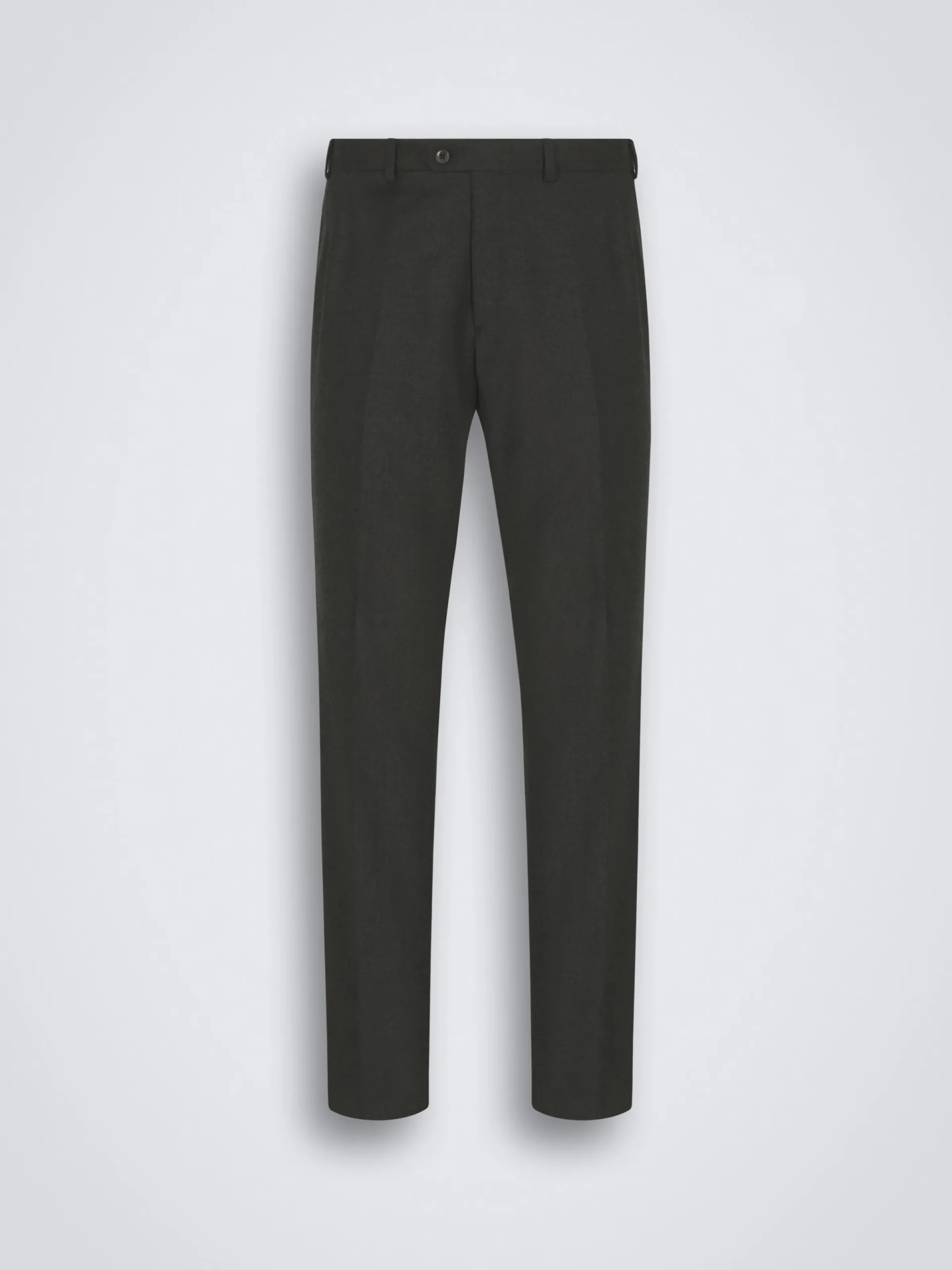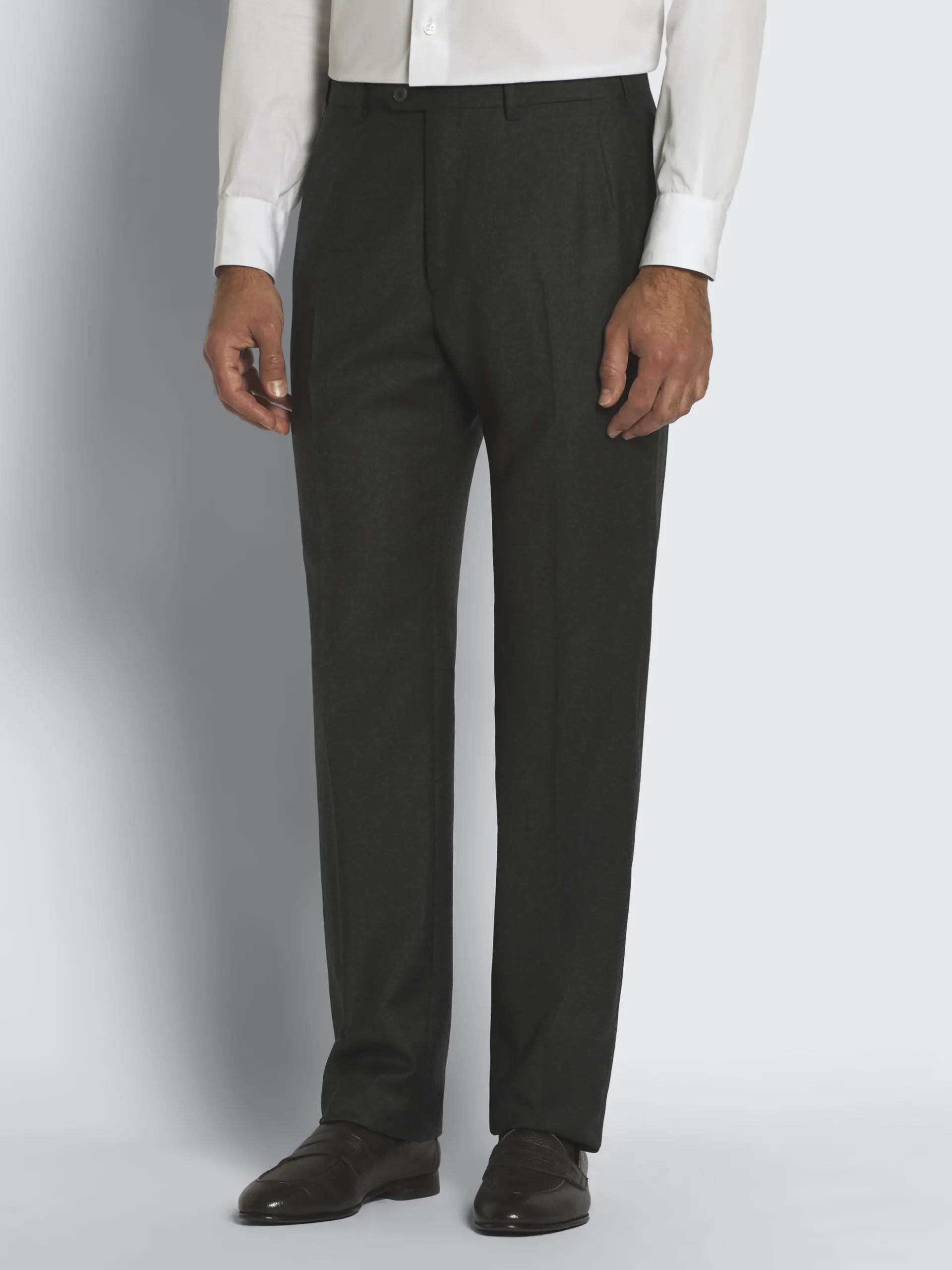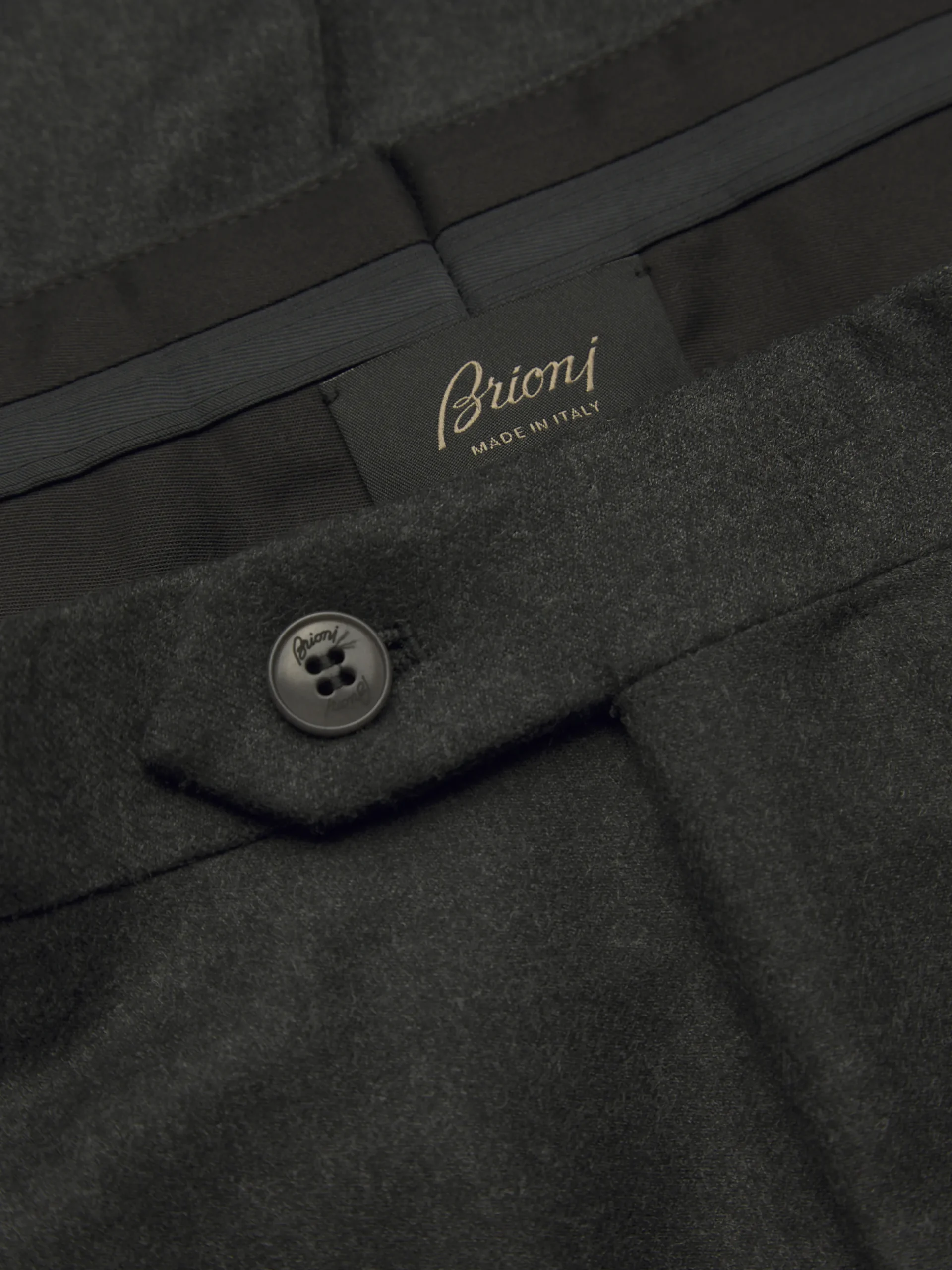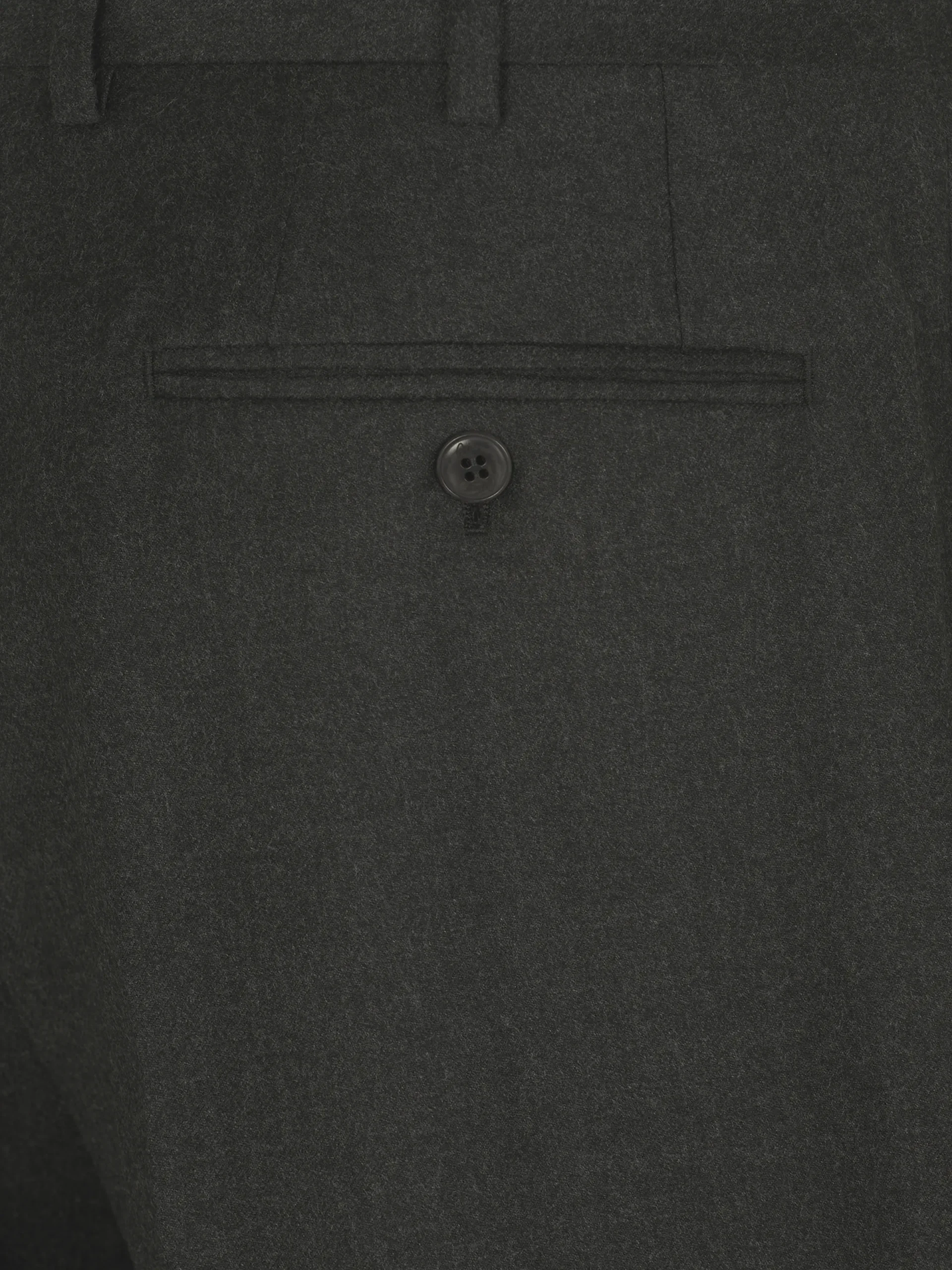 Charcoal grey flannel wool Tigullio trousers. Featuring a regular fit, two side pockets, two back jet pockets with button closure and belt loops. Ultra-versatile, these trousers are perfect paired with derbies, loafers or even a sneaker for an effortlessly refined aesthetic.