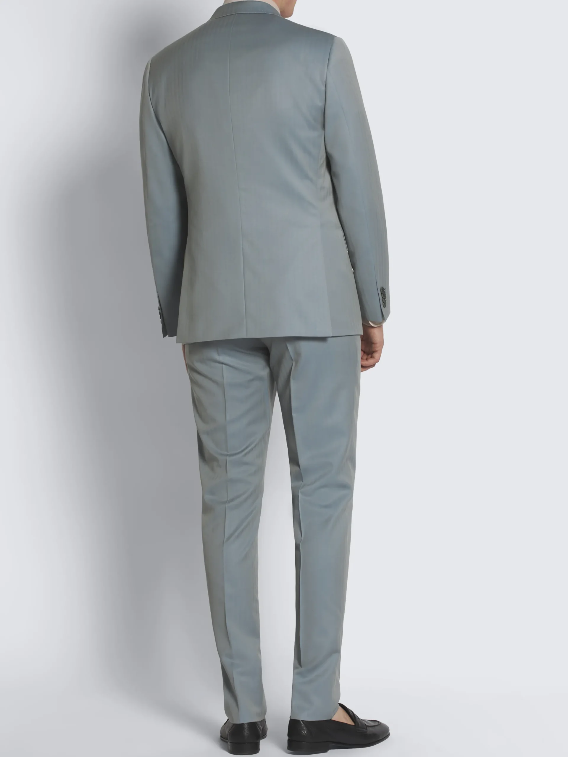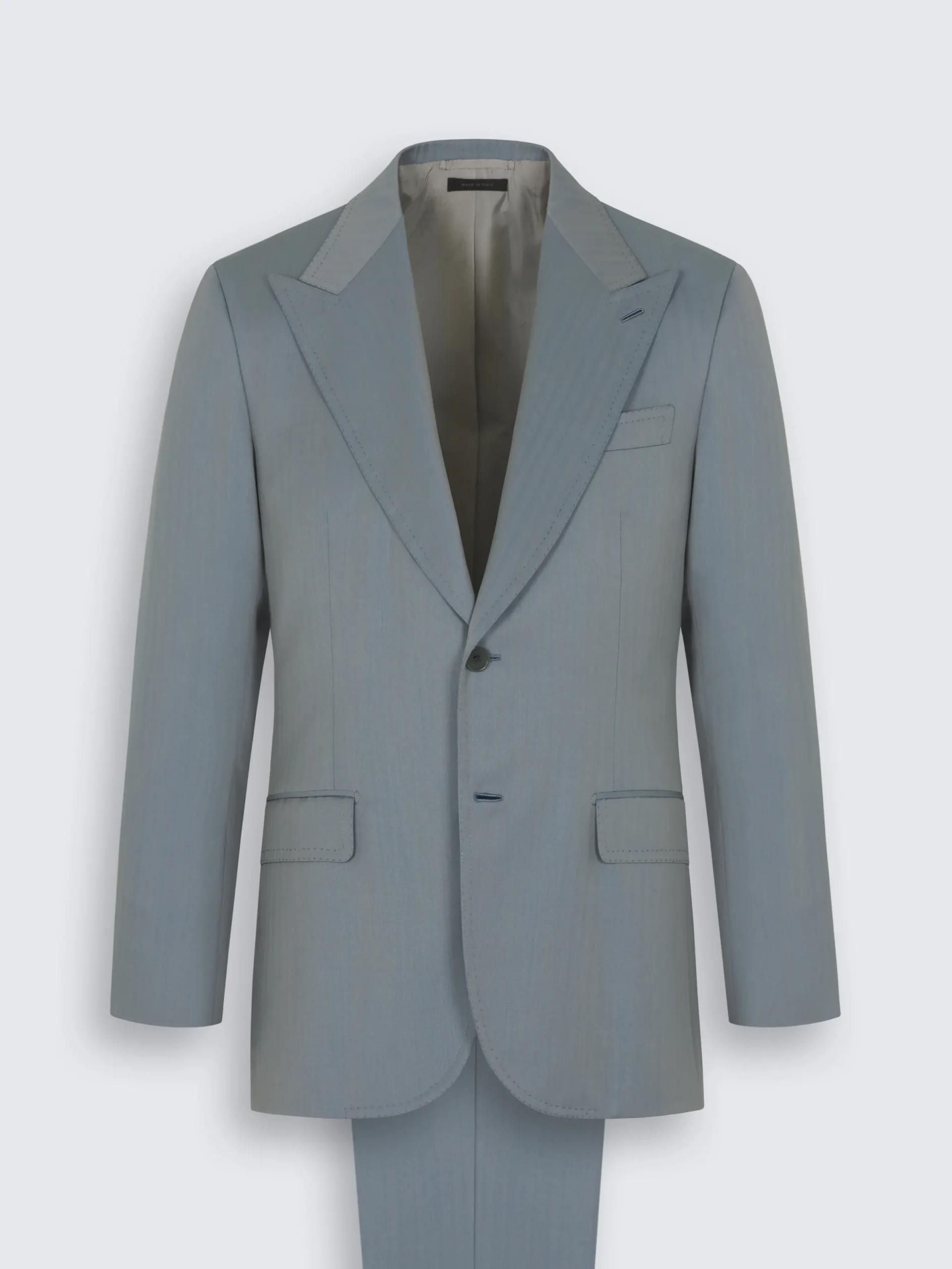 Light blue herringbone wool Amalfi suit. Fully lined, the jacket features a regular fit with a very light construction, peak lapels, two back vents with blocking strap and two flap pockets. The sartorial details of this jacket showcase Brioni’s expertise at its finest: the shoulder pad without sleeve head roll that creates the slight shirring on the sleeve cap, one “barchetta” chest pocket, one shiny lapel buttonhole as in the smokings, and double hand stitching on revers and pockets. The trousers feature a slim fit, two side slant pockets, two back pockets with button closure, an elegant extended waistband with button closure and bevelled end, and hand stitching on pockets and front closure. Masterfully crafted and impeccably finished, this timeless suit ensures a seamless attire that never fades, while adding a distinct character anytime that it is worn.