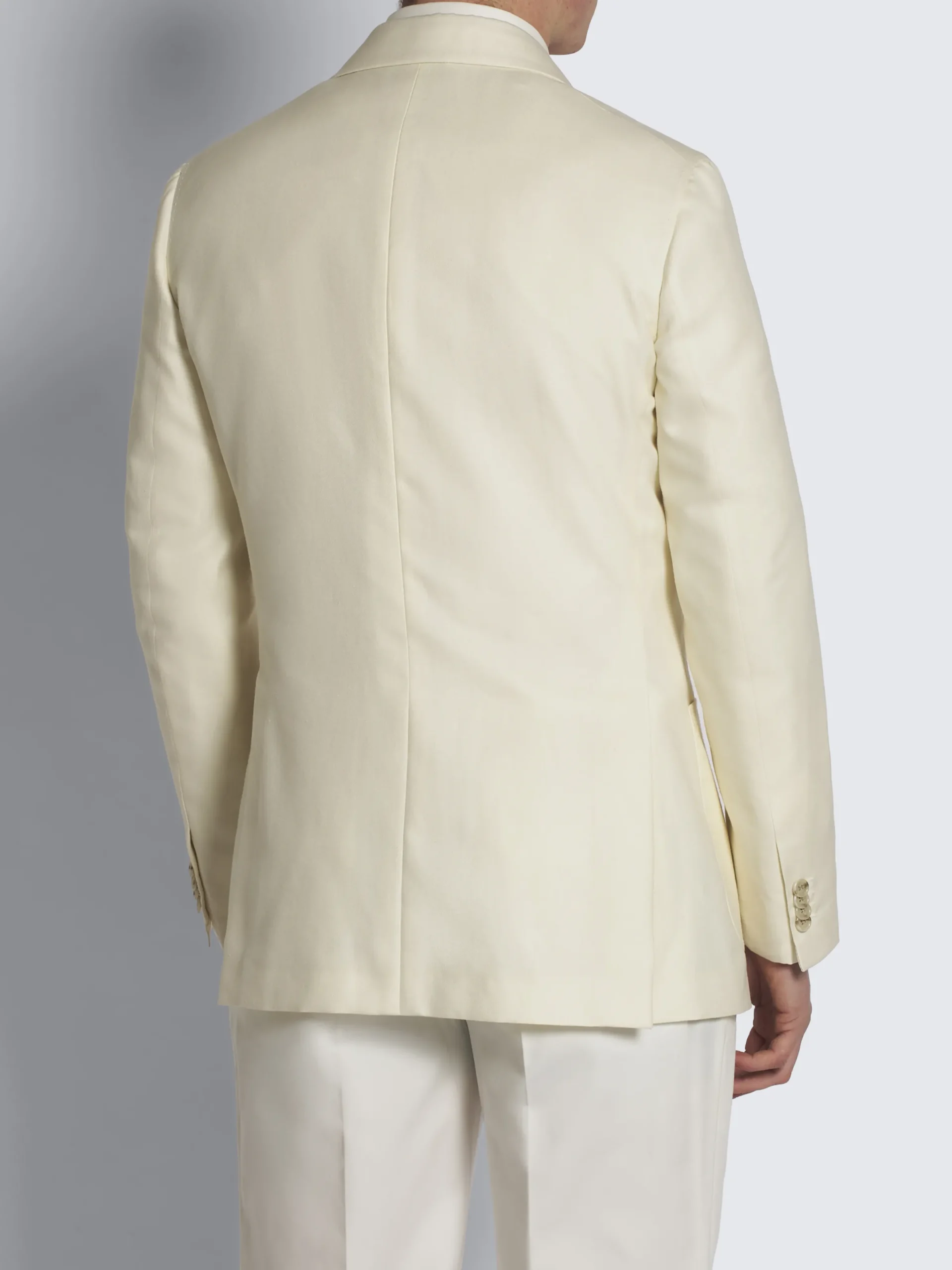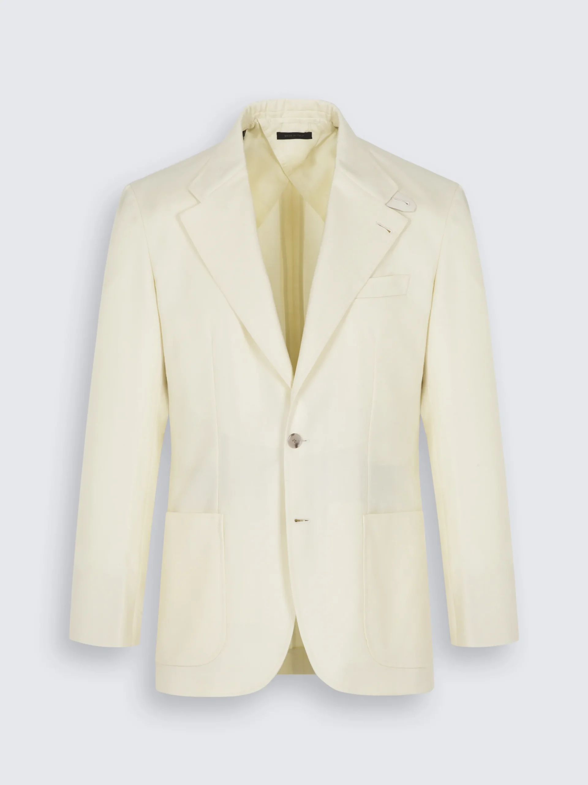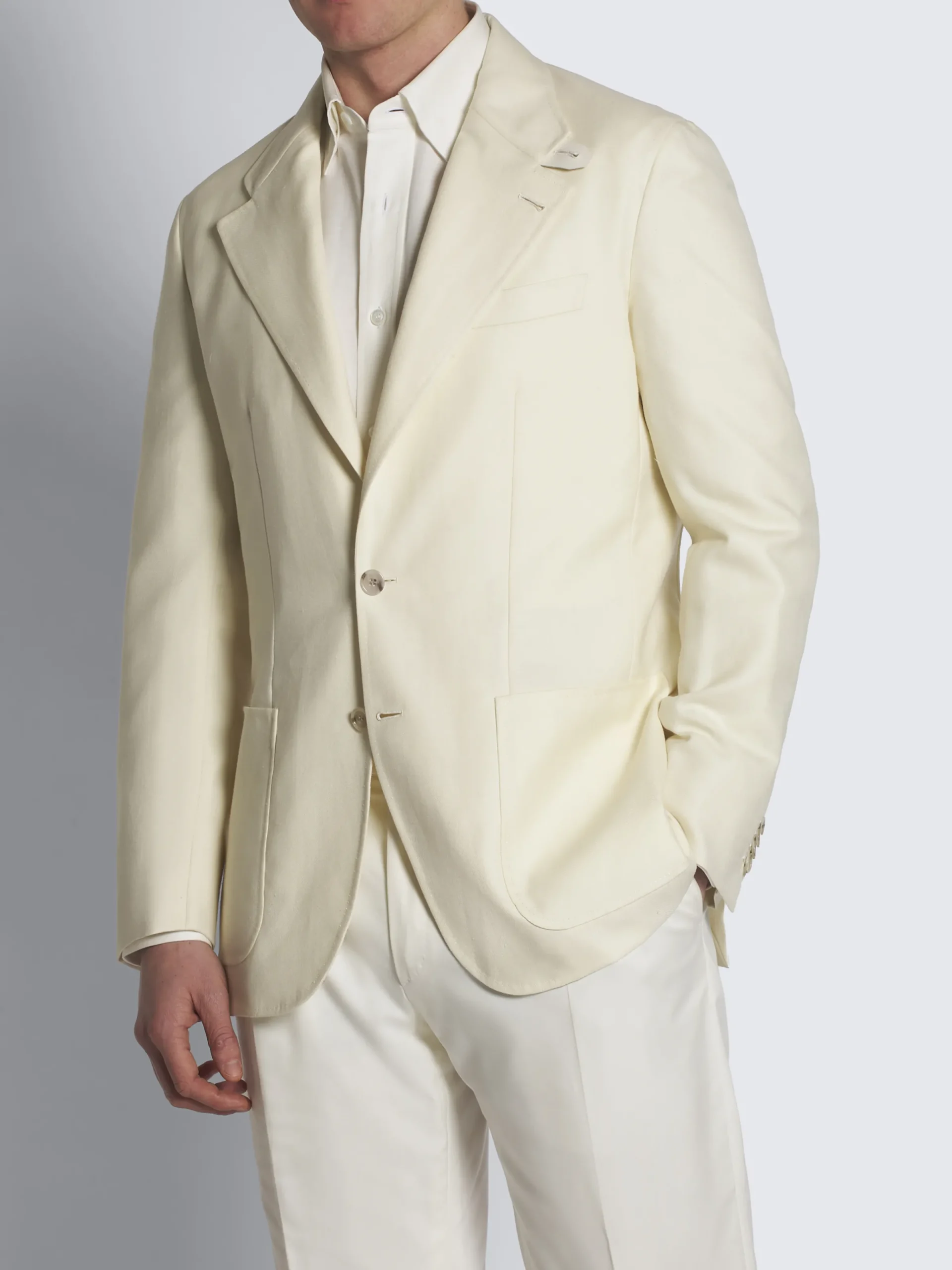 Ivory white herringbone wool, silk and linen Brera jacket. Half lined, deconstructed with ultra light shoulder construction and relaxed fit. It features a leather branded undercollar with row edge hand painted finishing, which ends in a functional tab to close the collar when it is upturned, giving to this light jacket a modern and innovative look. It also has one chest pocket, two patch pockets and two back vents. This versatile jacket can be matched with carded materials to enhance more casual attires, or with elegant ones for a fresh interpretation of contemporary formal looks.