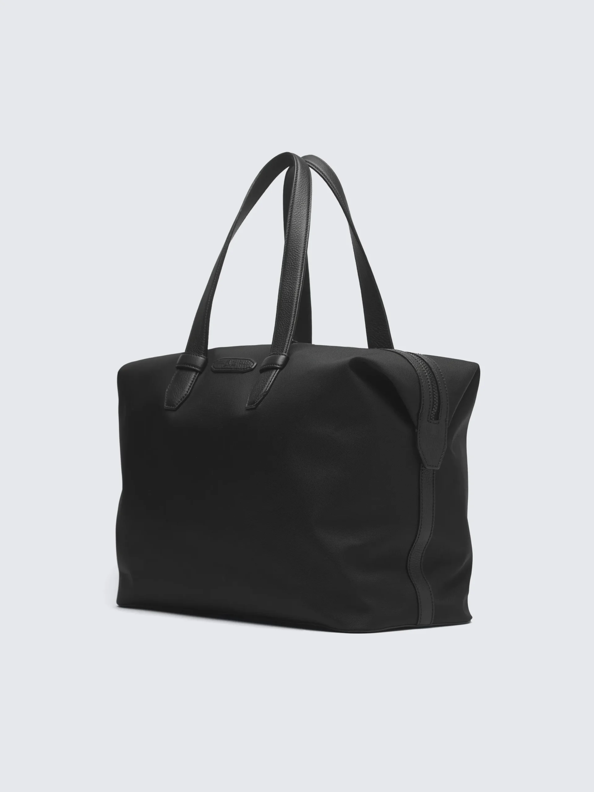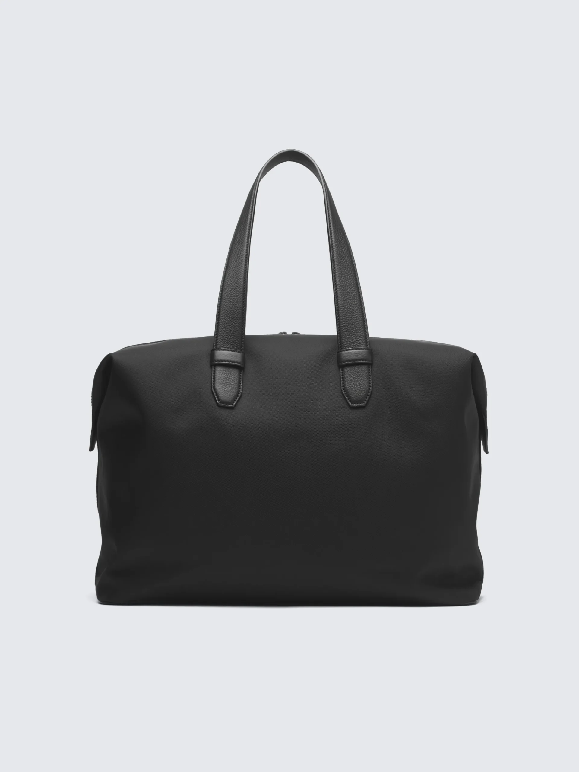 Black nylon and grained leather city bag. It features an external logo in leather, zip upper closure, and the shoulder strap is detachable and adjustable, making this accessory wearable also across the body. Made with waterproof, stain resistant nylon and soft and flexible grained leather, this piece is ideal for everyday use.