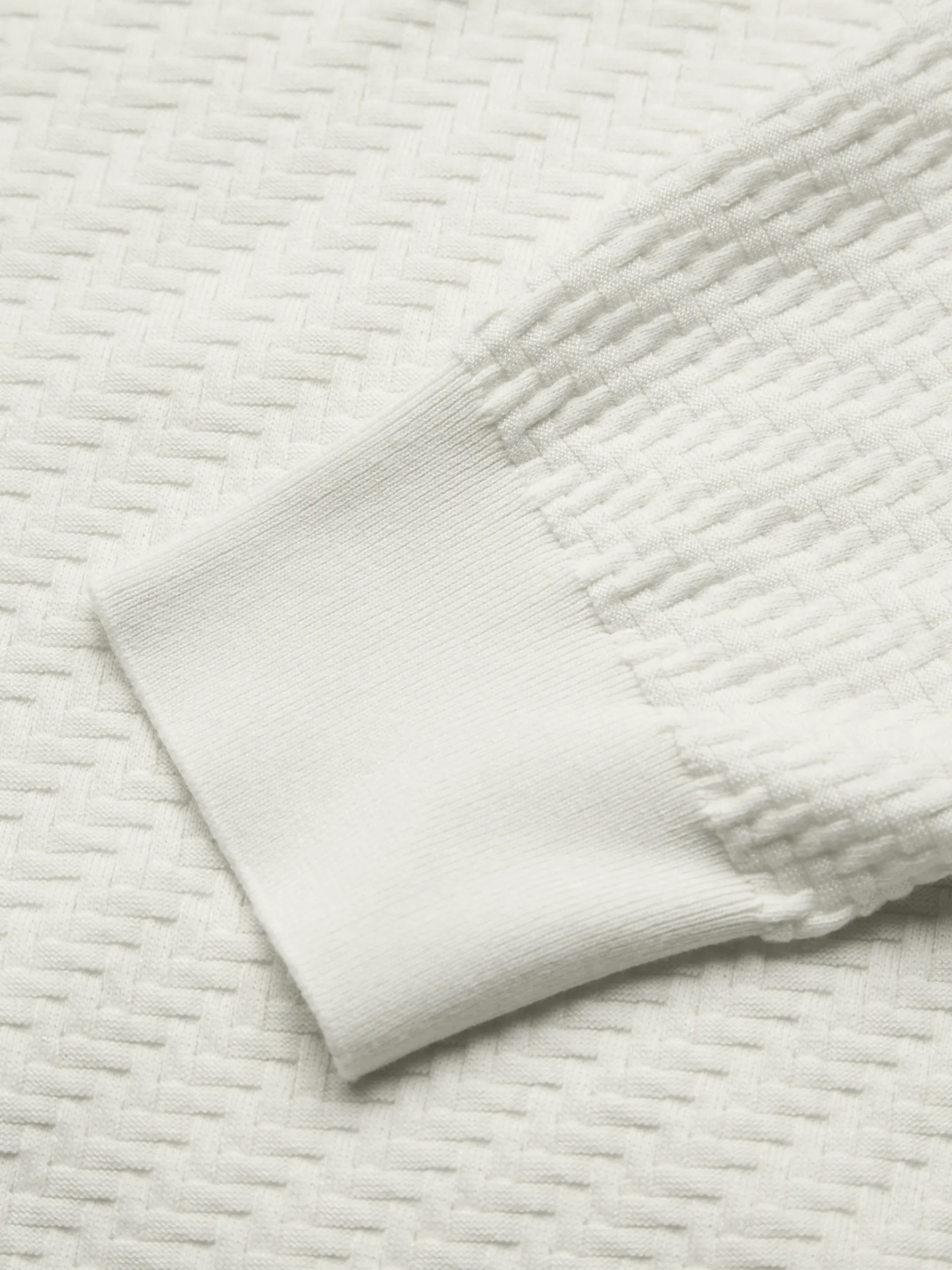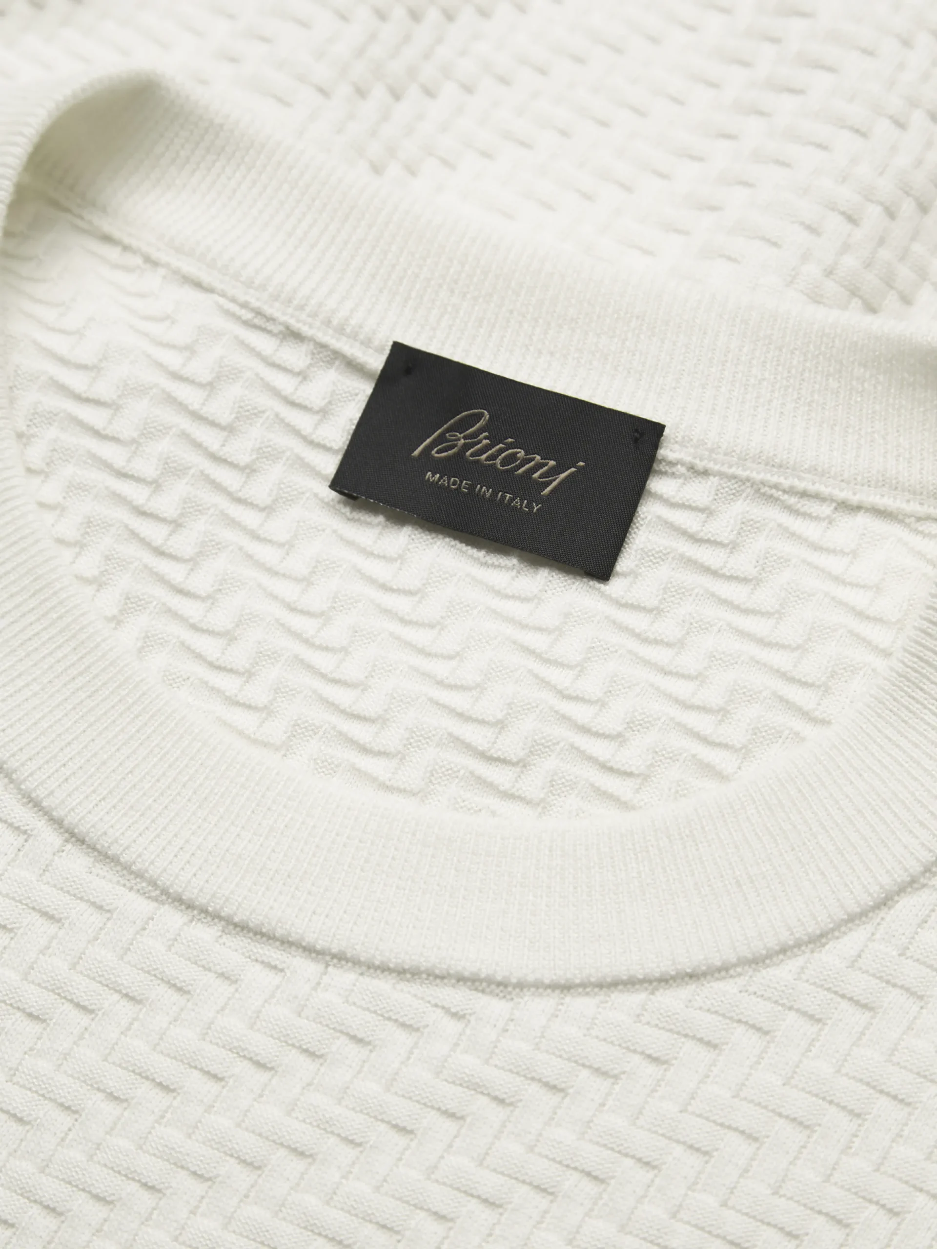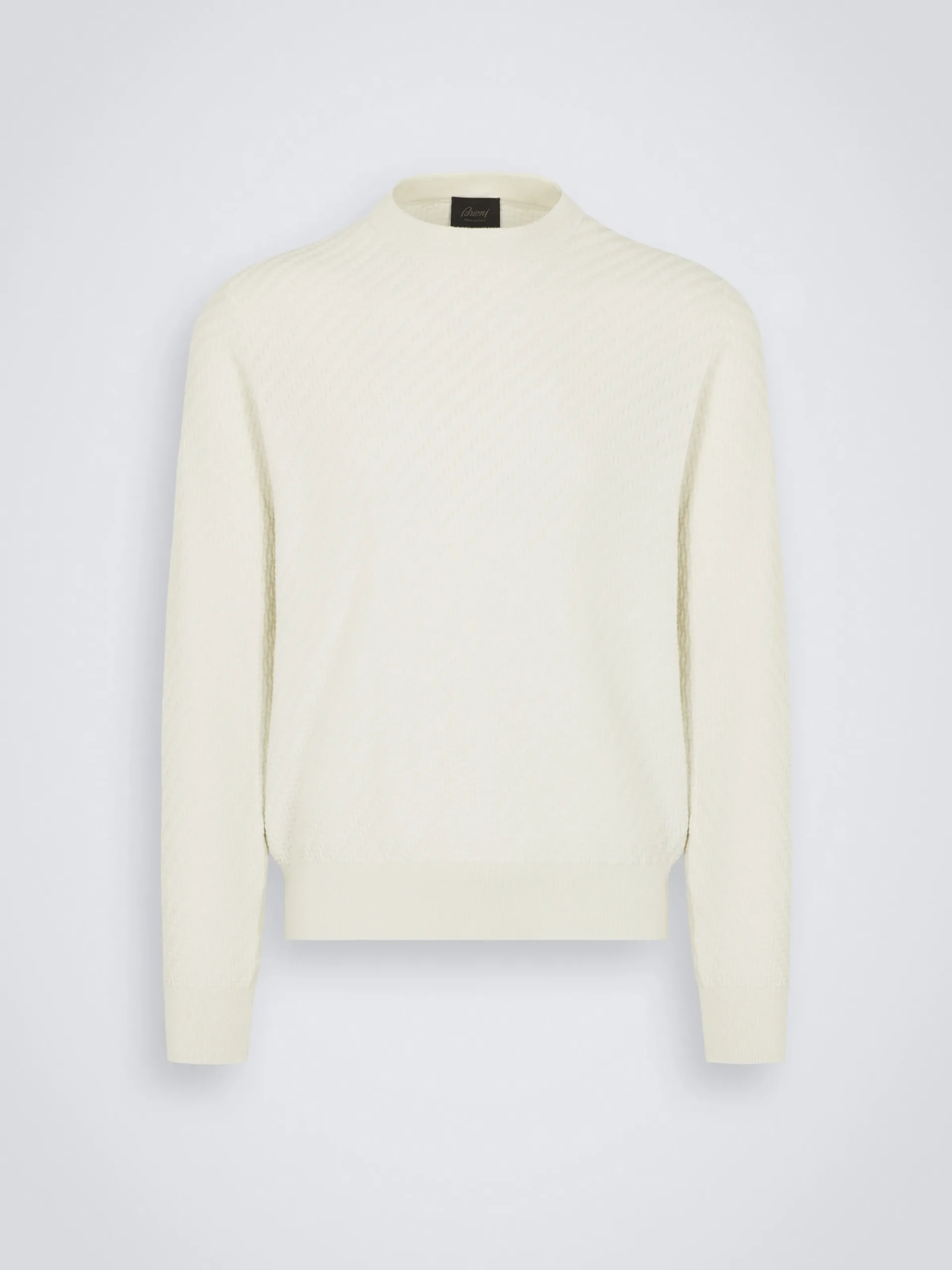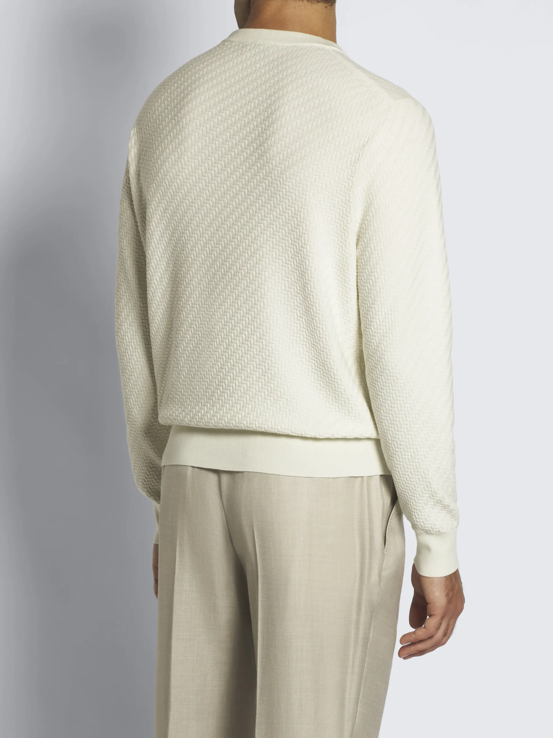 Ivory white organic cotton, silk and cashmere Trama weave crewneck sweater. Featuring a regular fit, this timeless classic is ideal to be matched with leisure trousers for a stylish and comfortable look. The Trama weave features tone-on-tone ribs for a uniquely subtle, tactile feeling. This pattern mimics the San Pietrini, the cobbled stones characterizing the streets of Rome. An iconic motif drawn from the eternal city itself.nThis garment contains GOTS certified cotton. The Global Organic Textile Standard (GOTS) is a voluntary standard obtained by verification through independent third-parties. Practices include requirements on environmental management and wastewater; protection of health, safety and rights of employees; avoidance of hazardous substances.