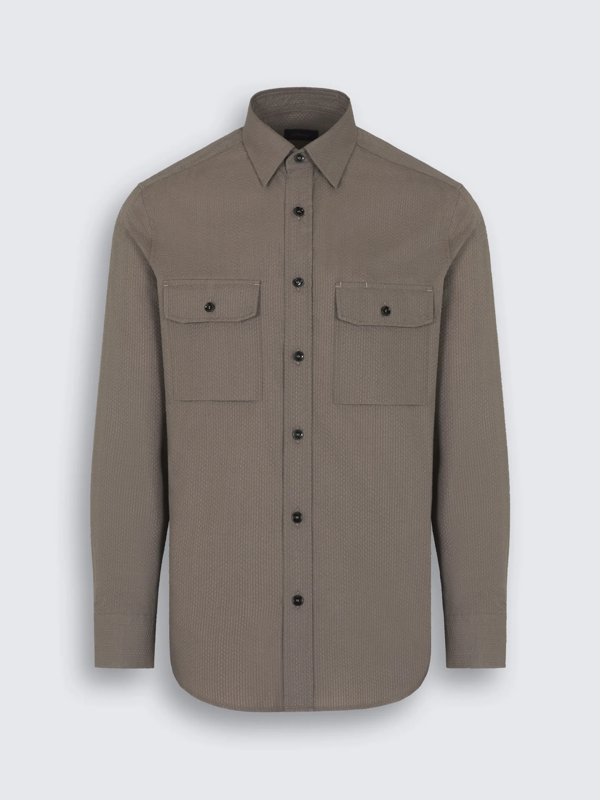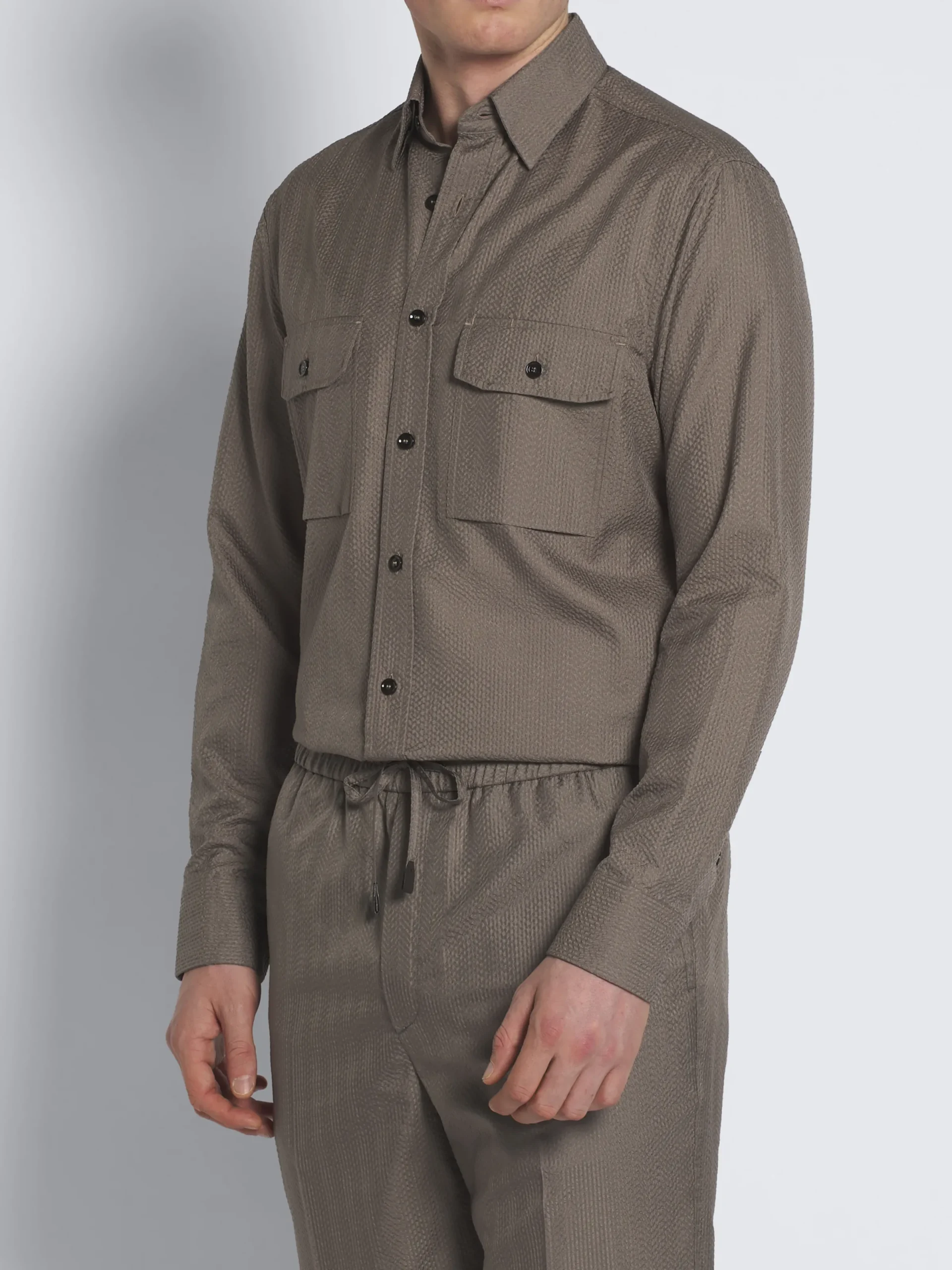 Taupe silk seersucker militry shirt. Featuring a regular fit, hidden-button down collar, mitered cuffs, two chest patch pockets with bevelled flaps and button closure. Additional details feature an external back hanger and internal regimental details. A modern touch to add to your leisure looks for a polished yet relaxed allure.