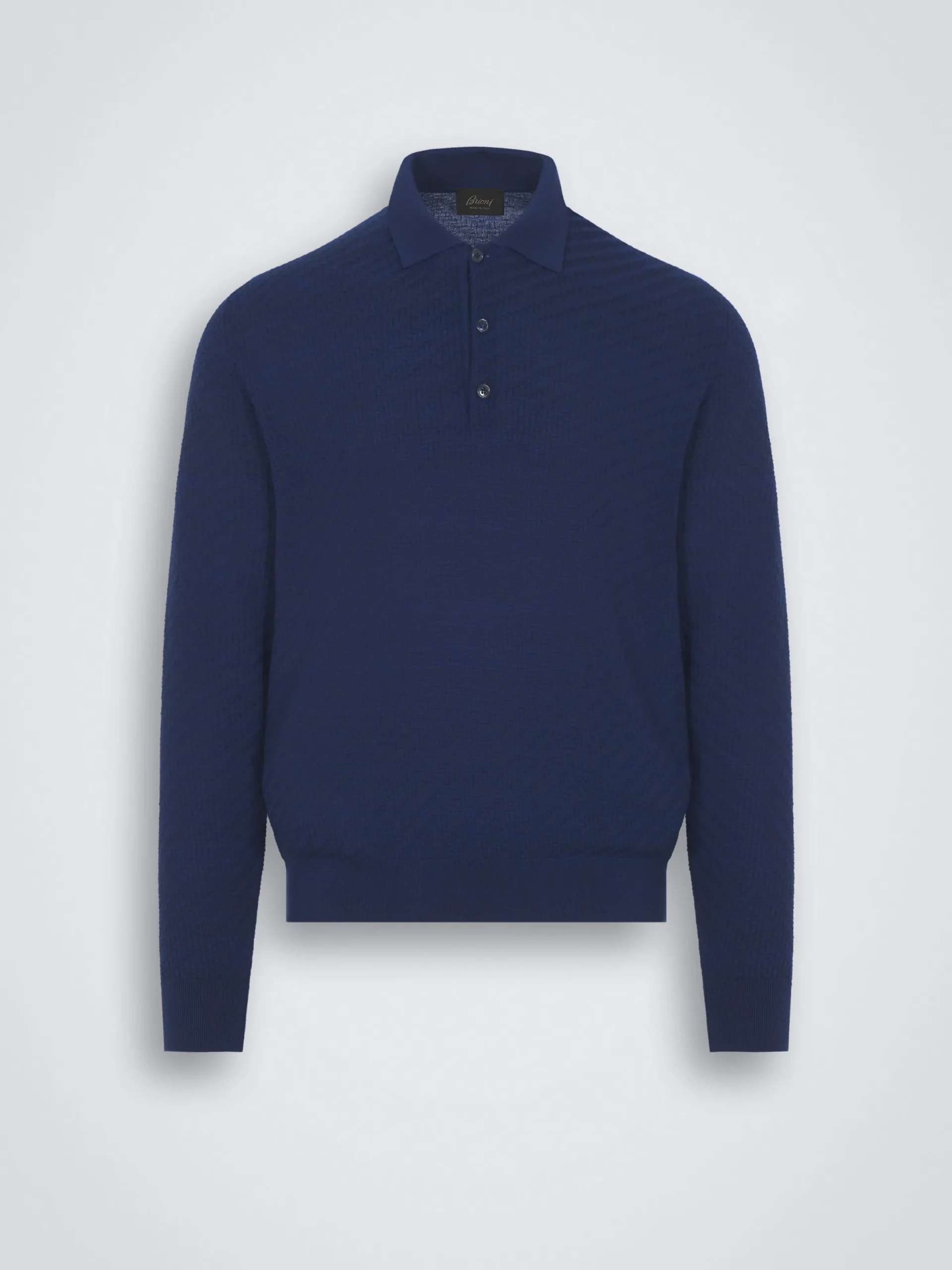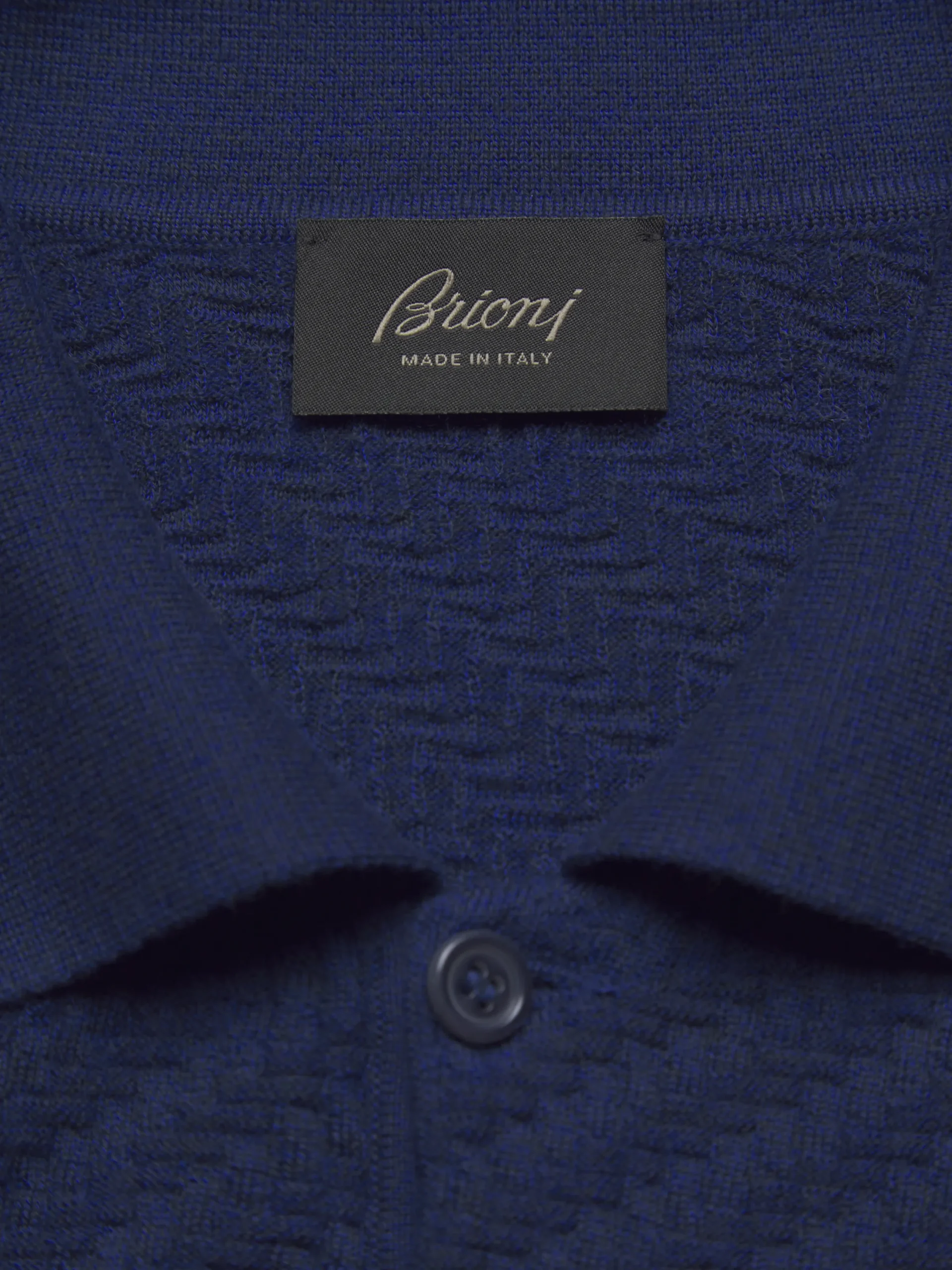 Royal blue vicuña and cashmere Trama weave polo sweater featuring mother of pearl buttons. The perfect piece to layer under a leisure jacket with a T-shirt underneath. The Trama weave features tone-on-tone ribs for a uniquely subtle, tactile feeling. This pattern mimics the San Pietrini, the cobbled stones characterizing the streets of Rome. An iconic motif drawn from the eternal city itself.nRenowned for its unparalleled softness and thermal properties, vicuña is extremely precious – the rarest and finest wool in the world. Garments crafted from this yarn are distinguishable by their strength, lightness, and warmth.
