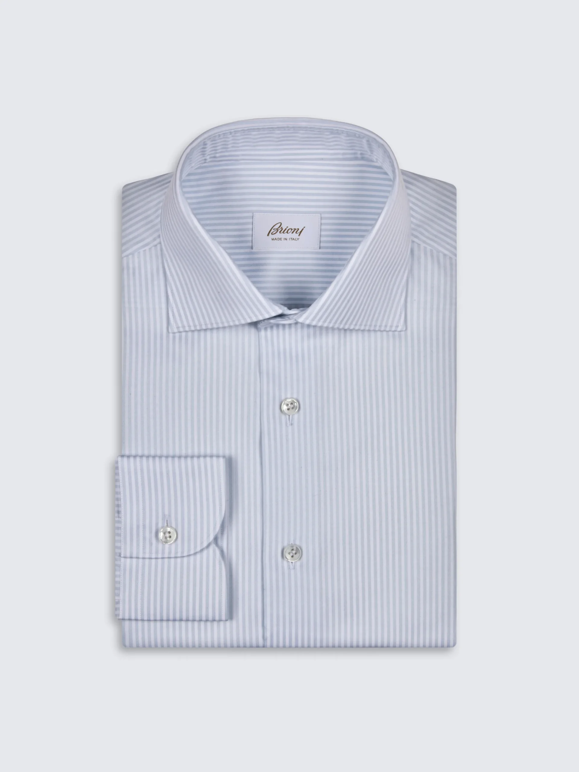 White and light blue striped organic cotton formal shirt. Featuring a regular fit, rounded cuffs, mother of pearl buttons and without front placket. Sleek and sophisticated, it is perfect to be worn with a tie. A true wardrobe staple.nThis garment contains GOTS certified cotton. The Global Organic Textile Standard (GOTS) is a voluntary standard obtained by verification through independent third-parties. Practices include requirements on environmental management and wastewater; protection of health, safety and rights of employees; avoidance of hazardous substances.