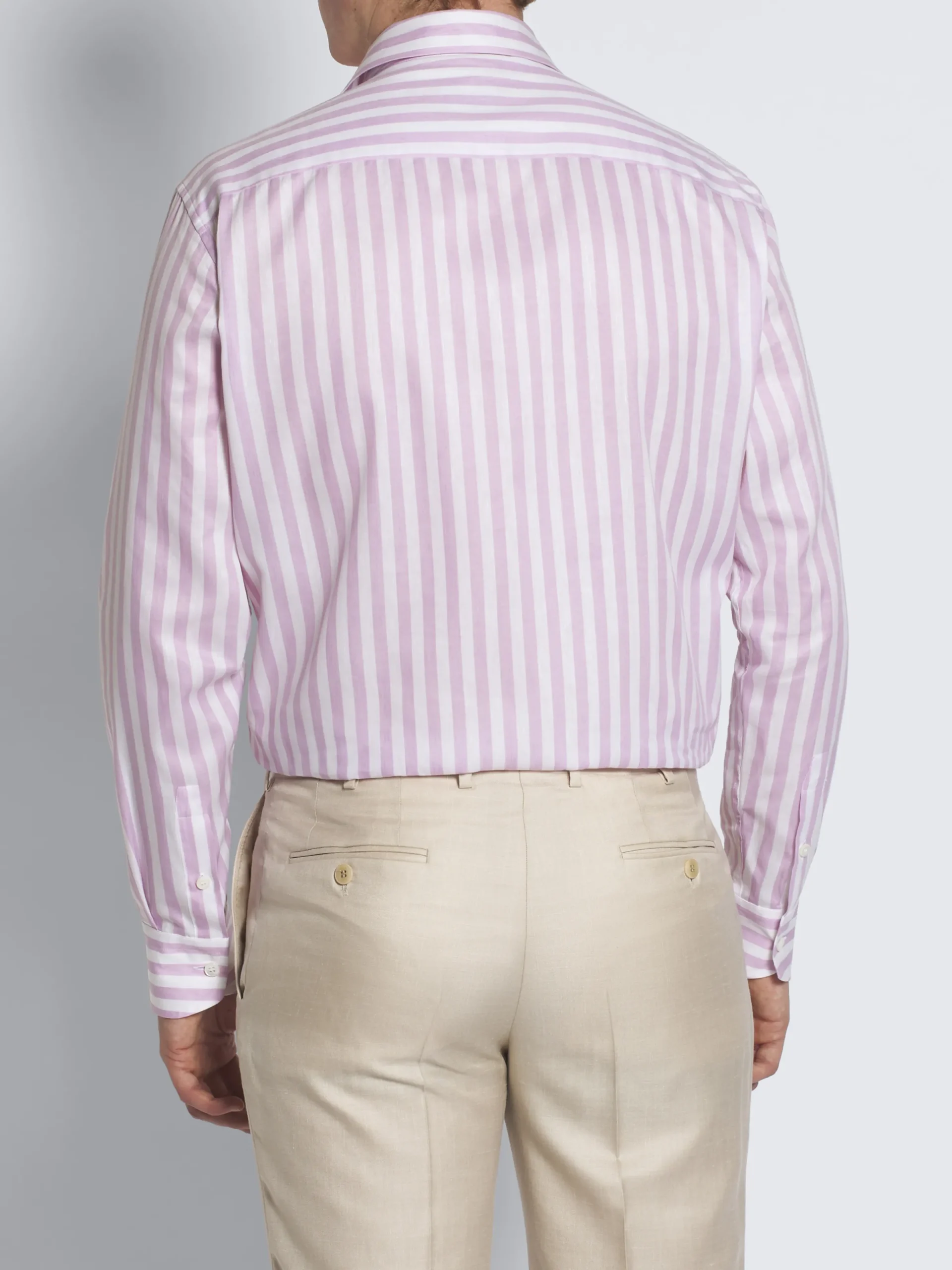 White and pink striped cotton and linen Capri collar shirt. Featuing a regular fit, mitered cuffs, mother of pearl buttons, and internal regimental detail. The Capri collar provides it a relaxed flair, giving your looks an effortless attitude.