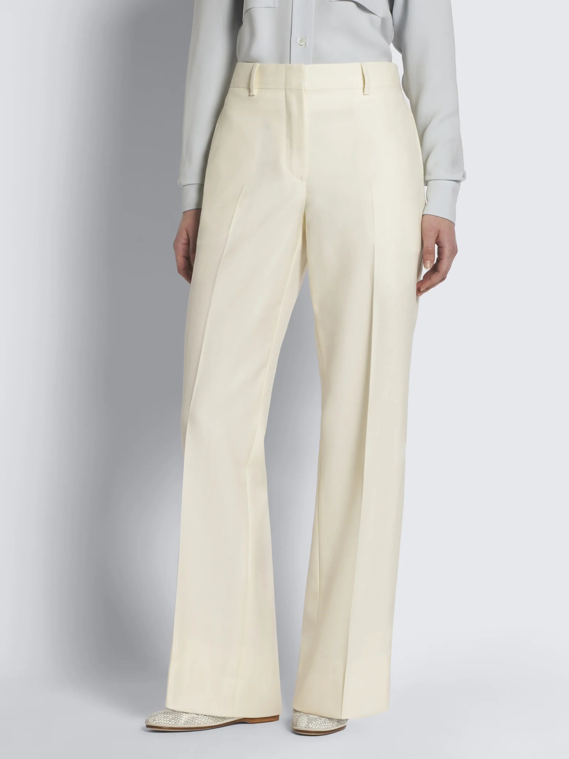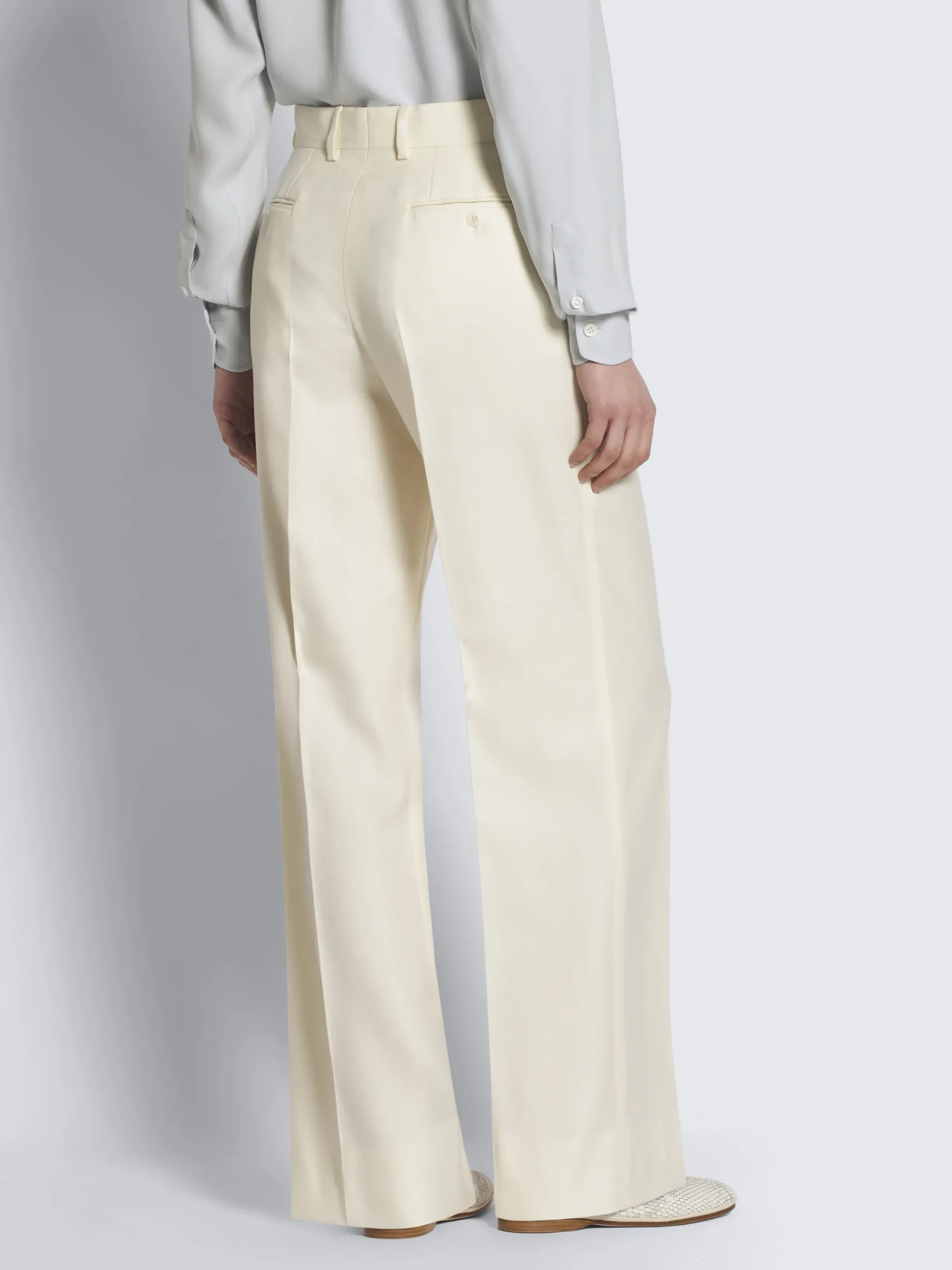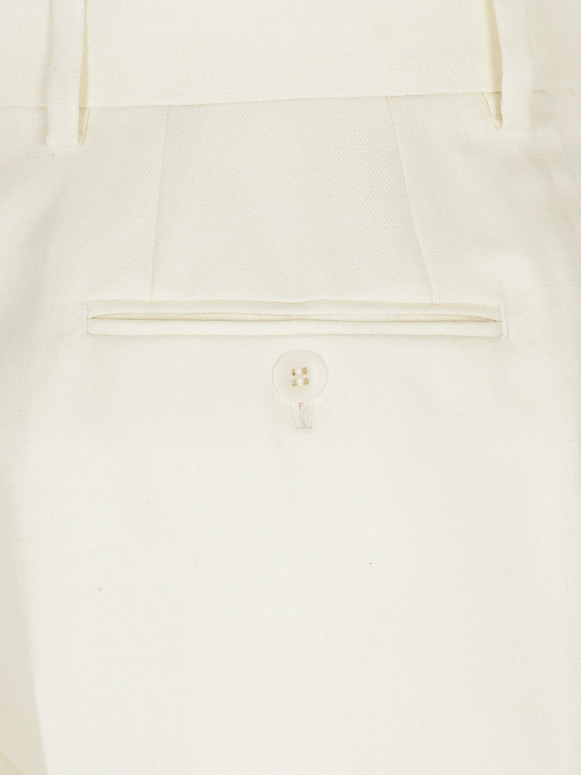 Ivory white wool, silk and linen herringbone Palinuro trousers. Featuring a zip fly and hidden button closure, two side diagonal pockets, two back welt pockets with button closure and belt loops. The clean lines give to these trousers an effortless attire that will elevate any look.