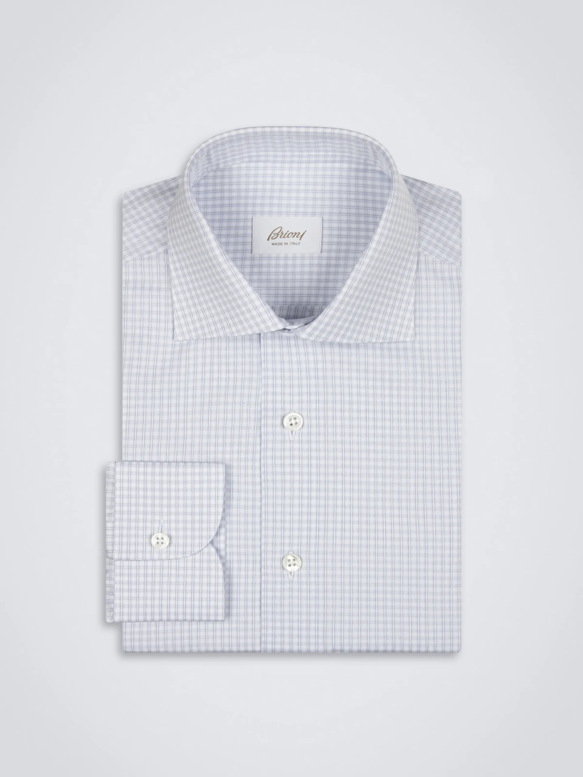 White and light blue checked cotton formal shirt. Featuring a regular fit, rounded cuffs, mother of pearl buttons and without front placket. Sleek and sophisticated, it is perfect to be worn with a tie. The perfect piece for a modern formal attire. ..