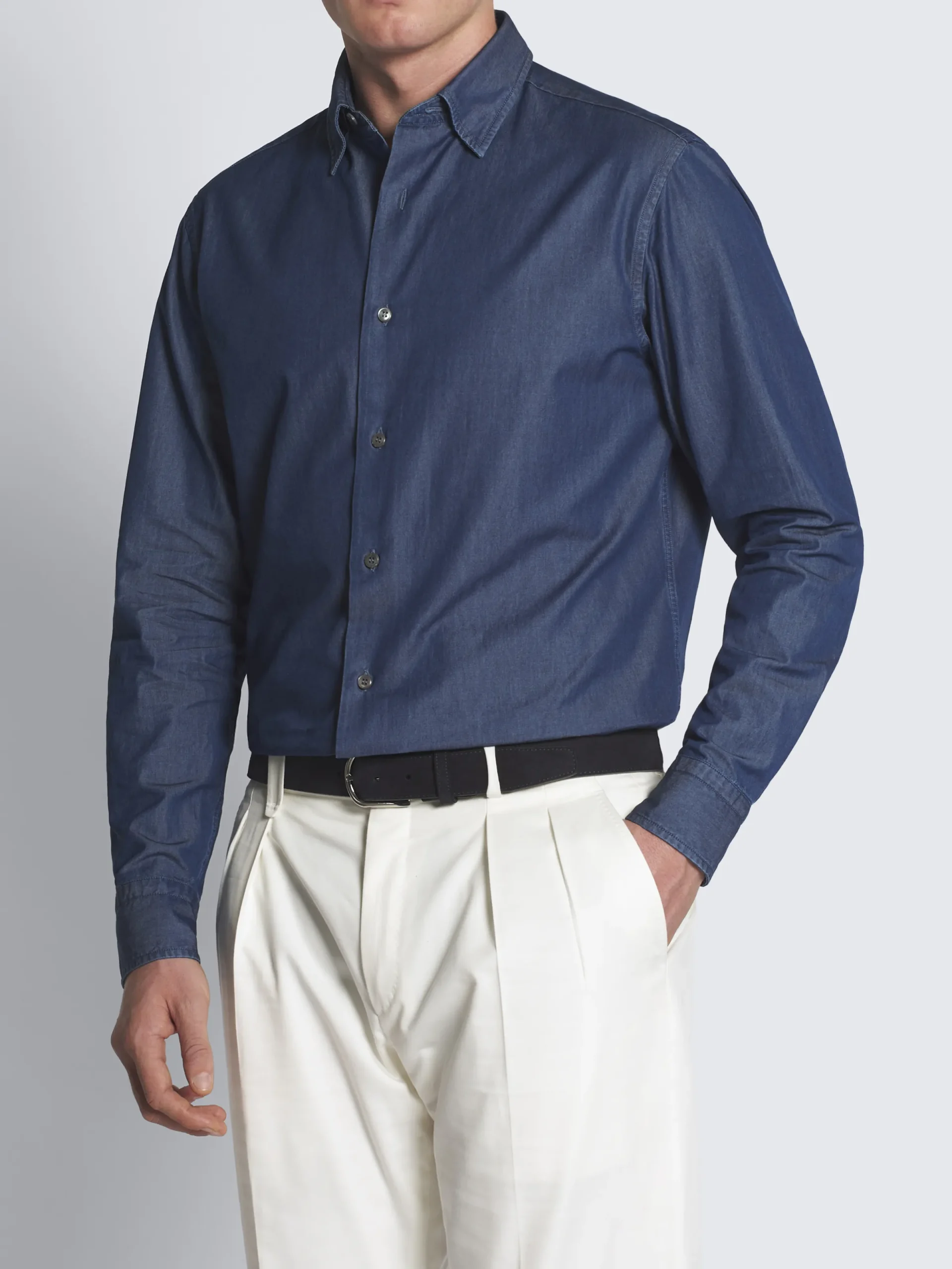 Regular fit denim blue cotton shirt featuring a hidden button-down collar. A true wardrobe staple, perfect to complete your leisure looks.