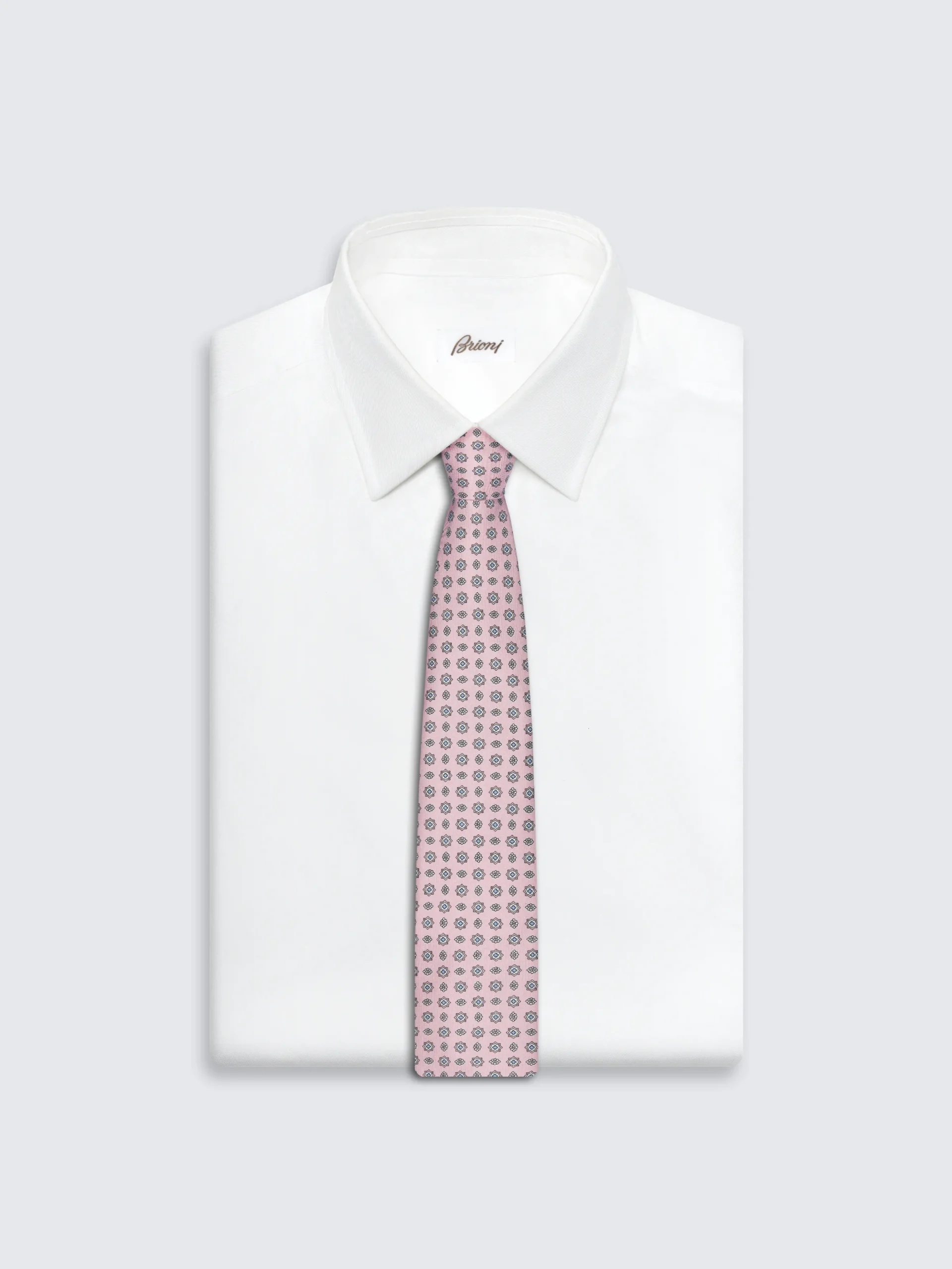 Pink and light blue micro motif silk tie. Brioni ties are the epitome of elegance, handmade from the finest materials. Featuring an internal wool canvas that keeps it structured over time, single internal thread running along the entire length, and silk jacquard lining with Brioni logo. Perfect to be paired with a white shirt and a formal jacket for a chic and modern look.