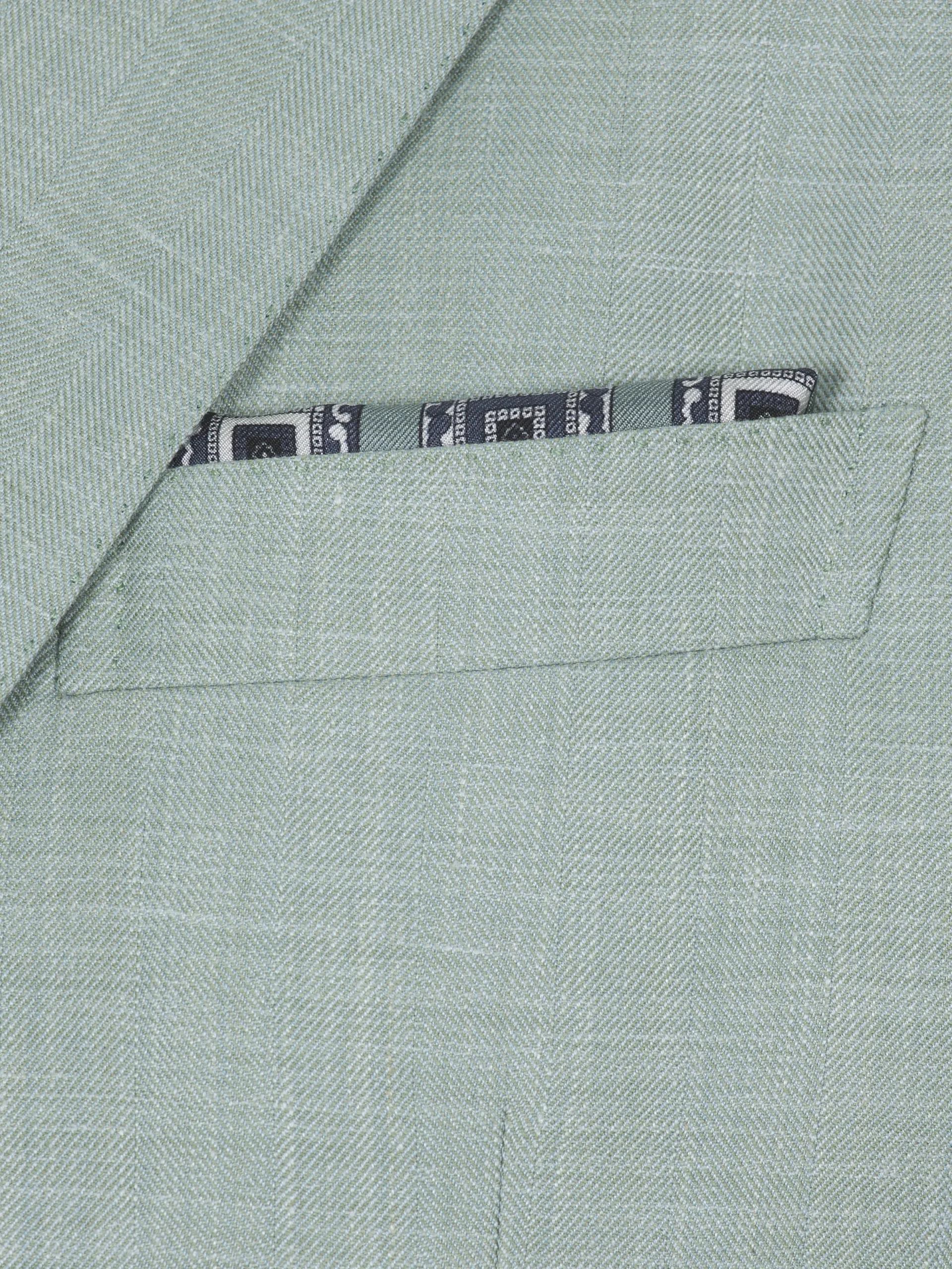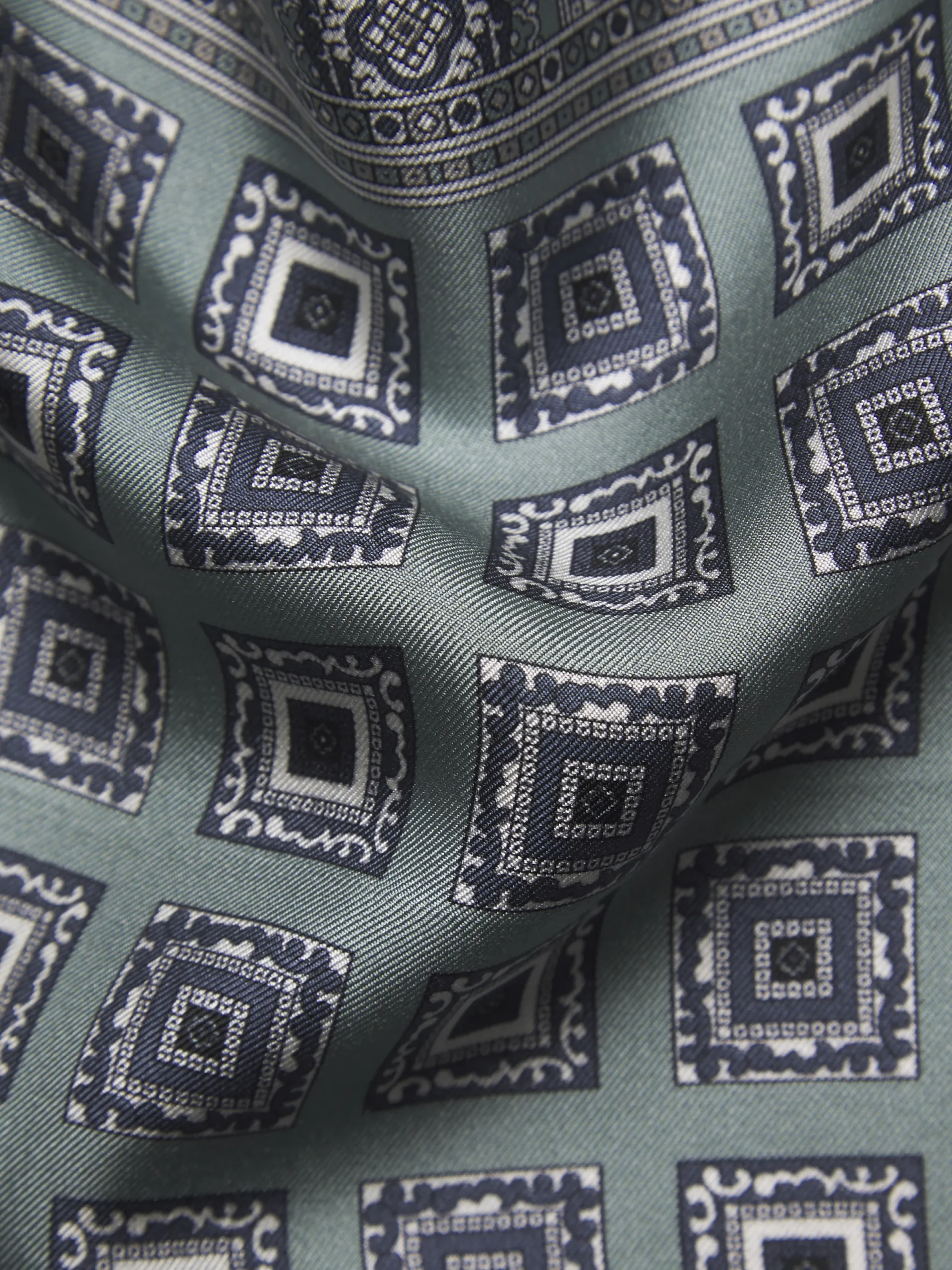 Aqua green and navy blue silk pocket square. Hand-rolled, this ultra-versatile piece is perfect to add an elegant touch to your formal jacket.