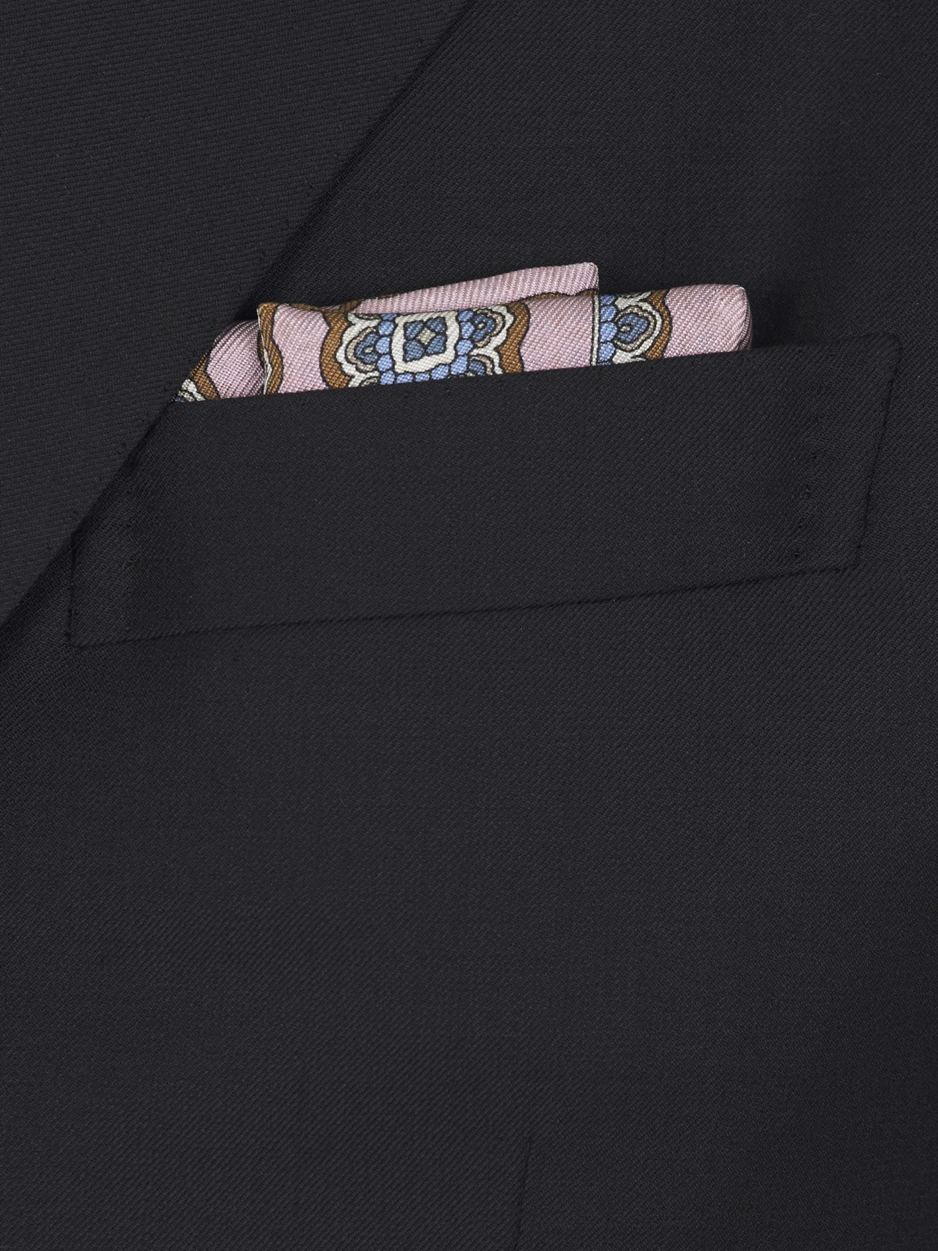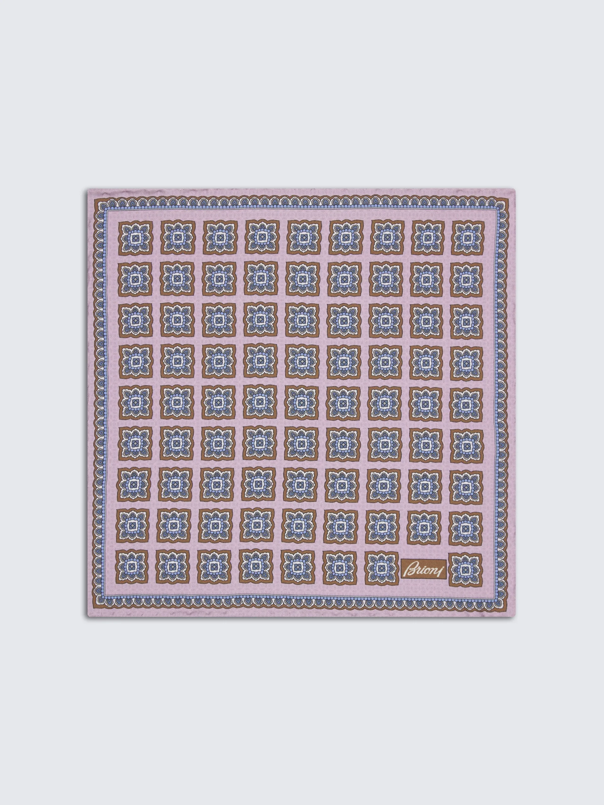Pink and sky blue motif silk pocket square. Featuring a classic medallion pattern and Brioni logo detail, this refined piece is handcrafted in Italy and will add a sophisticated touch to your jackets.