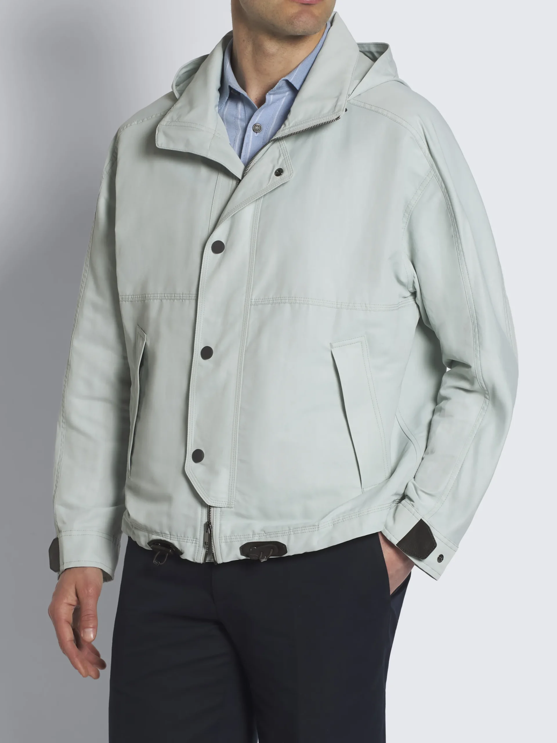 Aqua green technical linen Fisherman windbreaker. Featuring a detachable hood, standing collar, and front closure with dual zip and snap buttons. To adjust the desired fit the model presents adjustable drawstrings on the hood, collar and along the waistline with « B » logo stoppers. Finished with a leather bevelled detail with debossed logo on the back, leather bevelled tabs with buttons on the cuffs, two side zip pockets, one internal pocket with button closure and topstitching along all the design. A jacket rich in details, crafted with precision.nThis item is part of our Riviera collection, a celebration of self-reconnection and unhurried rhythm, inspired by the endless blue hues of the Mediterranean Sea.