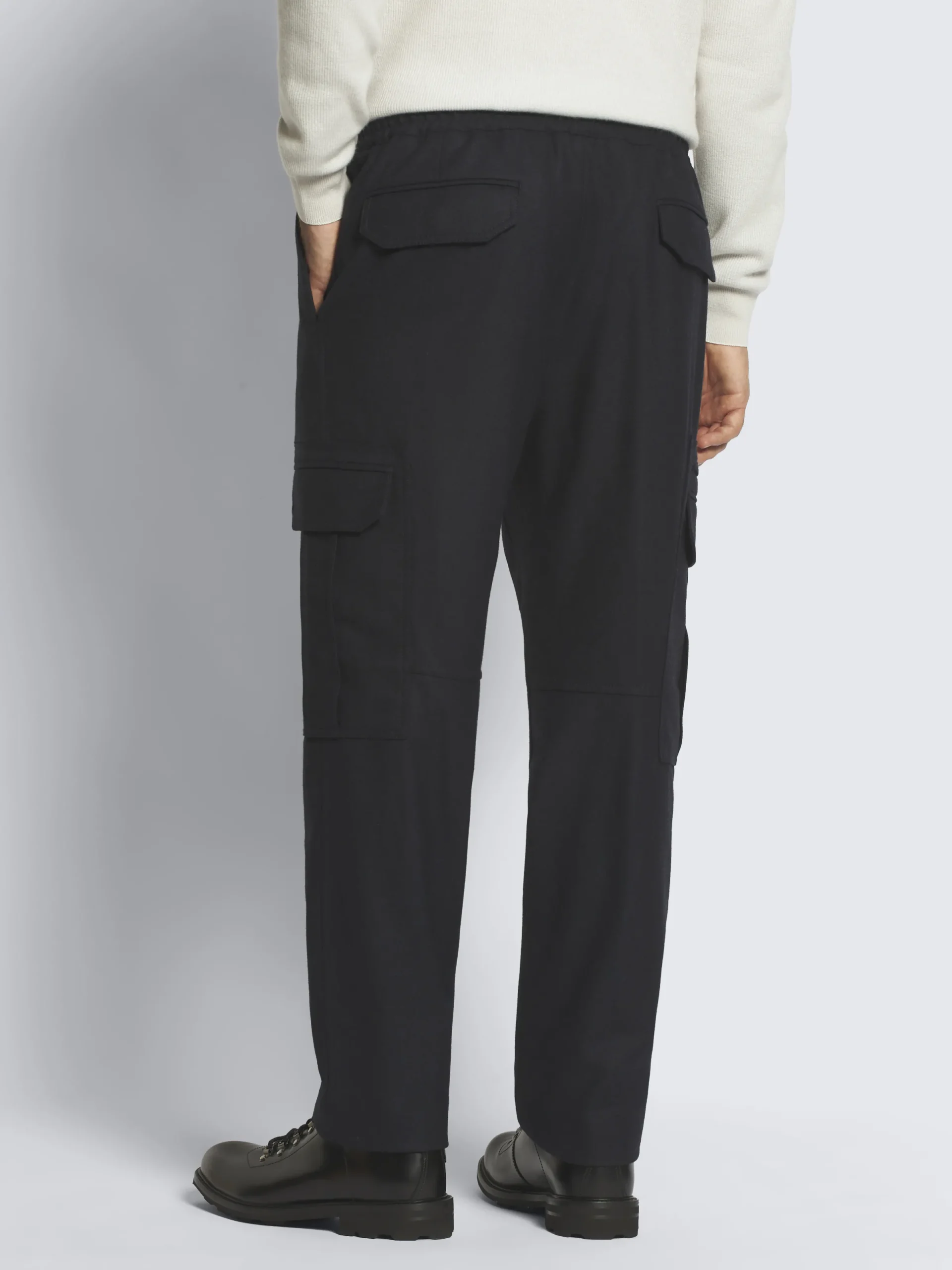 Midnight blue flannel wool twill Lucca trousers, featuring an elasticated waistband, branded leather drawstrings with handprinted edge and zip front closure. This cargo trousers are characterised by two side patch pockets, two flap pockets on the back and multiple pockets on the legs – two flap and one with zip closure. Perfect to wear on casual days, they will add a contemporary touch to your laid-back look. Team them up with a leisure shirt and a pair of sneakers.