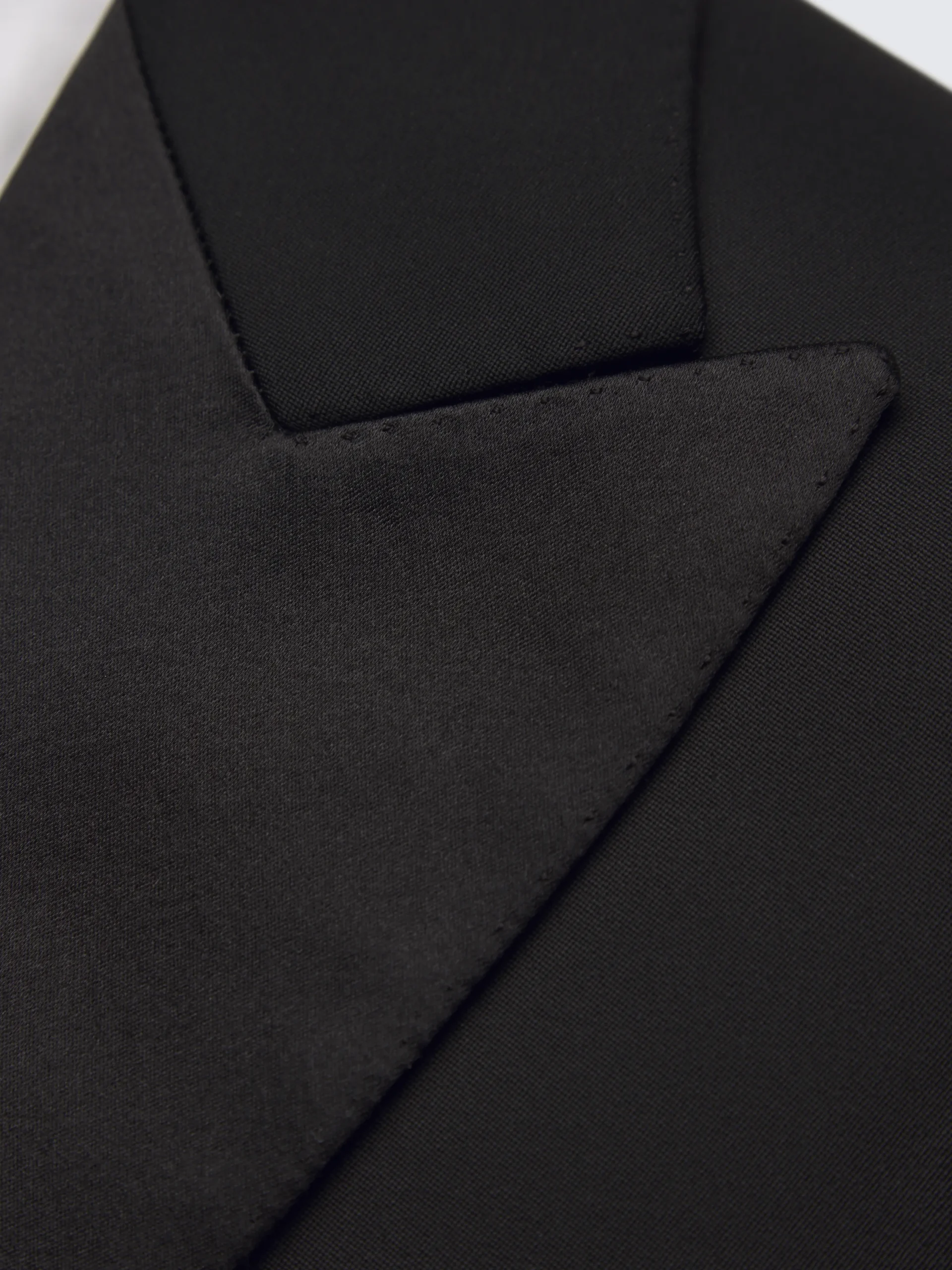 “,”features”:”Regular fitnSingle-breastednSingle button closurenLapels in silknOne chest pocketnTwo front jet pocketsnAMF stitching on lapels, collar and front closurenLength: 145 cm measured on a size 40nThe model is 176 cm tall