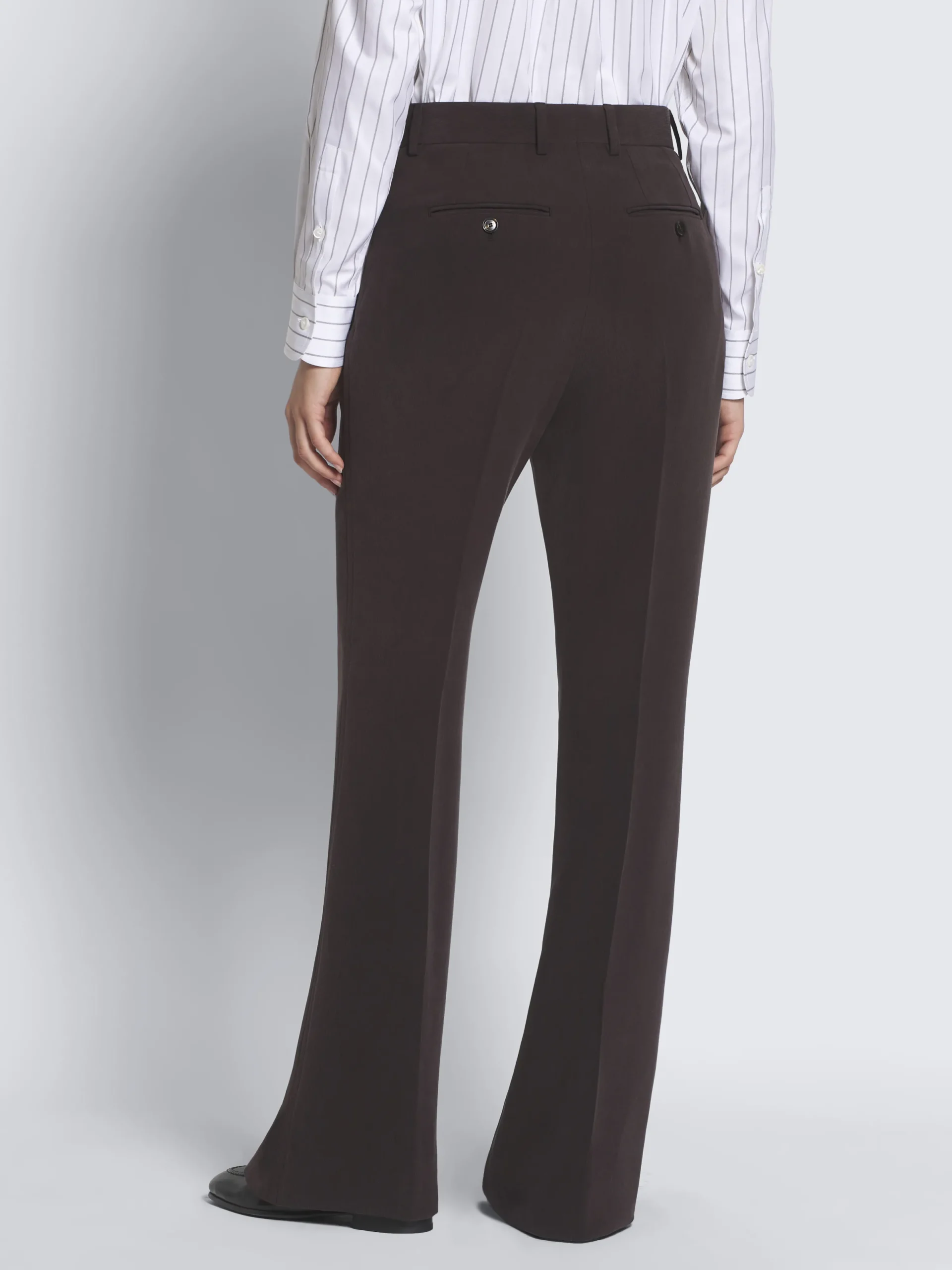Dark brown silk cady flare trousers. Featuring a fly zip and hidden button closure, two side welt pockets, two back jet pockets with button closure, single pleats, crête details and belt loops. These comfortable trousers will fit you like a glove: the ideal piece for any sophisticated look.