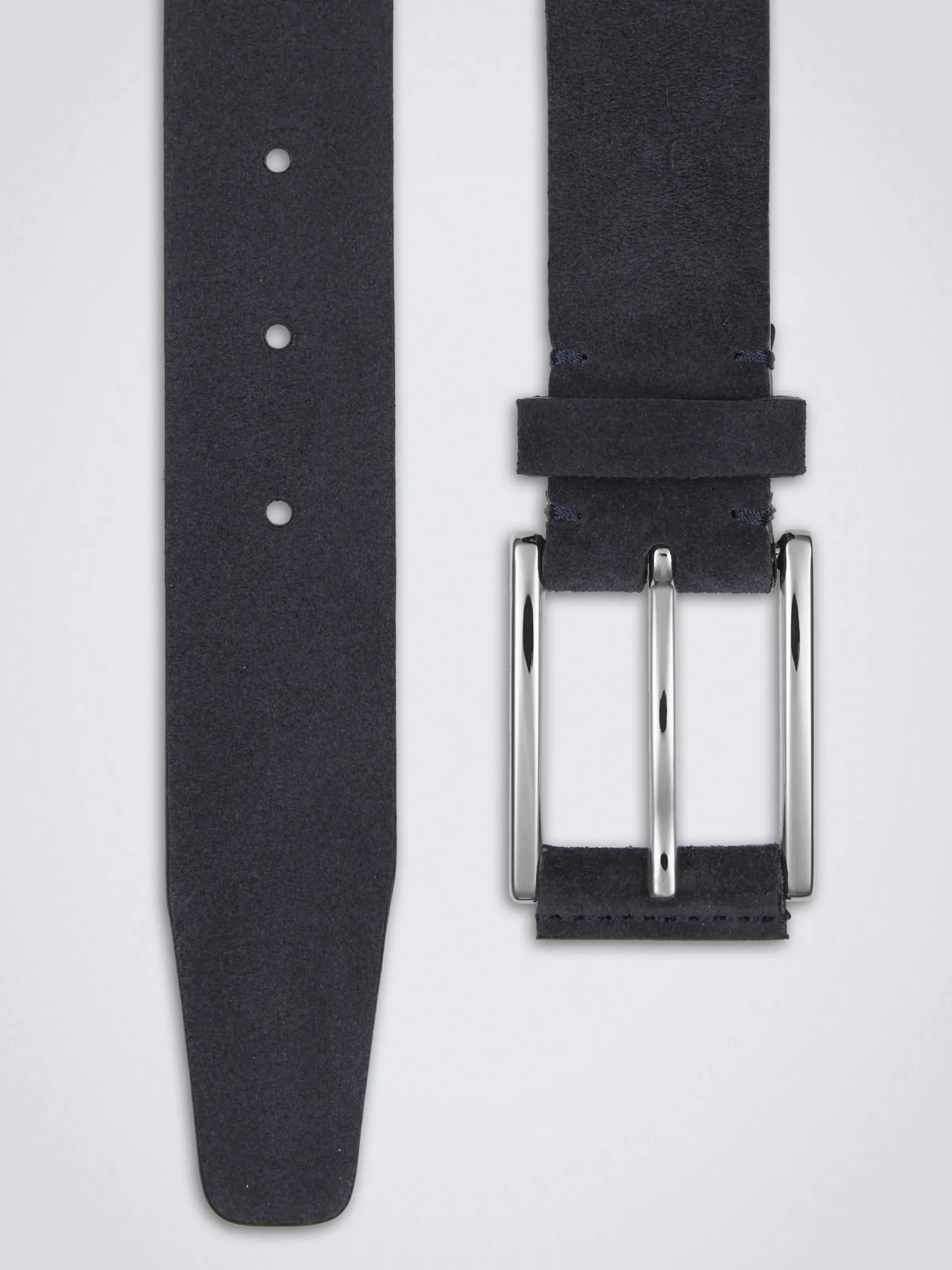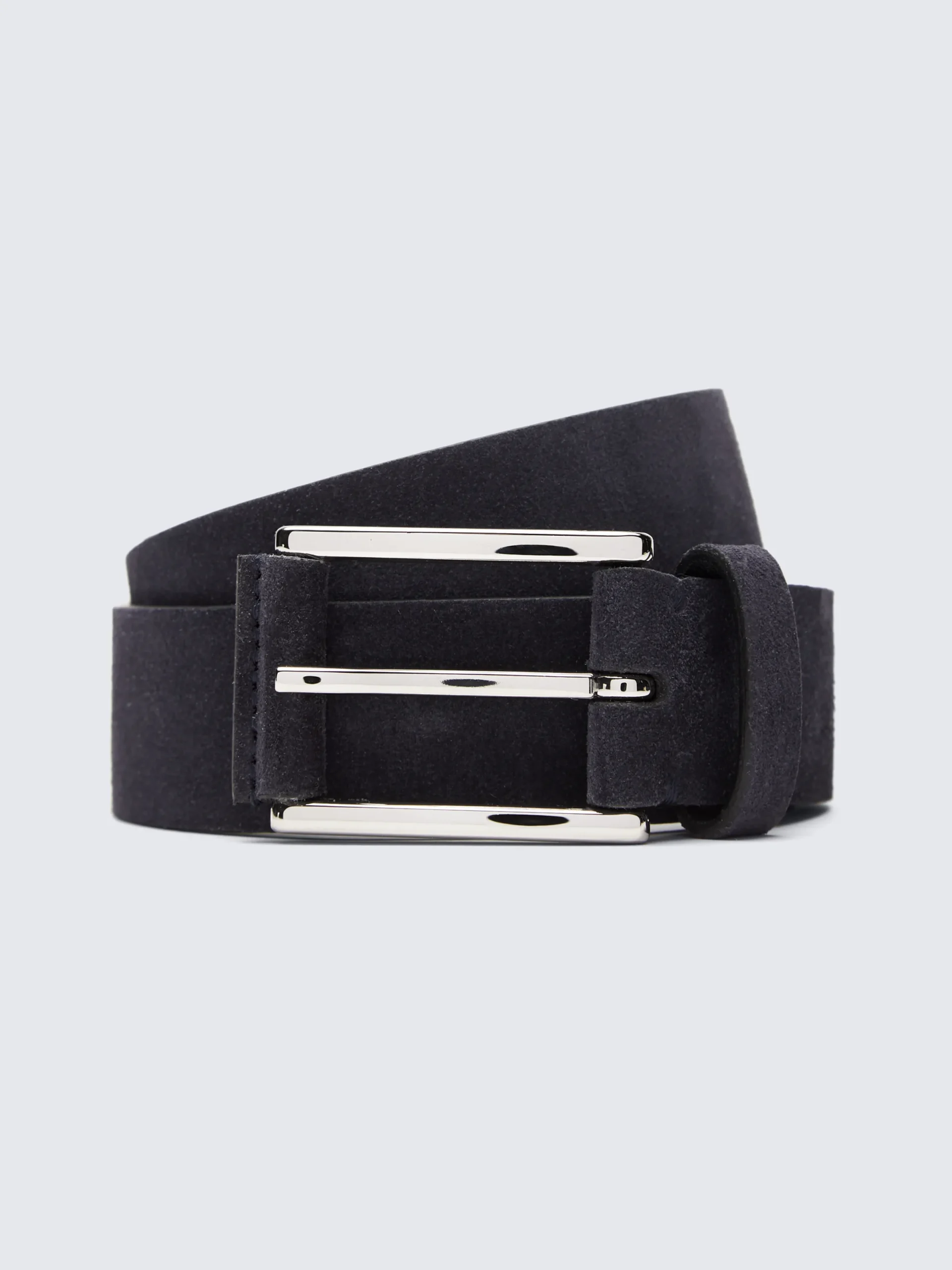 Midnight blue suede and calf leather belt with roller buckle, with palladium finished roller buckle and hand tinted sides. The perfect complement to your leisure looks.