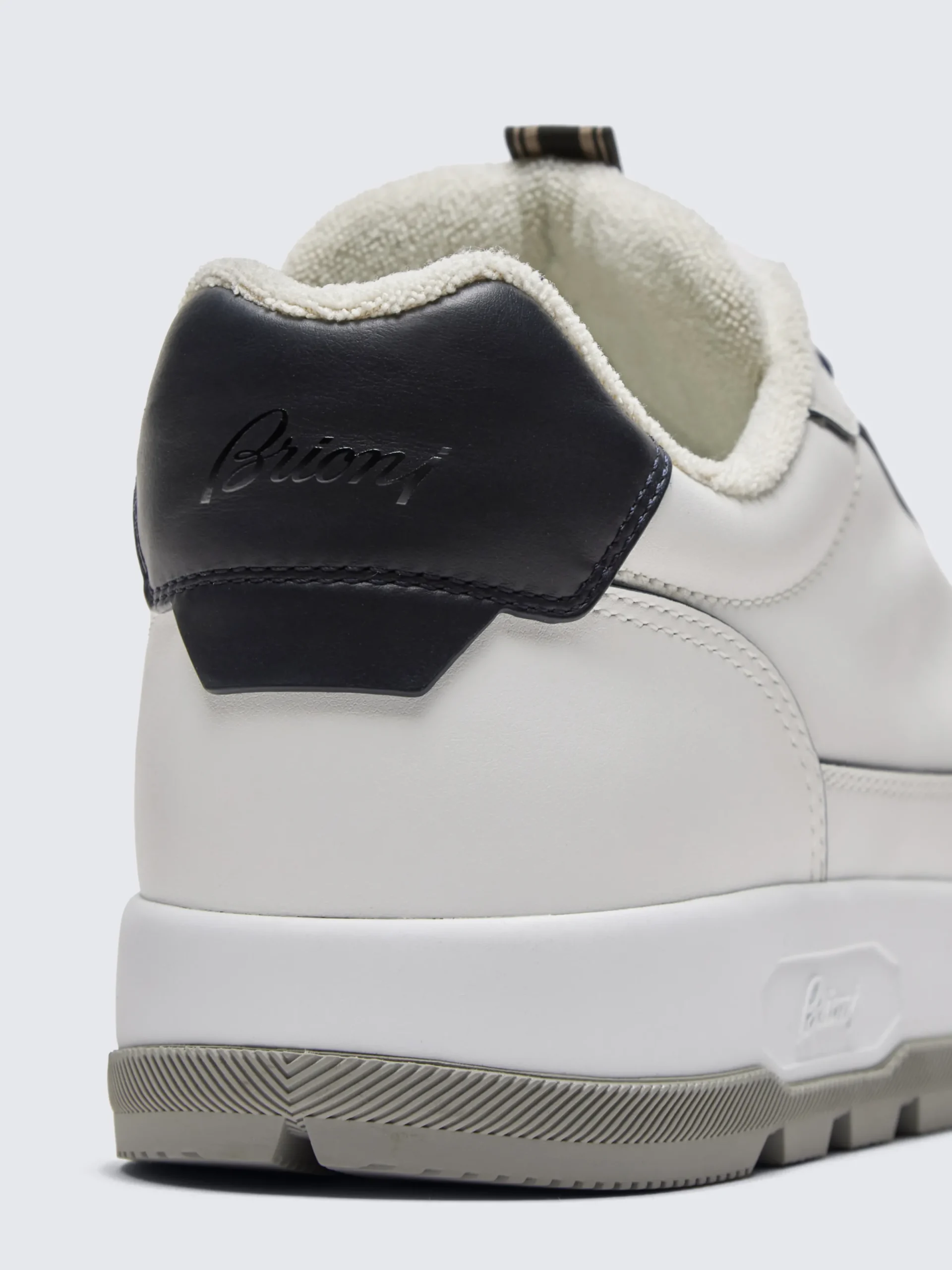 White and midnight blue Crossing sneakers. Made of smooth calfskin with trims in contrasting colour, these shoes feature a Brioni embossed logo on the side sole and back, and branded label and regimental detail on the tongue, recalling our tailoring heritage. The rubber lugsole provides more grip, and the ergonomic insole made of soft foam, assures extra comfort and support to the back while walking. Modern with a vintage flavour, these versatile sneakers will add a sophisticated yet sporty touch to your leisure looks. Perfect on and off the field, they are part of our Golf Capsule.nIn the Strobel construction the upper is joined to a lightweight insole forming a pouch, which is then joined to the sole. It guarantees a strong support for ankle torsion, crucial for footwear that requires great comfort and performance, like sailing shoes and active sneakers.