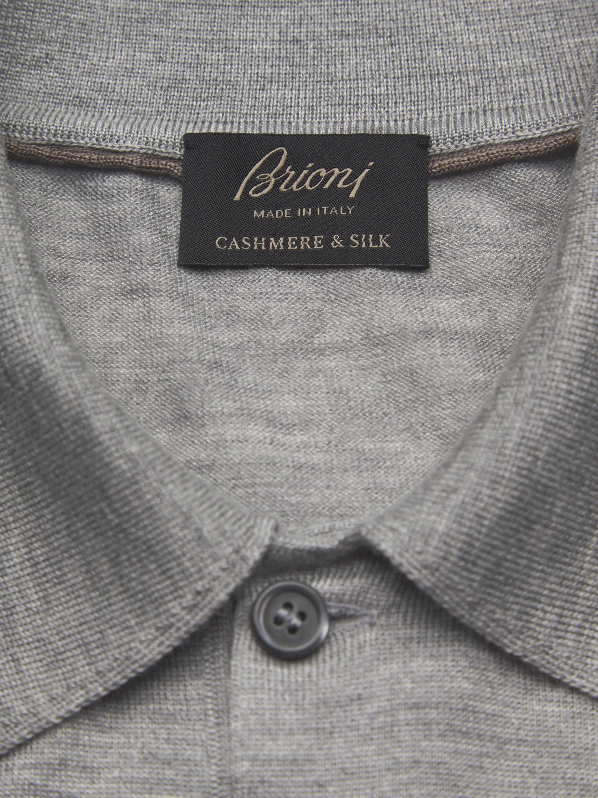 “,”features”:”Regular fit Brioni metal detail nPiping on collarnMother of pearl buttons nGauge: 18 GG