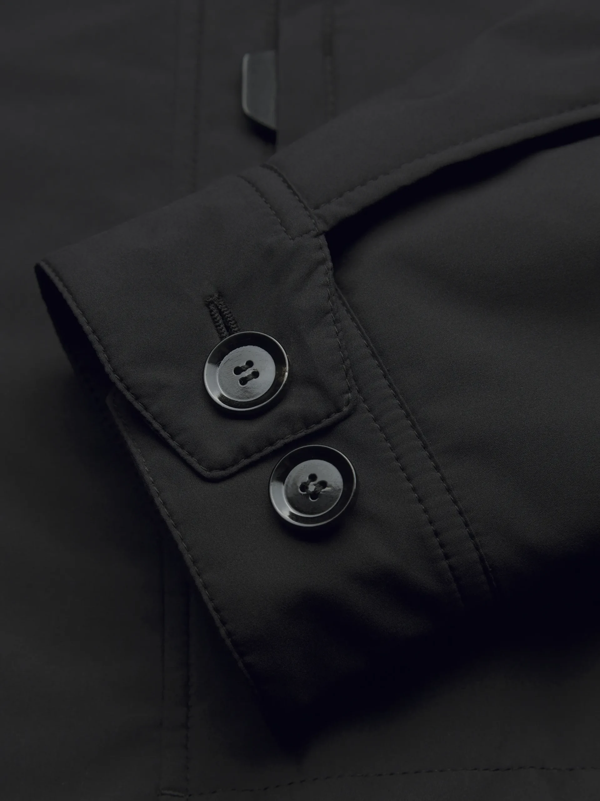 Essential midnight blue Performa field jacket, featuring a standing collar with bevelled lunette shape, dual zip and snaps closure with metal zip puller, two double-entry side pockets and elasticated waist drawcord. This garment contains GRS polyester. The Global Recycled Standard (GRS) is an voluntary, full product standard obtained by verification through independent third-parties. Practices include requirements for recycled content, social and environmental practices, and chemical restrictions.