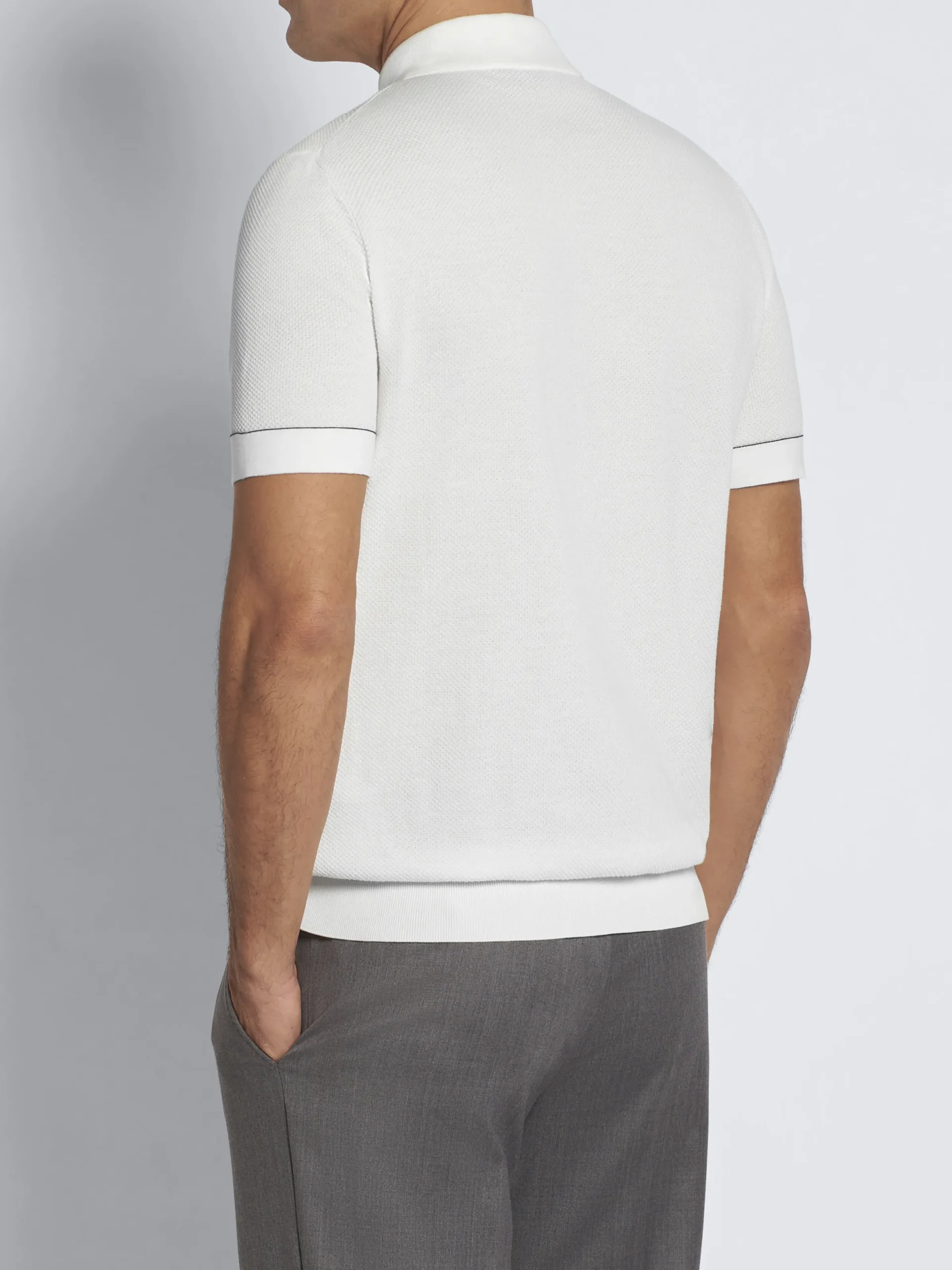 Essential white short-sleeved polo, knitted in Sea Island cotton. The piqué texture gives a sporty feel with the blue contrast stripe detail offering a touch of modernity. It features a regular fit and mother of pearl buttons.nSea Island is one of the finest and most sought-after cottons in the world. Grown in limited quantities in the Caribbean, it is renowned for its long staple fibres which allow for a stronger, more resilient yarn, and result in an incredible hand feel, silky to the touch and smooth on the skin.