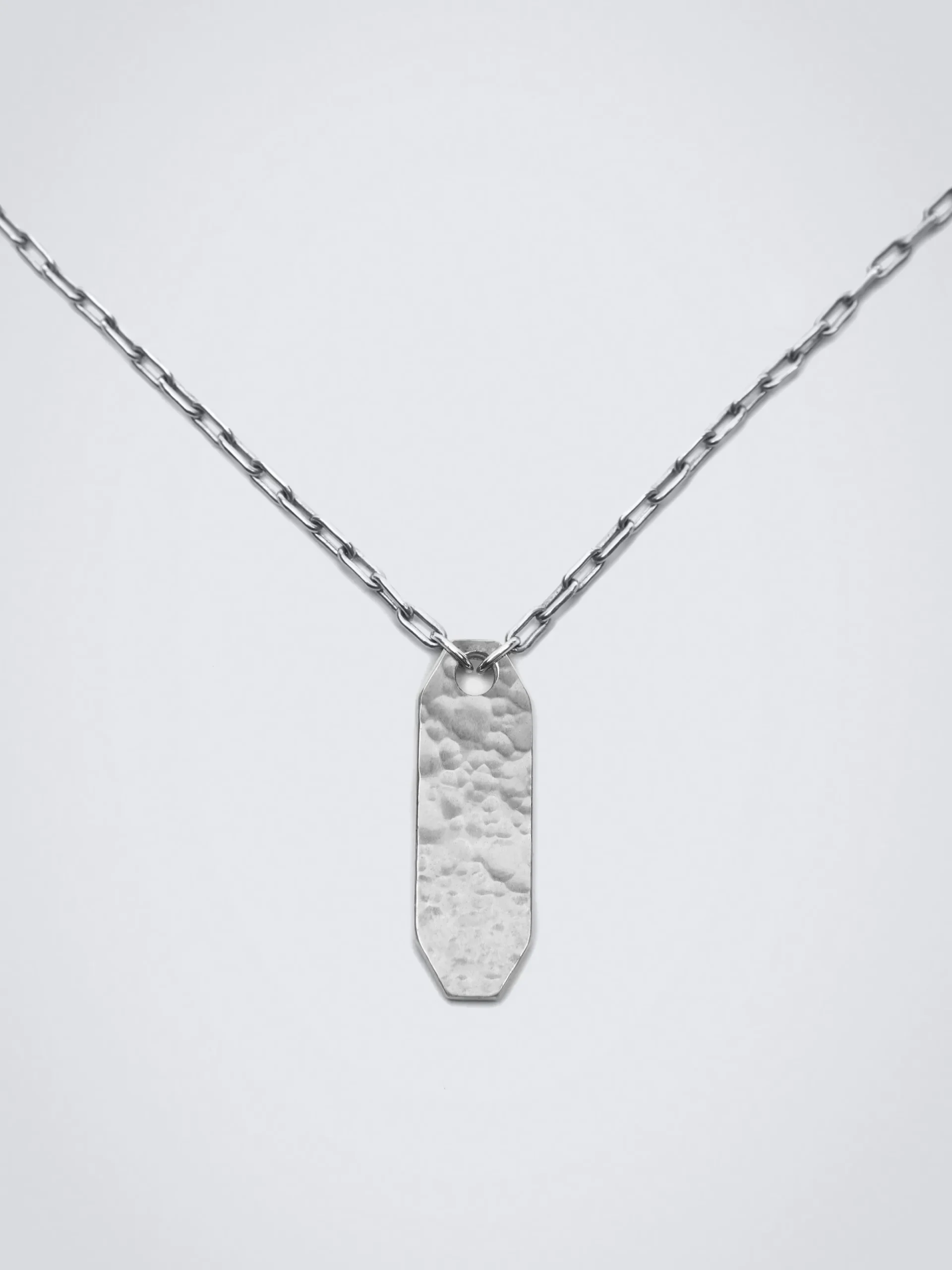 Crafted from 100% silver with hand hammered placket pendant, in our iconic octagon shape. Pure and clean design for a sophisticated touch of personal luxury. What makes ‘martellato’ so special: Our jewellery artisan handcrafts each piece with relief patterns, which allow each facet to catch the light in a fascinating way. The artisan hammers the silver from the centre in concentric circles towards the outside.