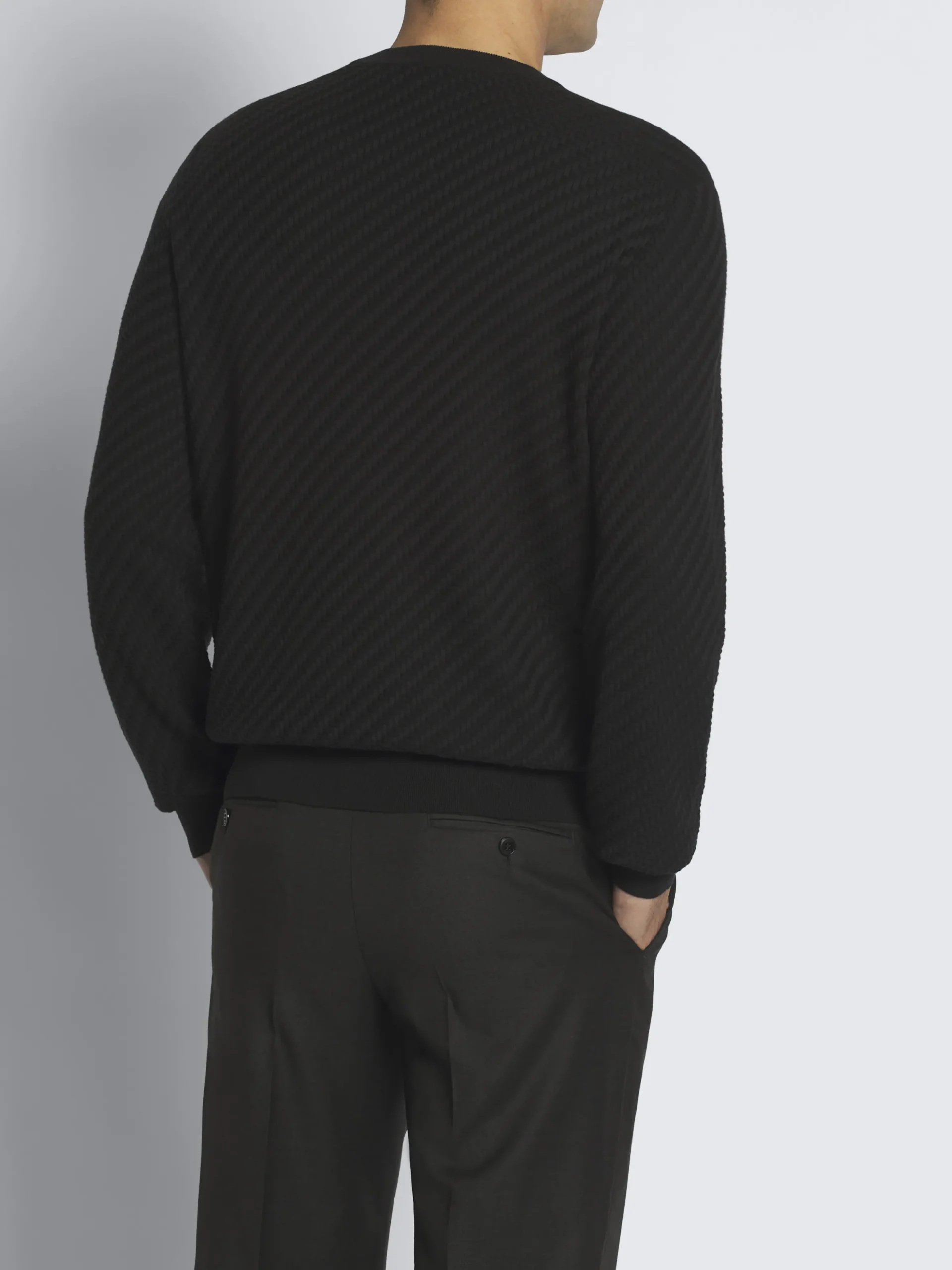 Black crewneck sweater with long sleeves in organic cotton, silk and cashmere. Its soft hand feel and comfortable fit make it perfect to be worn year-round and it matches perfectly with formal and semi-formal attire.nThe Trama weave features tone-on-tone ribs for a uniquely subtle, tactile feeling. This pattern mimics the San Pietrini, the cobbled stones characterizing the streets of Rome. An iconic motif drawn from the eternal city itself. This garment contains GOTS certified cotton. The Global Organic Textile Standard (GOTS) is a voluntary standard obtained by verification through independent third-parties. Practices include requirements on environmental management and wastewater; protection of health, safety and rights of employees; avoidance of hazardous substances.