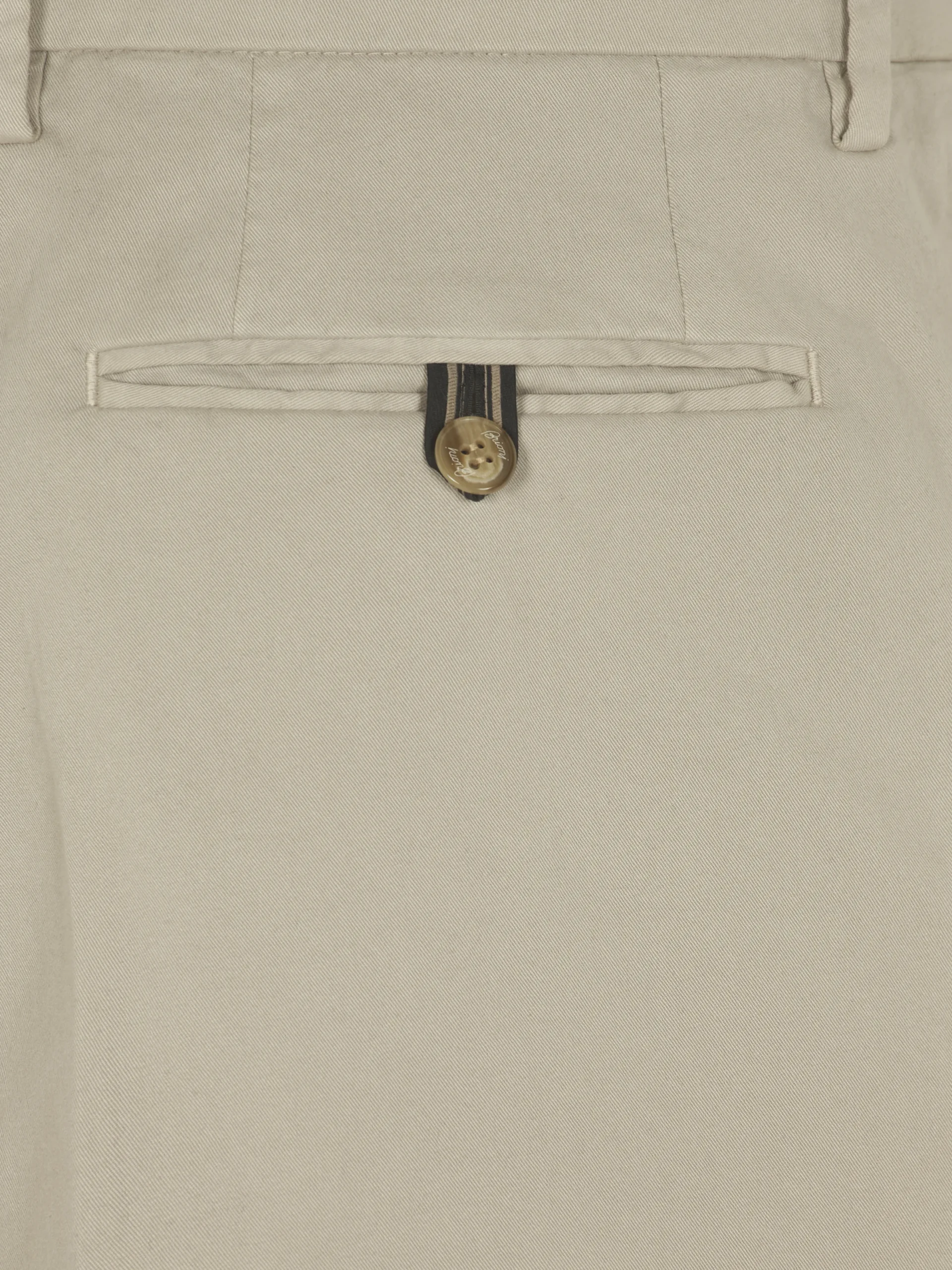 Beige organic stretch cotton Pienza trousers. Featuring a zip fly closure, single open pleats, two side slant pockets, two back pockets with button closure and regimental loop detail and belt loops. Ultra-versatile, these trousers are perfect paired with sneakers, suede loafers or even a derby for an effortlessly refined aesthetic.nThis garment contains GOTS certified cotton. The Global Organic Textile Standard (GOTS) is a voluntary standard obtained by verification through independent third-parties. Practices include requirements on environmental management and wastewater; protection of health, safety and rights of employees; avoidance of hazardous substances.