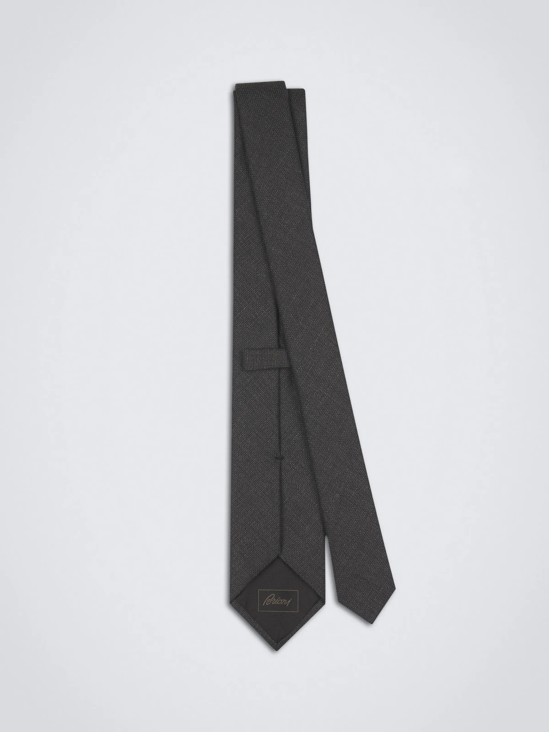 Charcoal grey Super 150’s structured responsible wool tie. Brioni ties are the epitome of elegance, handmade from the finest materials. This piece in perfect to pair with a white crisp shirt and a formal jacket for a refined, chic and modern look.nnThis garment contains RWS wool. The Responsible Wool Standard (RWS) is a voluntary standard obtained by verification through independent third-parties. RWS farmers and ranchers are evaluated against animal welfare, land management, and social requirements set in the standard.