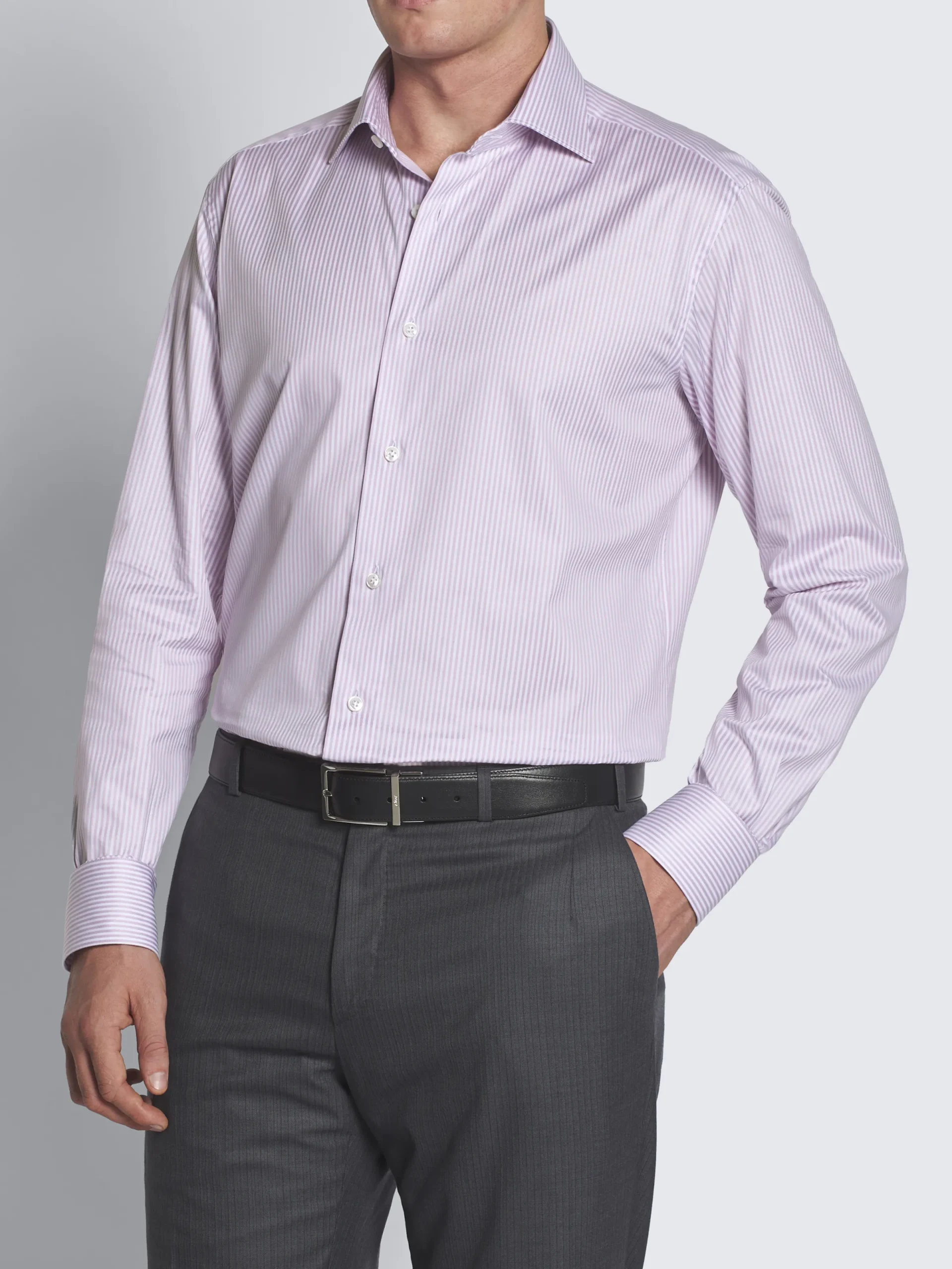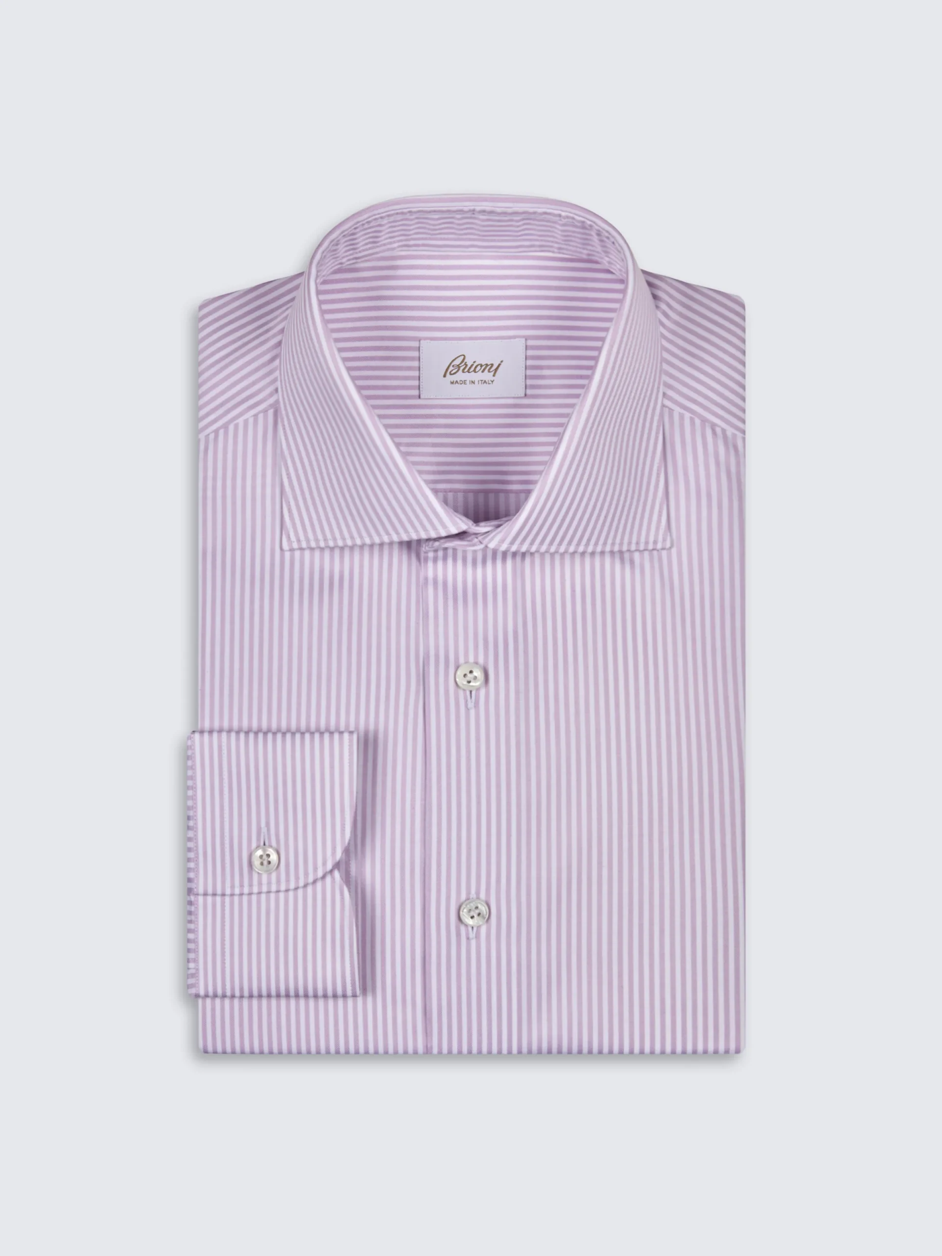 White and pink striped organic cotton formal shirt. Featuring a regular fit, rounded cuffs, mother of pearl buttons and without front placket. Sleek and sophisticated, it is perfect to be worn with a tie. A true wardrobe staple.nThis garment contains GOTS certified cotton. The Global Organic Textile Standard (GOTS) is a voluntary standard obtained by verification through independent third-parties. Practices include requirements on environmental management and wastewater; protection of health, safety and rights of employees; avoidance of hazardous substances.