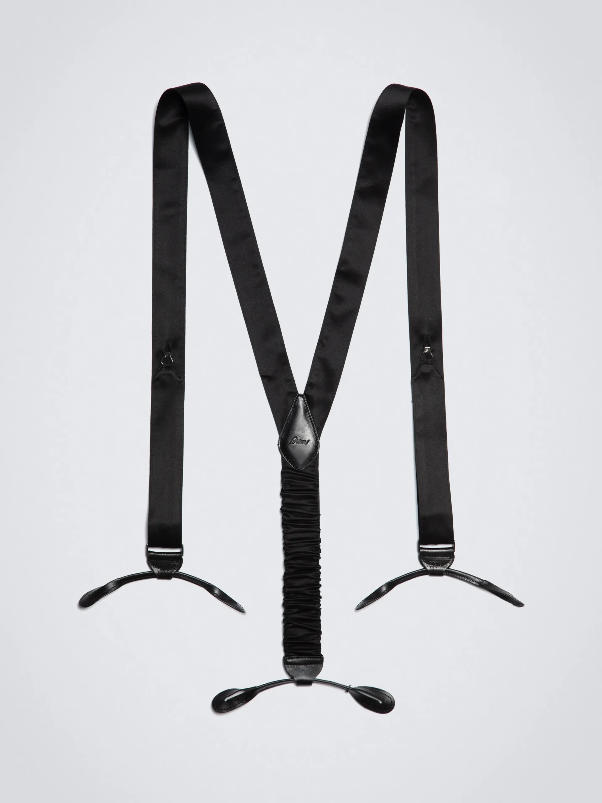 Essential black adjustable suspenders in satin silk. This elegant accessory is perfect in combination with a classic tuxedo.