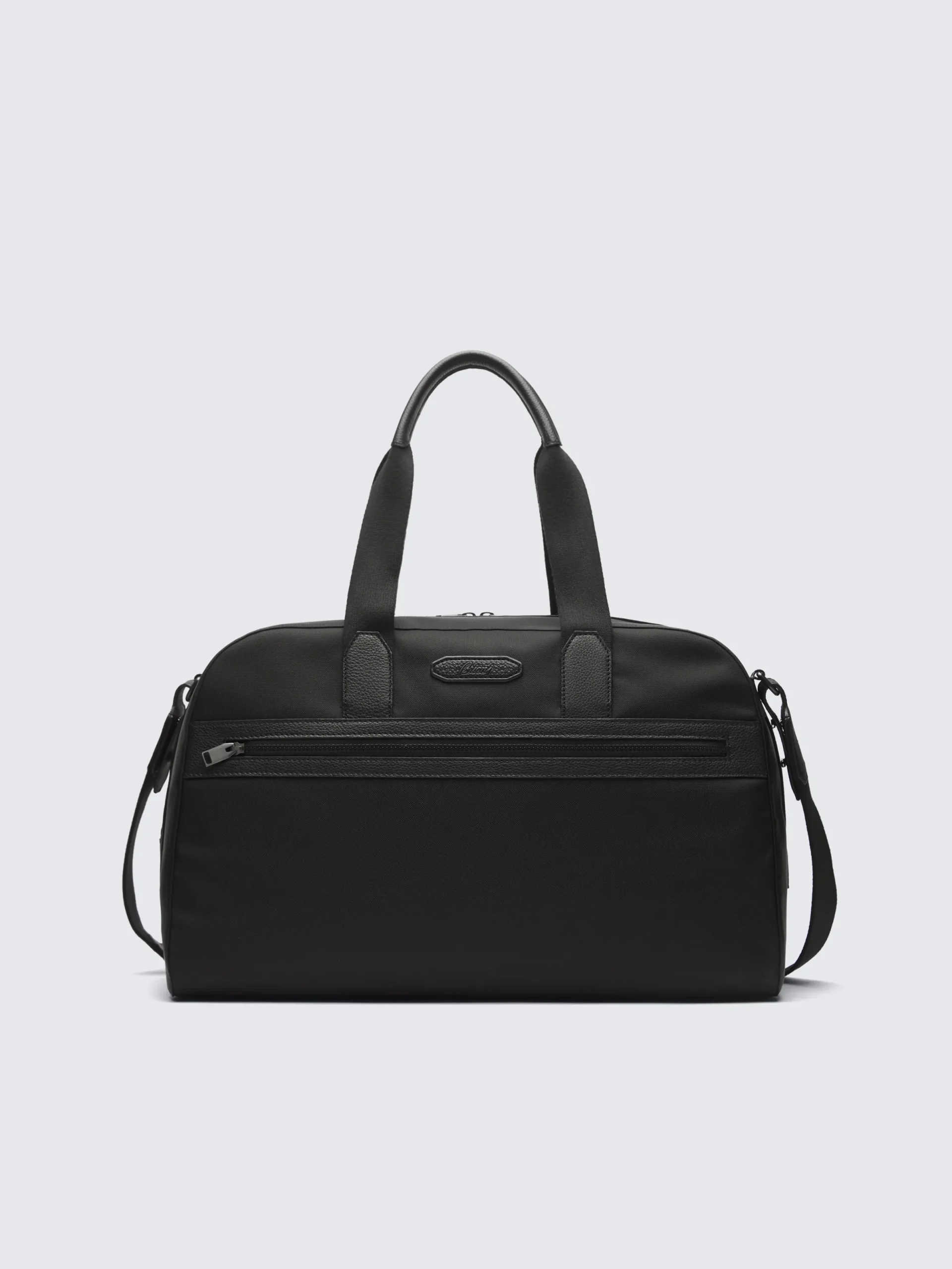 Black nylon and grained leather travel tote, with two top handles and a detachable and adjustable shoulder strap, which makes this accessory wearable also across the body. Featuring two flap-pockets with leather closure detail on the front, leather logo and double-zip closure pocket on the back for additional practicality, this is the perfect accessory to travel in style.