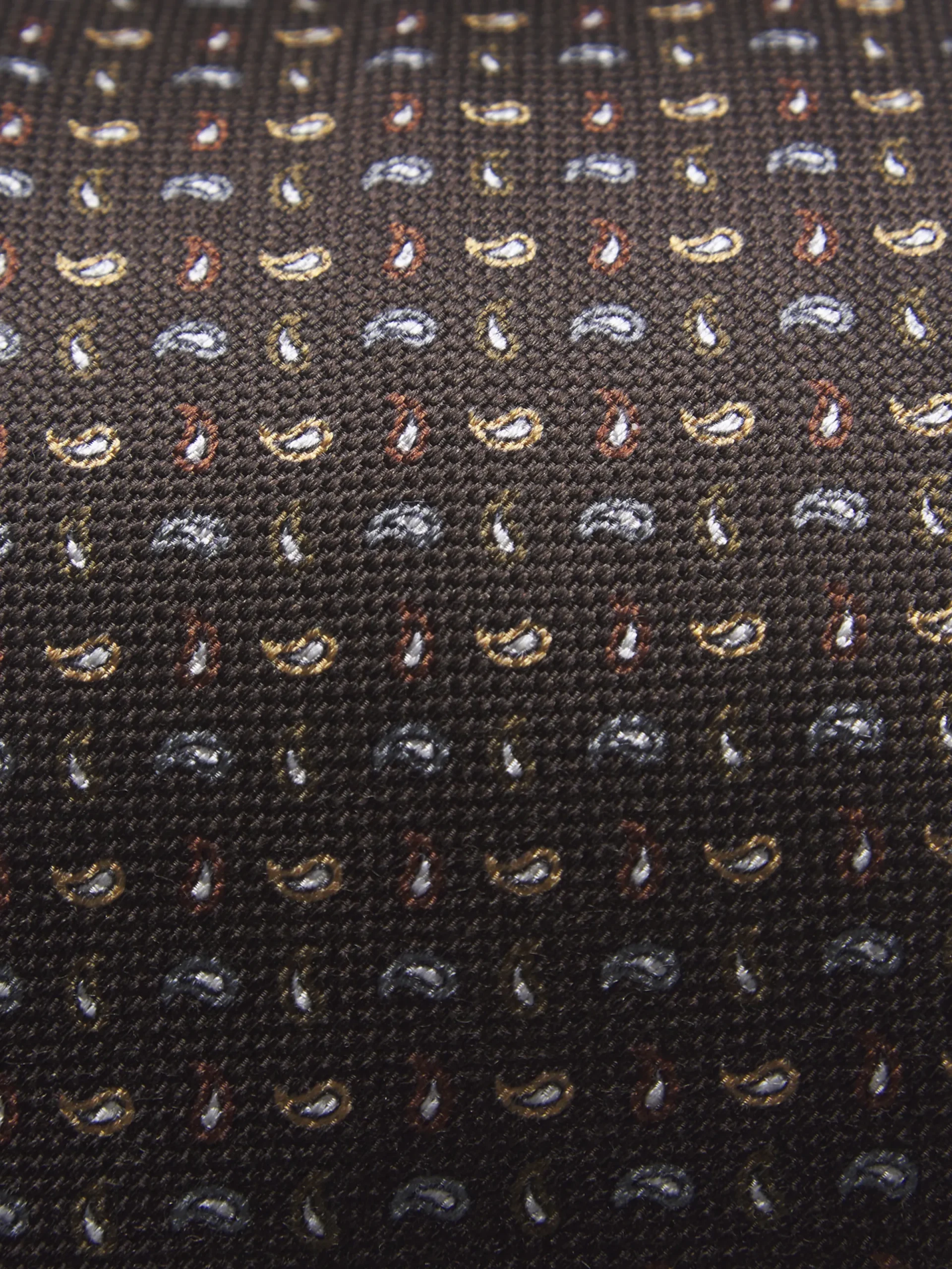Silk brown tie with printed paisley motif, entirely handcrafted in Italy. The high quality of this fabric allows for a printing with brighter colours and smoother texture. Its subtle sheen add a refined elegance to your business wardrobe with the matching pochette to complete the look.