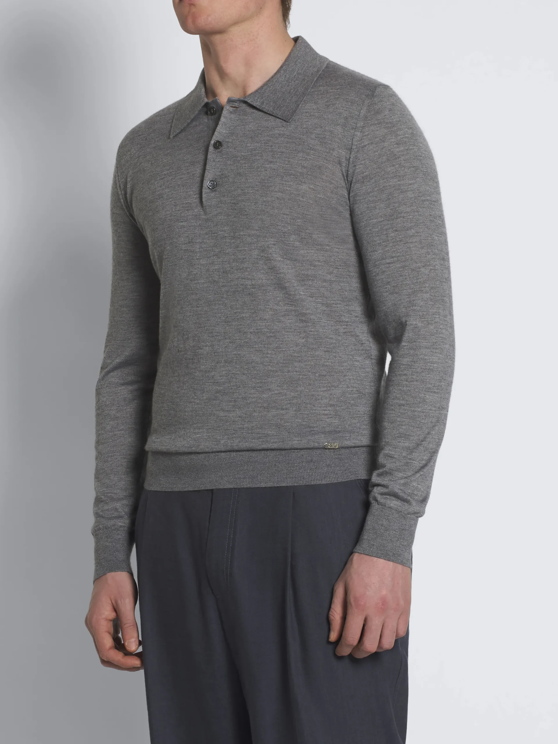Grey cashmere and silk long-sleeved polo. Featuring a regular fit, light ribs effect on hem and cuffs, mother of pearl buttons, branded metal detail on the bottom, and an inside piping on collar. This versatile garment is a timeless classic for your everyday wardrobe.