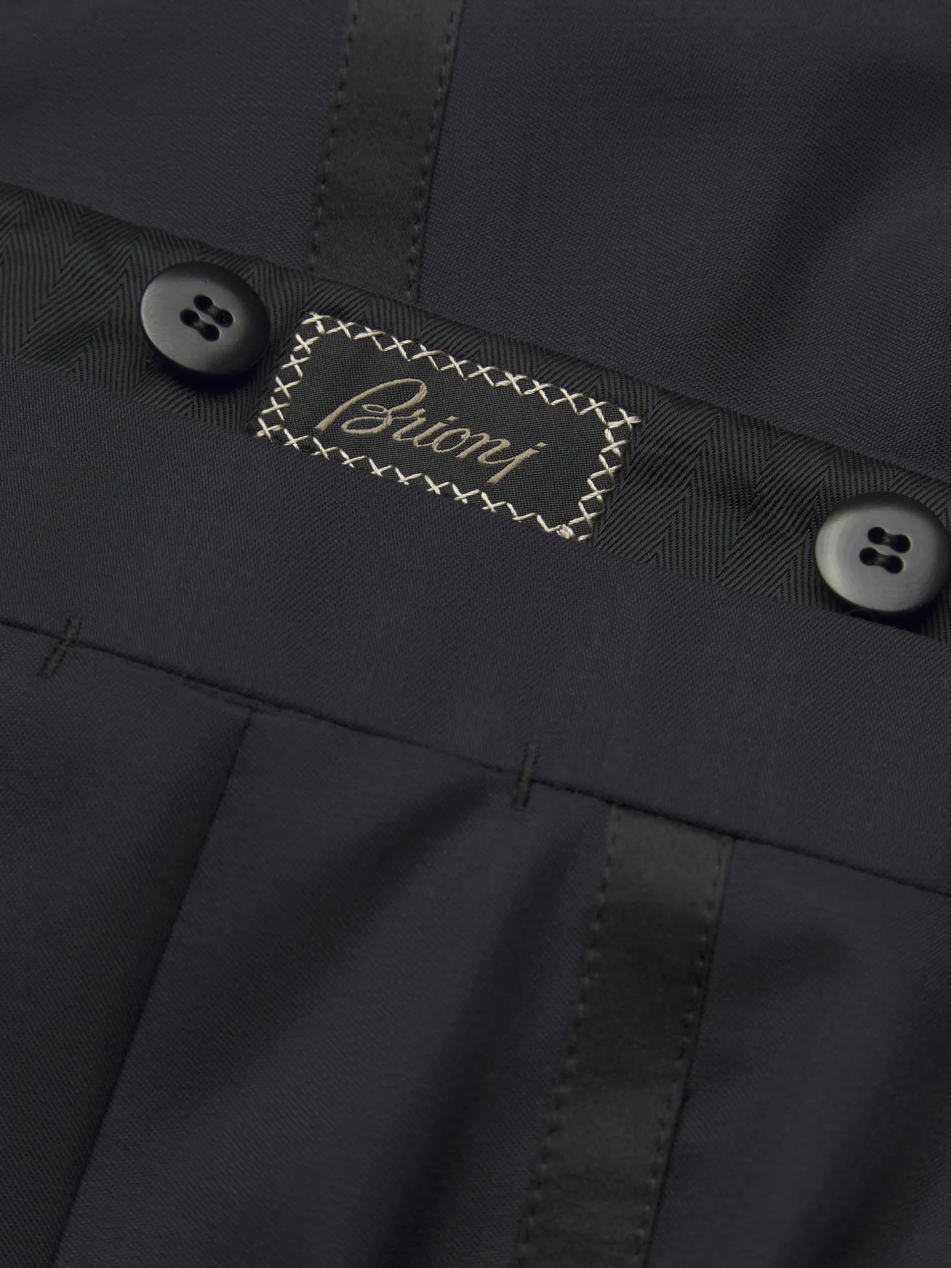 This traditional midnight blue Policleto tuxedo in Super 160’s wool is part of the Brioni Essential Wardrobe. The two button single-breasted jacket features classic satin peaked lapels, while the matching regular trousers features side bands and are internally lined at waist for increased comfort and wearability.