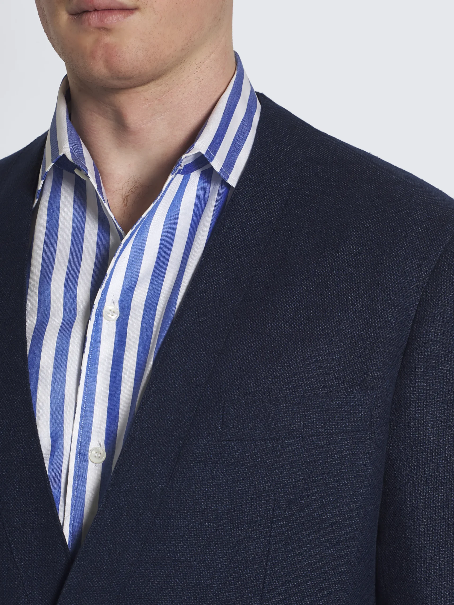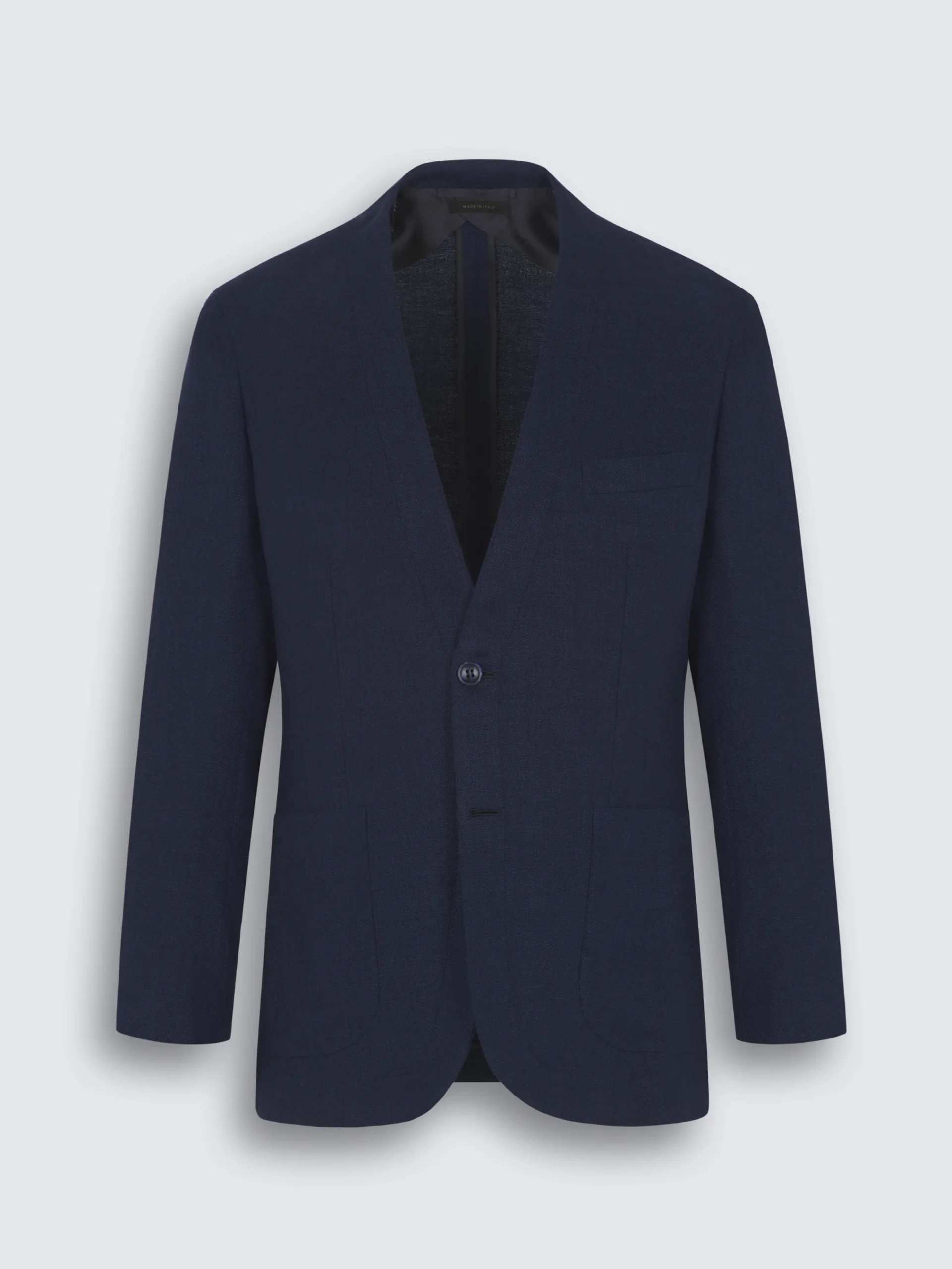“,”features”:”No lapelsnUnlinednBlue horn buttonsnOne chest pocketnOne internal pocket with loop and nbutton closurenTwo front patch pocketsnTwo back ventsnTopstitching on collar, pockets and edgesnLength: 75 cm measured on a size 50