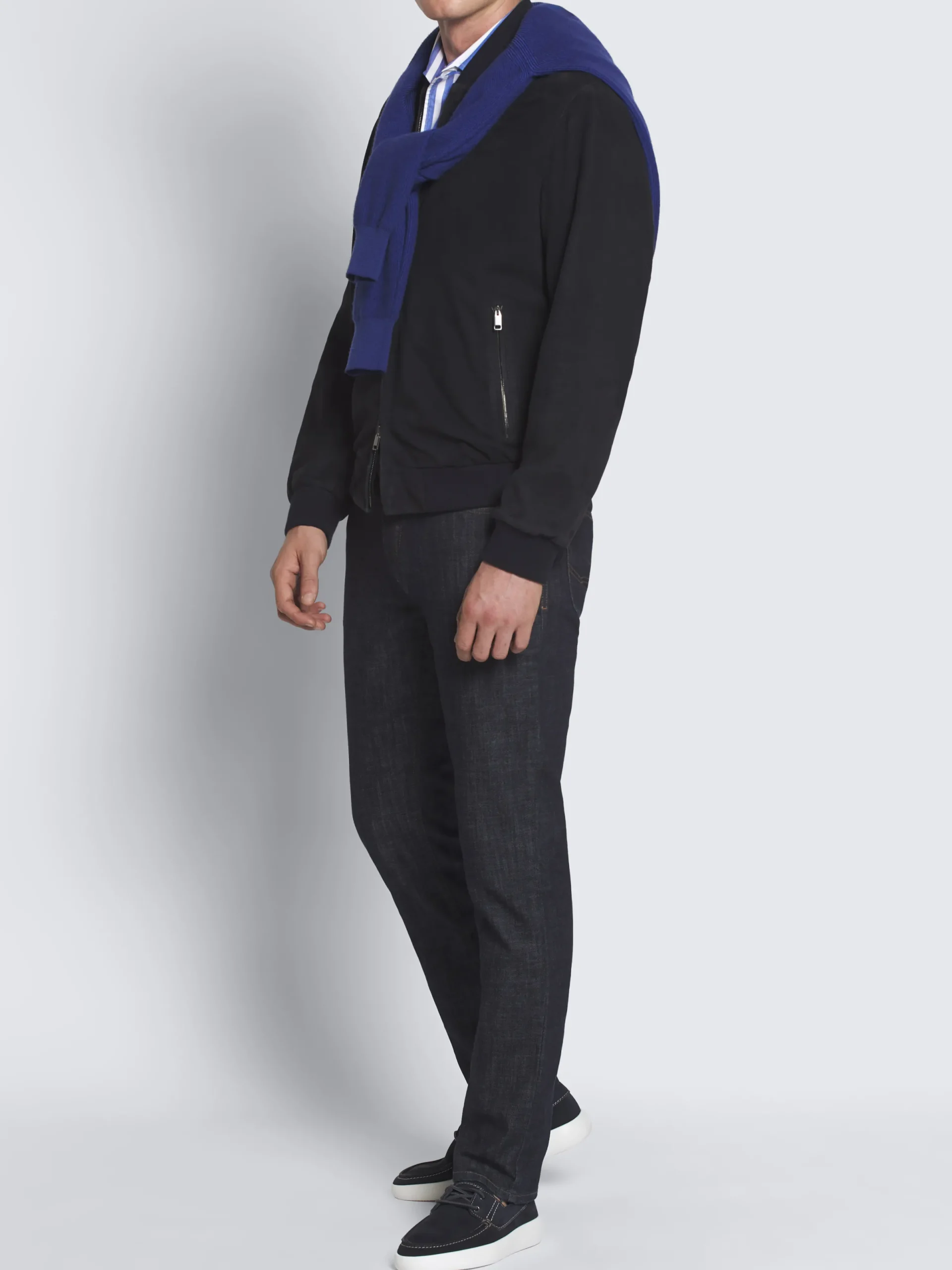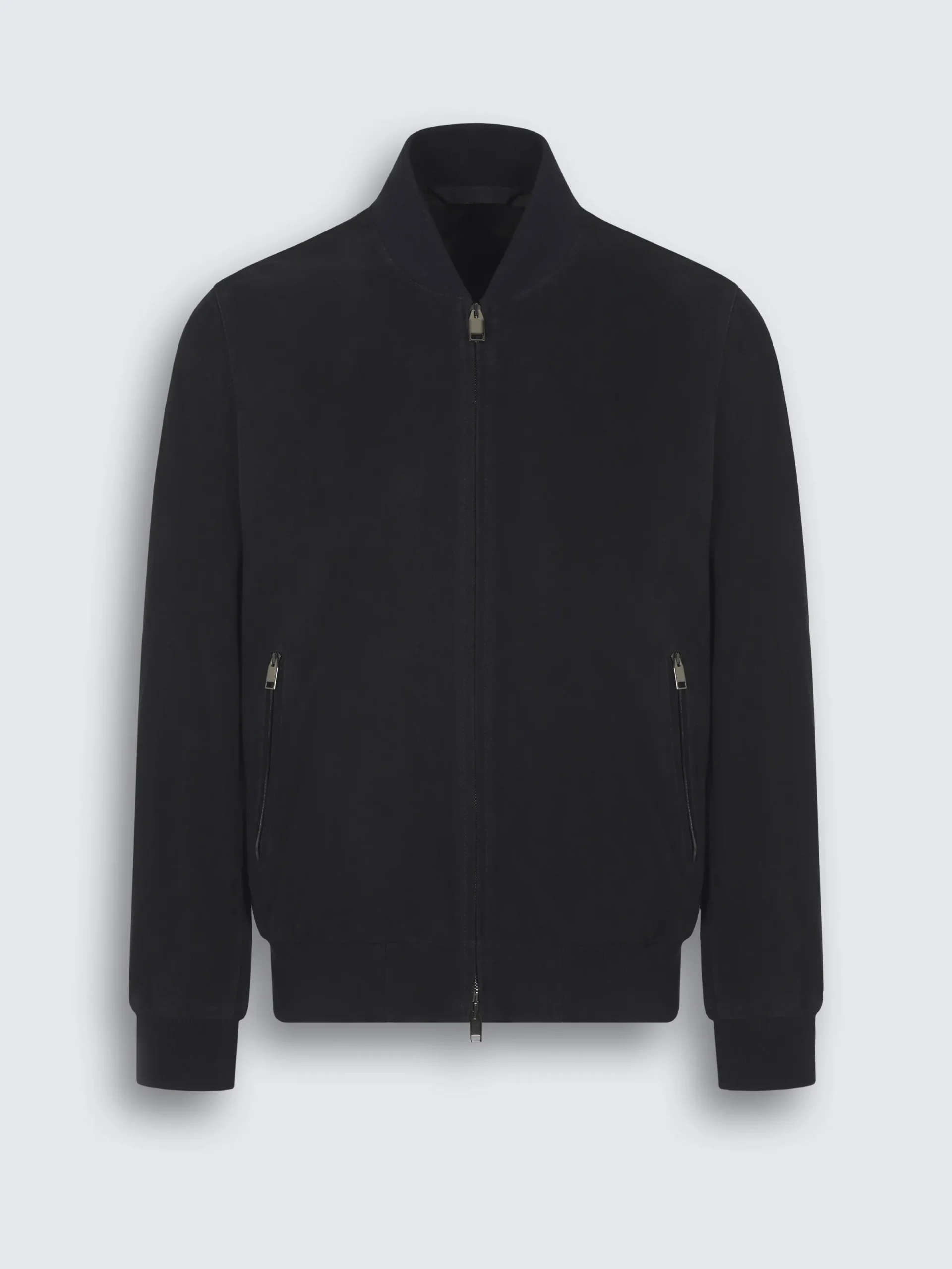 Navy blue perforated suede bomber. Featuring a dual zip with metal pullers front closure, two side vertical pockets with raw edge finishing and zip closure, and two internal vertical pockets along the lining. Finished with cotton knit ribs on the bomber collar, cuffs and hem, and half-lined in cupro twill, this final layer will be a refined modern addition to your relaxed days rotation.