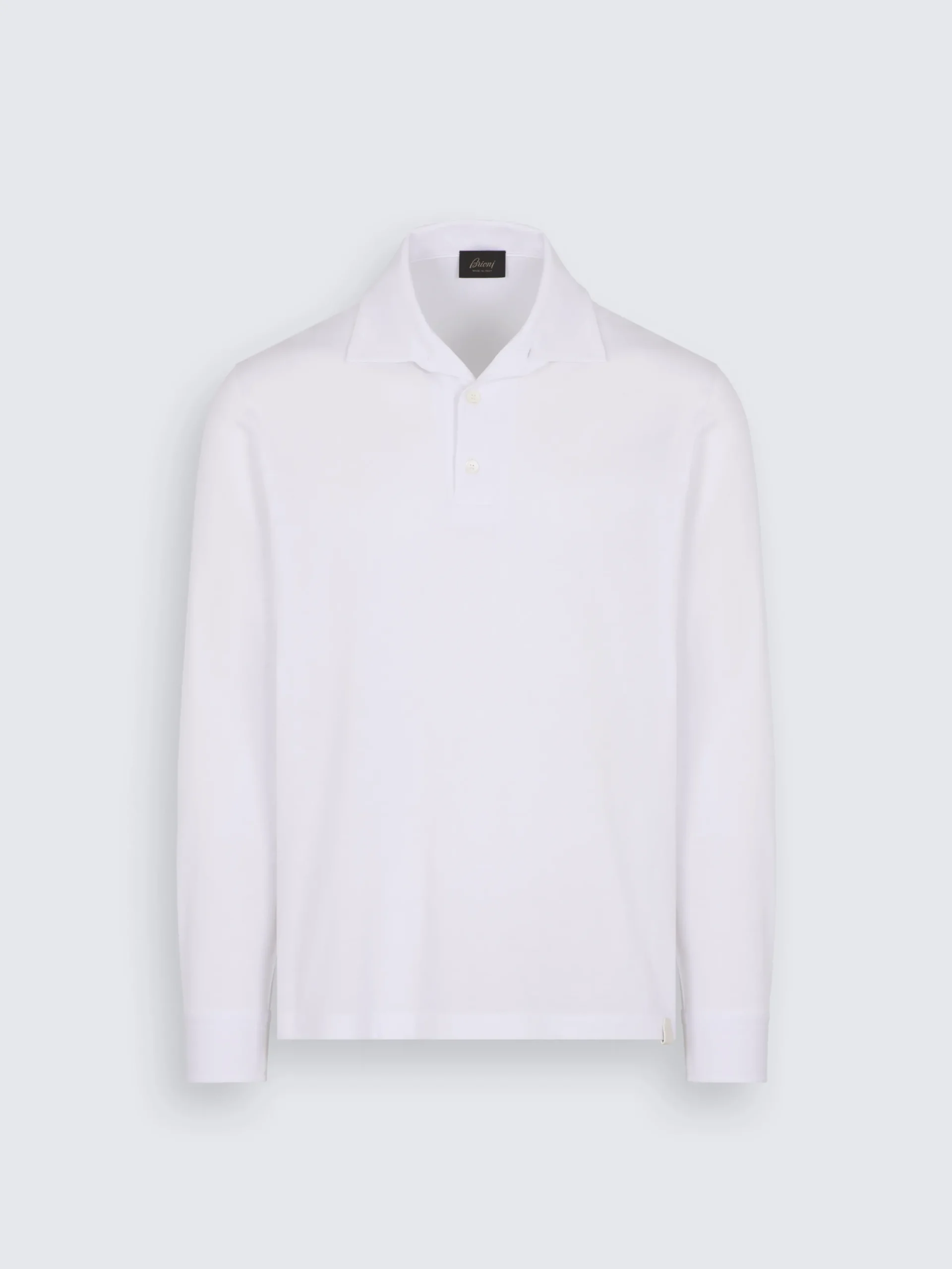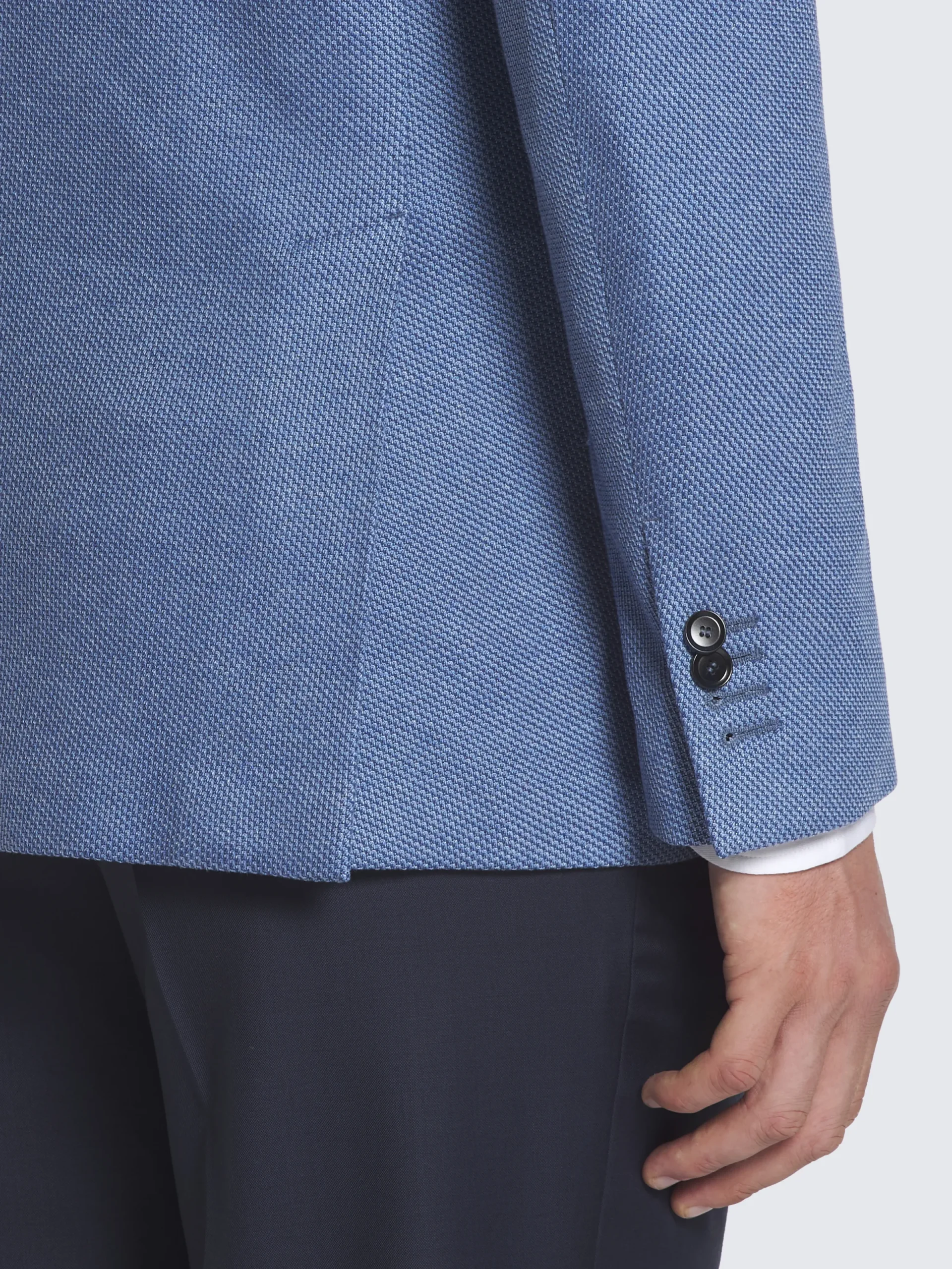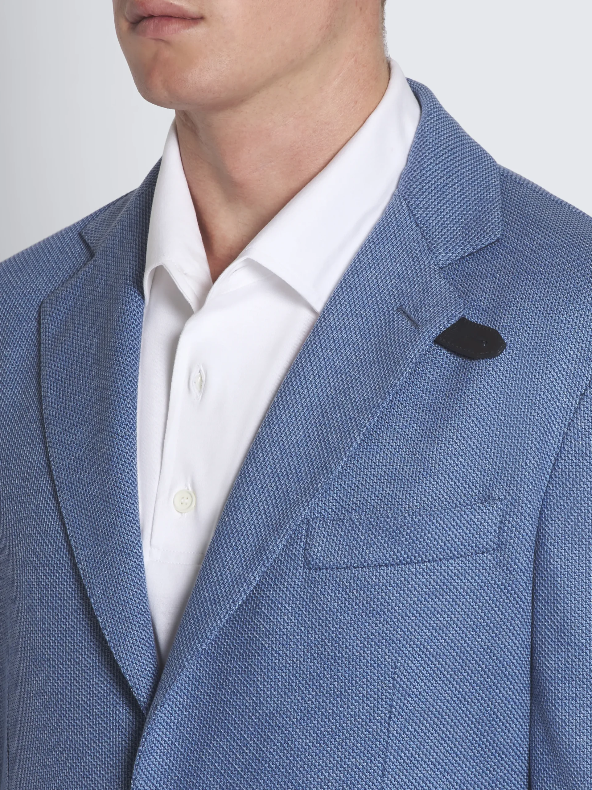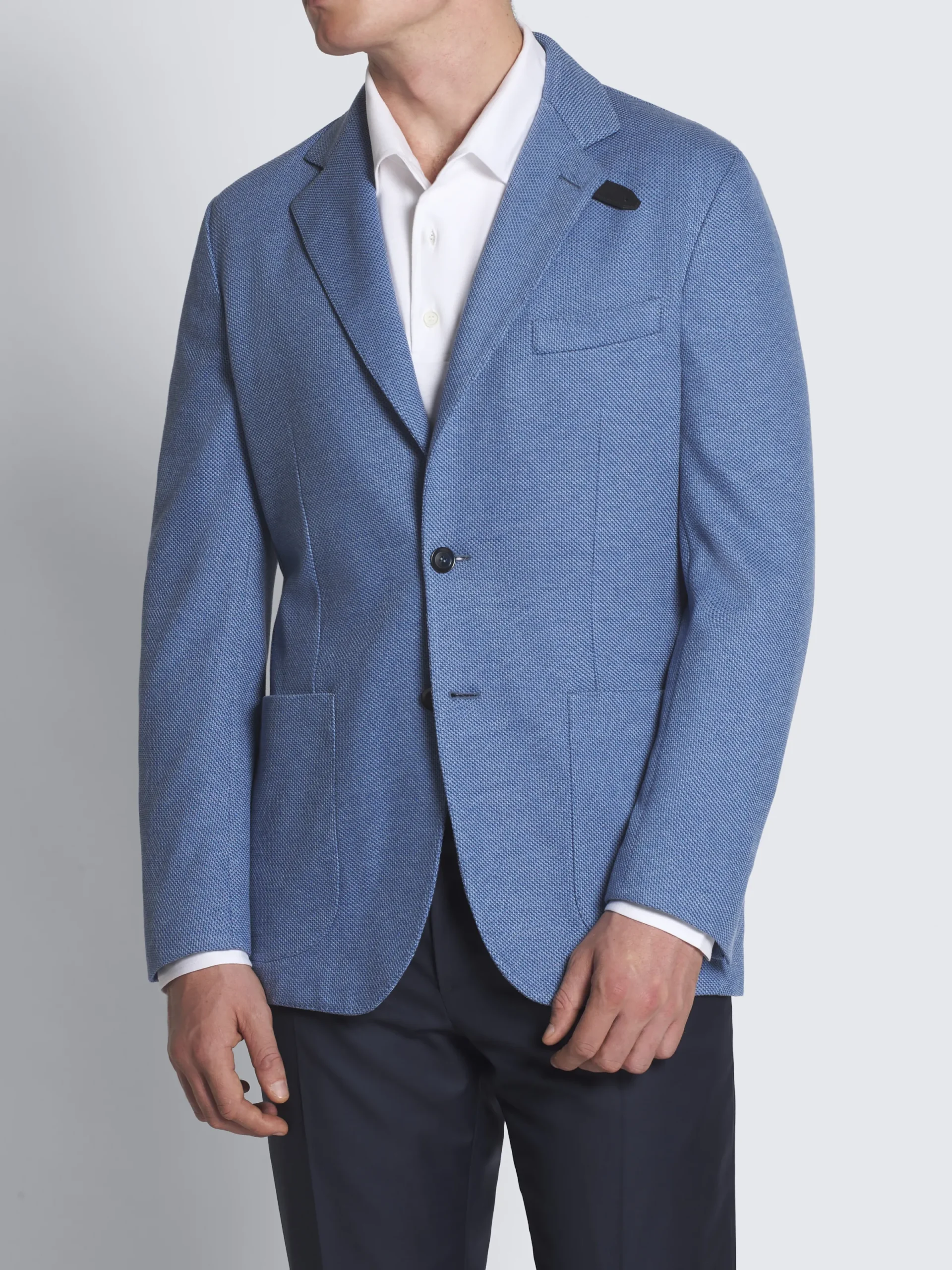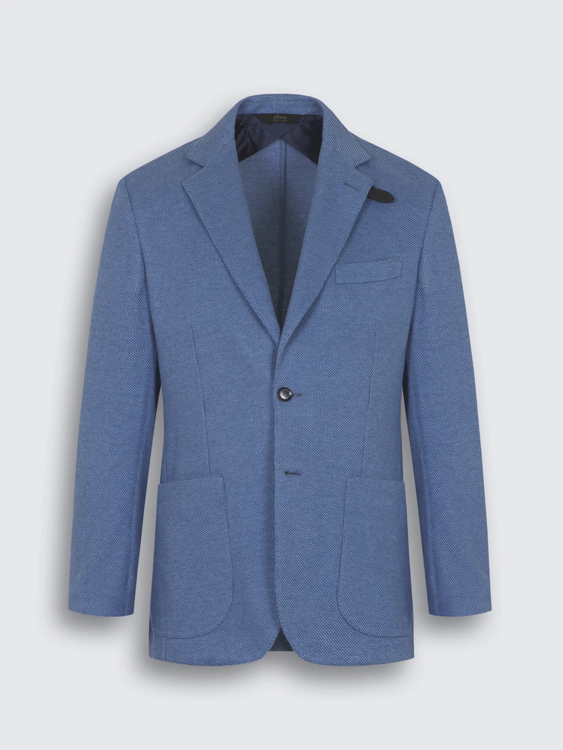 Sky blue silk and cotton jersey blazer. Featuring notch lapels with a leather tab, blue horn buttons front closure, openable sleeves buttons, two front patch pockets, one chest pocket, and one internal pocket with button closure and regimental detail. On the back, it presents two vents with Brioni logo tape between them. Deconstructed and unlined, it is a comfortable piece to layer over a T-shirt or leisure shirt to add an elegant touch to casual attires.
