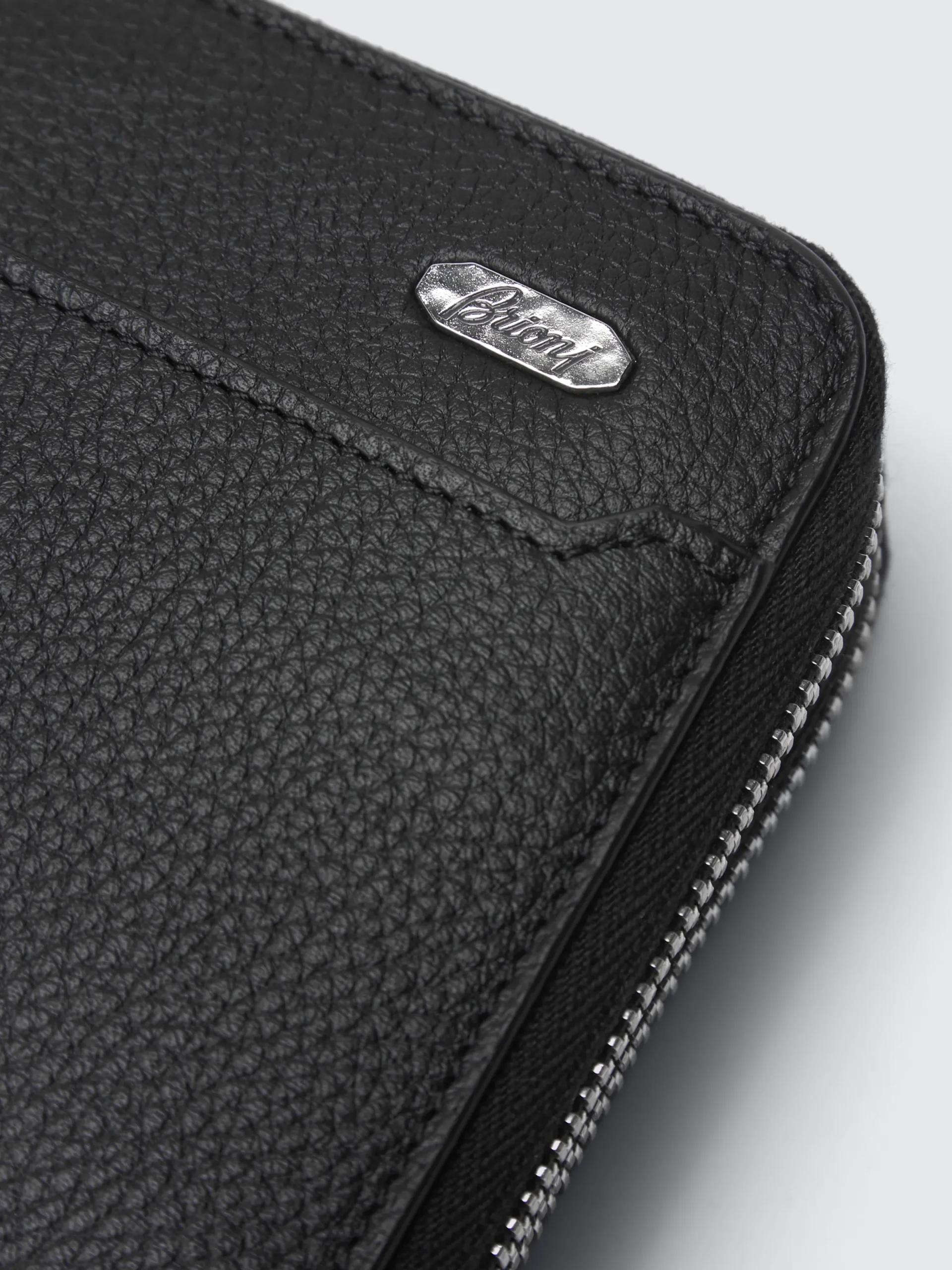 Black double zip wallet in scratch-resistant grained leather. The iconic octagonal Brioni logo is fully integrated into the leather, making it smooth to slide into a pocket. A compact and light accessory for everyday use or for travel. A touch of personal luxury or ideal for gifting. This piece is scratch-resistant: Designed to last, the treatment of this exceptionally fine leather ensures that it ages beautifully over time.