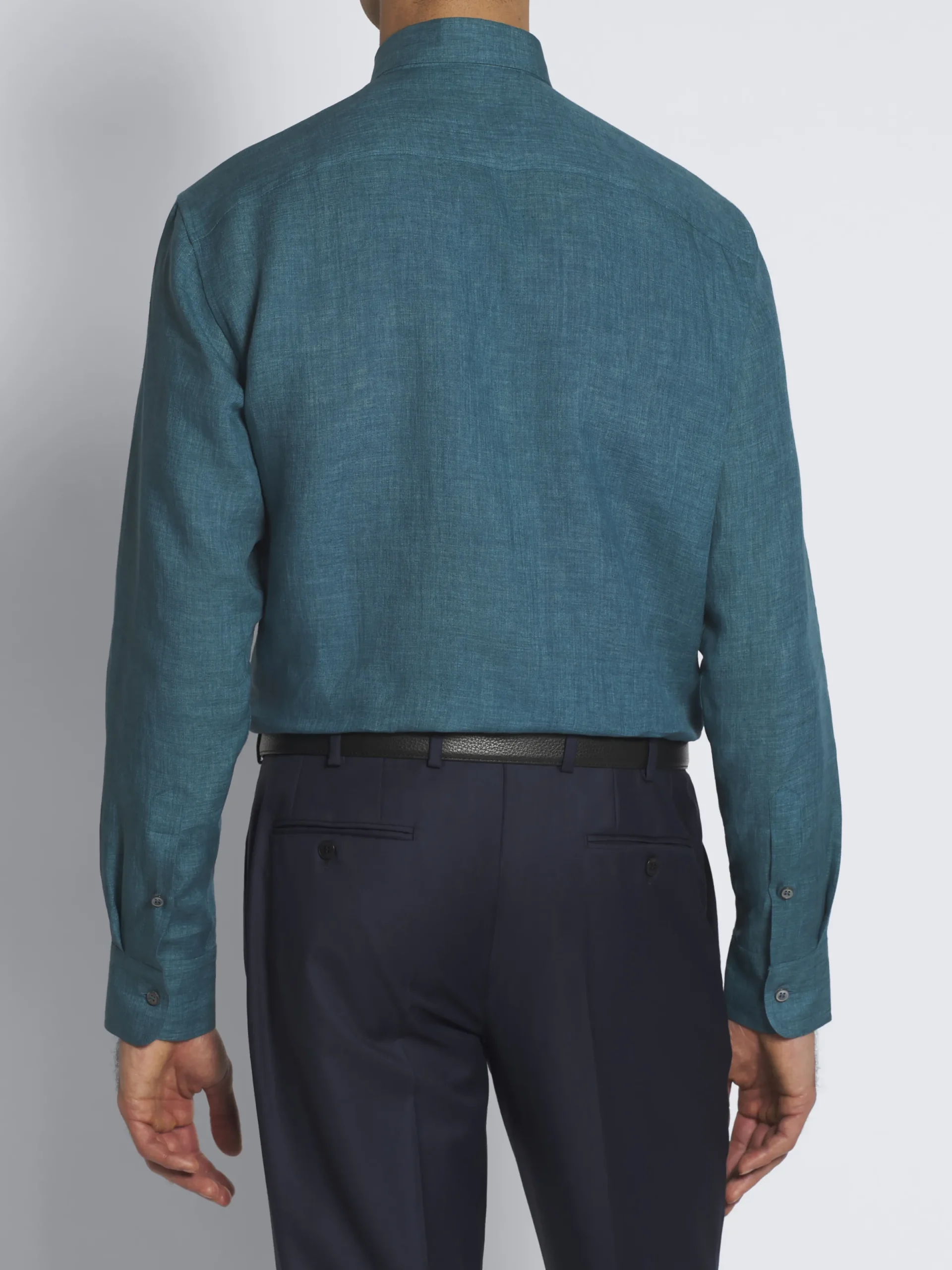 Teal green linen hidden button-down shirt. Featuring a regular fit, hidden button-down collar, rounded cuffs, and internal regimental detail. Without darts, it is the perfect combination of comfort and elegance.
