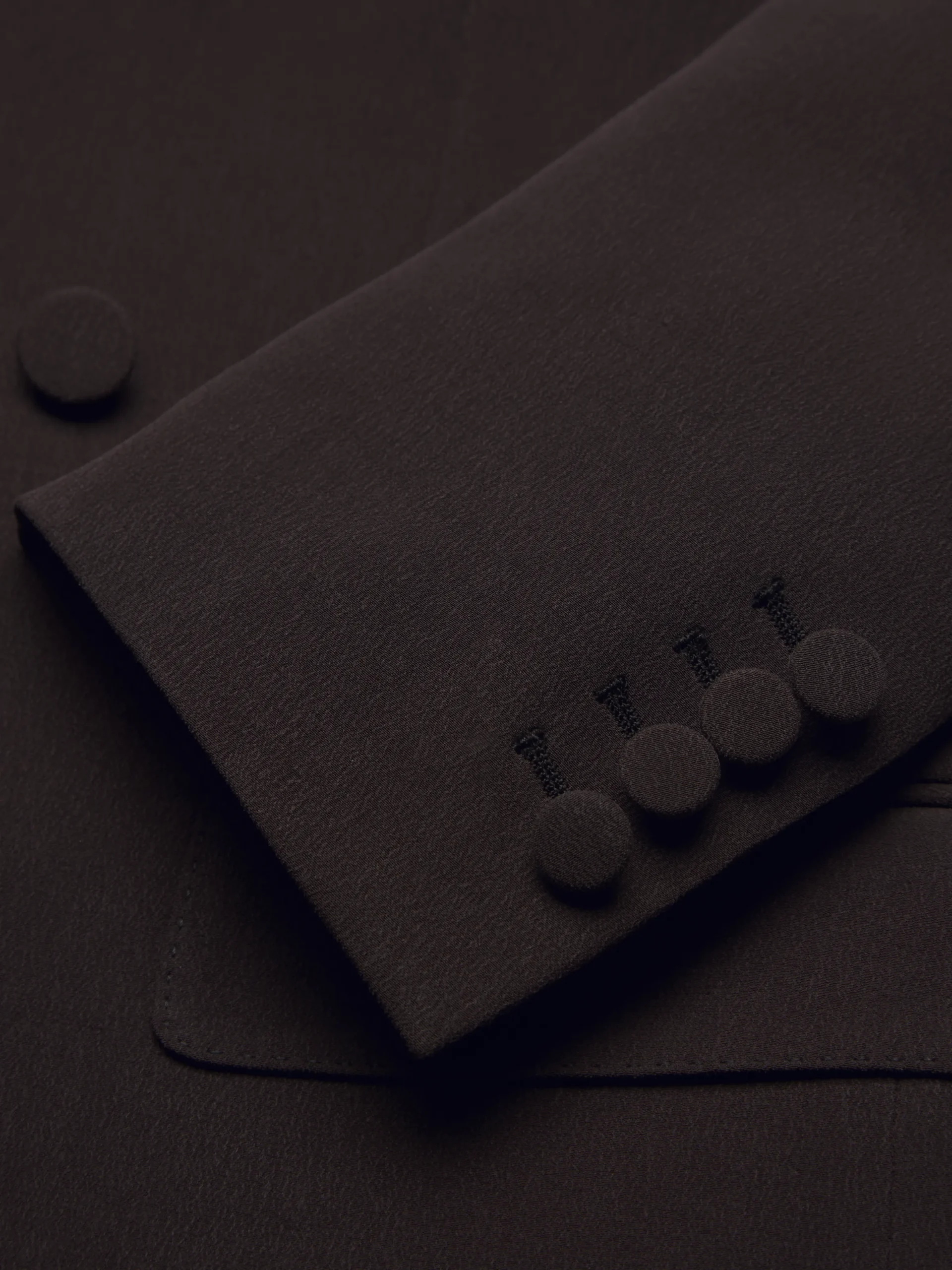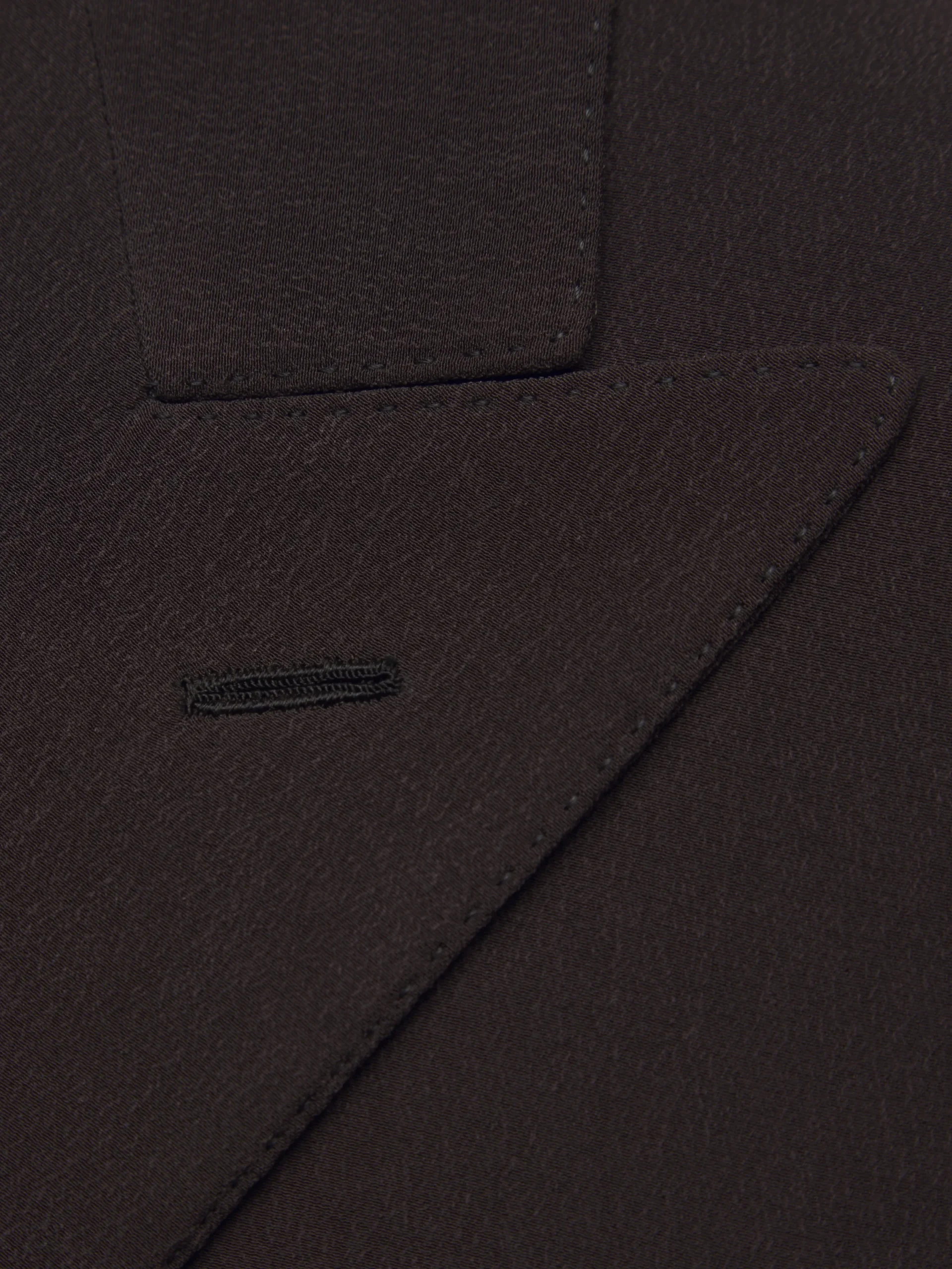 Dark brown silk cady Virgilio jacket. Featuring a regular fit, peak lapels with a buttonhole, mother of pearl buttons, one chest pockets, two front flap pockets and two back vents. Finished with AMF stitching on lapels, collar and front closure. The clean lines of this double-breasted and fully lined jacket make it a timeless piece for classic formal looks.