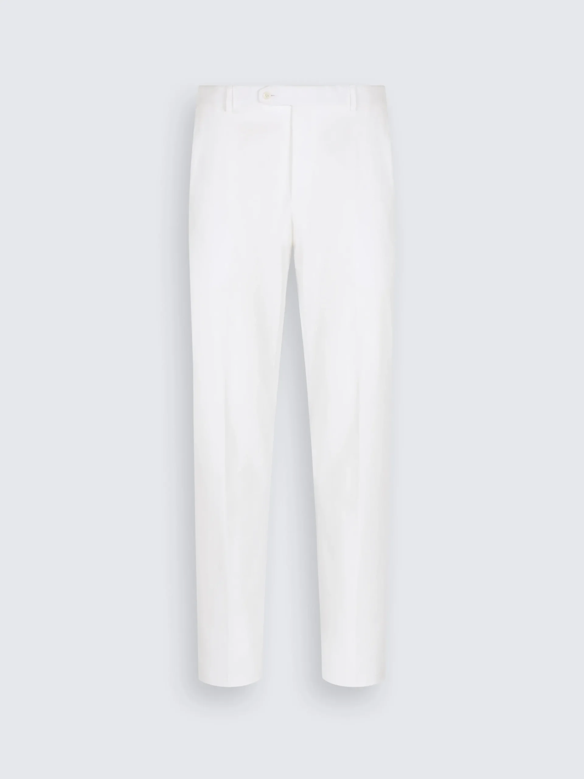 White stretch cotton gabardine Journey trousers. Featuring a zip fly and metal hook front closure, extended bevelled end waistband with button closure, two side slant pockets with topstitching detail, two back jet pockets with loop and button closure with a regimental detail, and belt loops. Thought to be the perfect travel companion for every businessman, these trousers will provide you with uncompelling comfort and great body adaptability thanks to a special construction with self-regulating elasticated waist band. This garment, perfect on and off the field, is part of our Golf Capsule.
